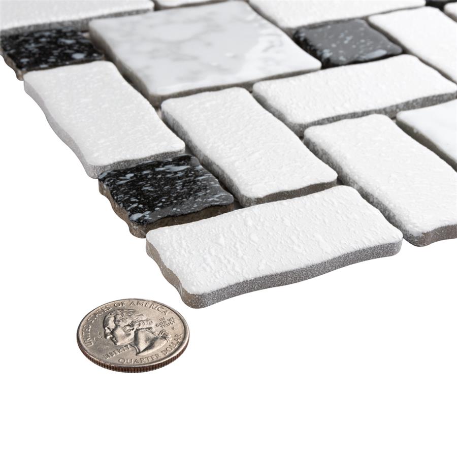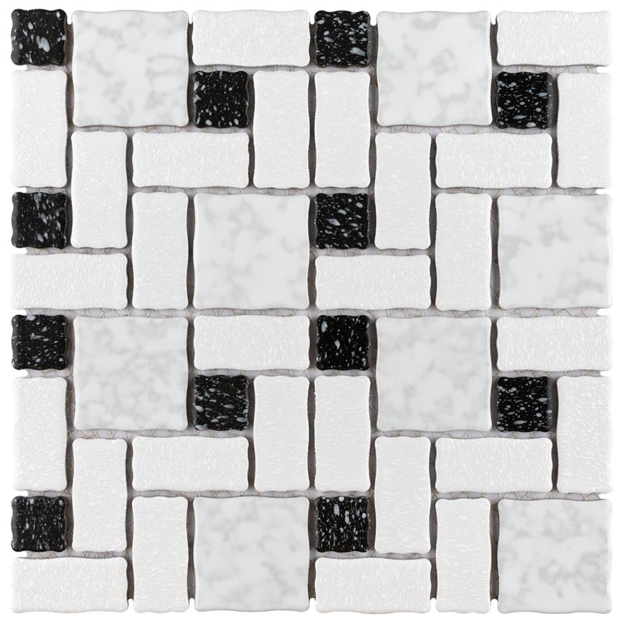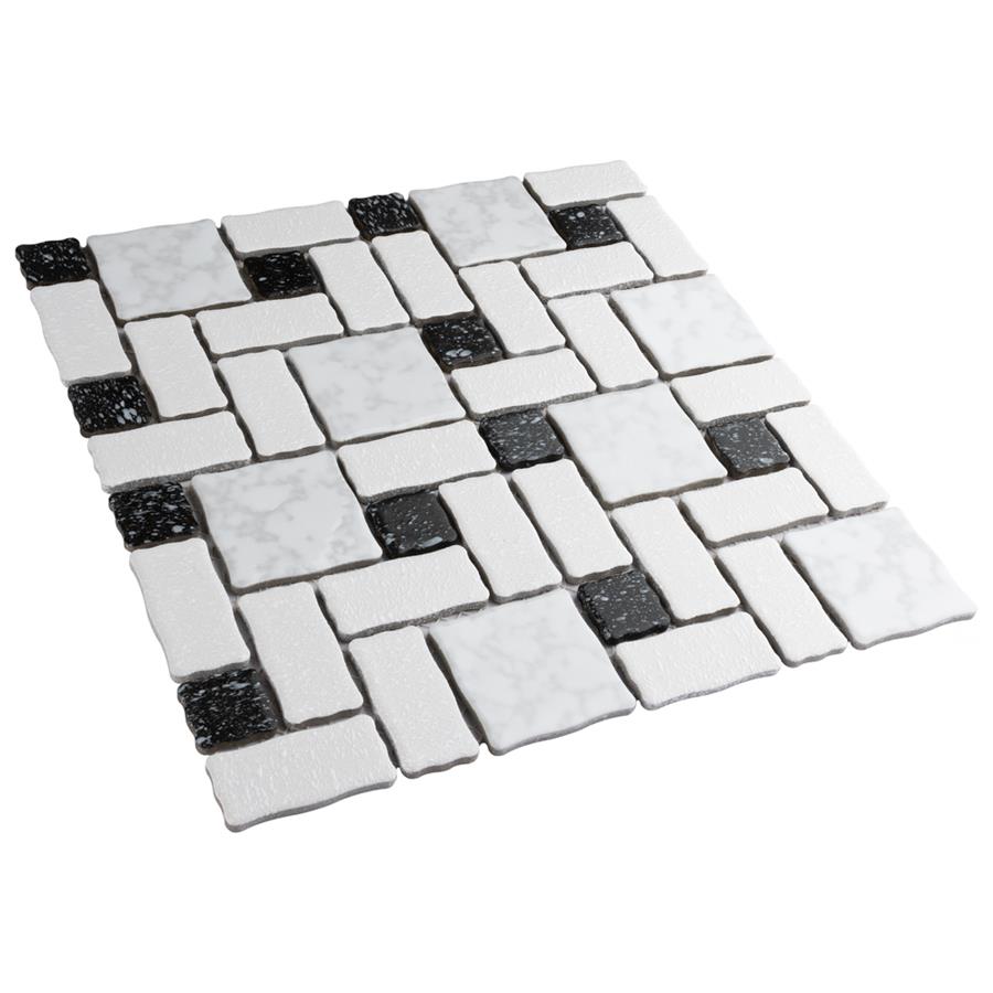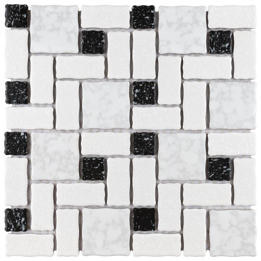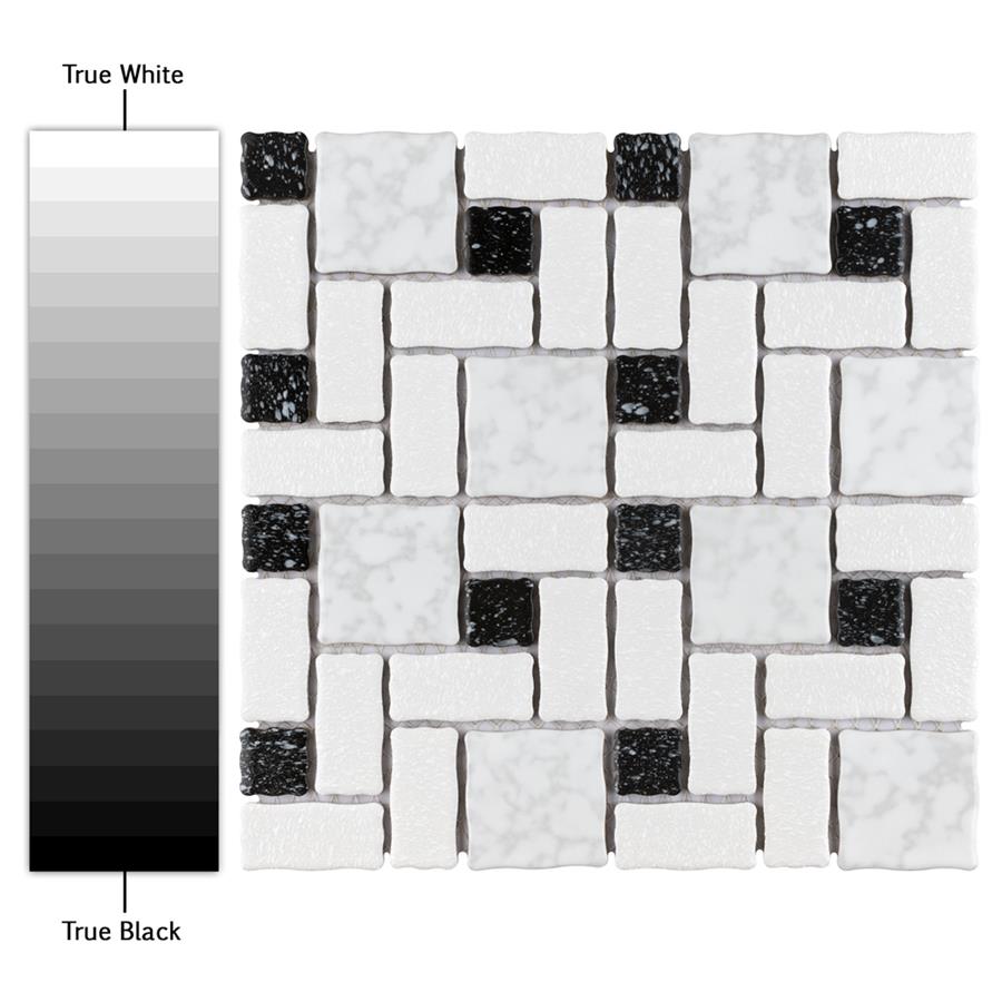 The SomerTile Academy White and Black 11-3/4 in. x 11-3/4 in. x 5 mm Porcelain Mosaic Tile is reminiscent of traditional, multi-texture and multi-color porcelain mosaic floor tile. Featuring a mottled finish and muted color palette, these tiles recreate a classic look with the durability and versatility of a modern tile. Use this tile virtually anywhere, due to its frost resistance, high slip resistance and P.E.I. rating of 4.