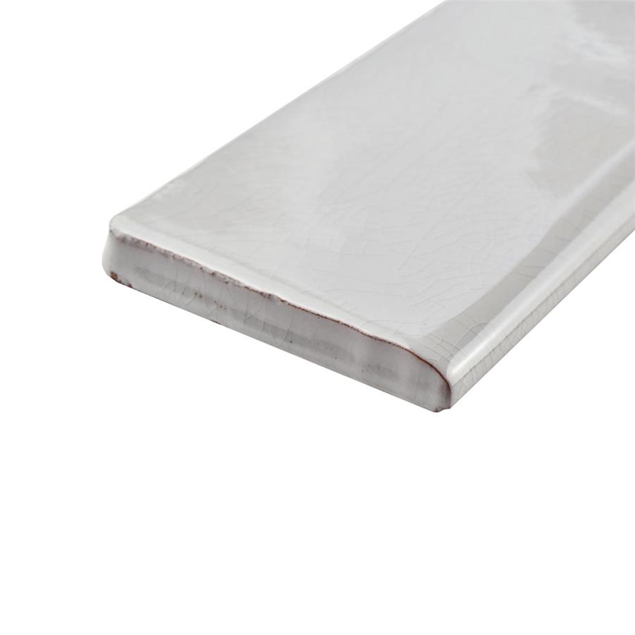 Bring unique vintage accents to your home with the SomerTile Antic Gris Oscuro Craquelle 3 in. x 6 in. Ceramic Bullnose Wall Trim Tile. This high sheen tile features a crackle glaze which adds subtle appeal. The edges of this tile are not straight, giving each piece a handmade feel. The tile is light gray with a bisque coloring that exposes some of the red ceramic around the edges. Use this finishing piece alongside many different products, including those in the Antic series.