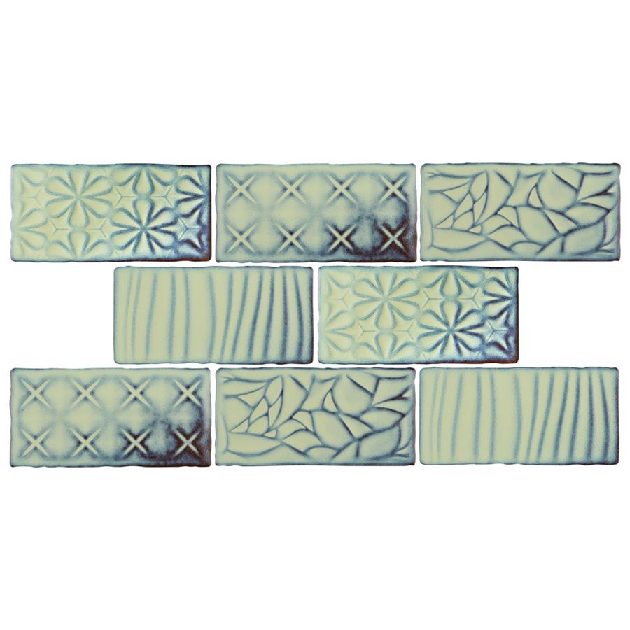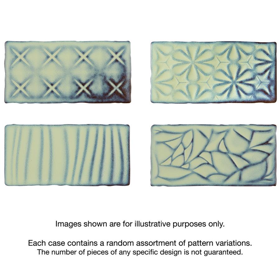Bring unique vintage accents to your home with the SomerTile Antic Sensations Agua Marina 3 in. x 6 in. Ceramic Wall Tile. These embossed floral subway tiles feature uneven edges for a handmade look. There are up to four varieties of unique contemporary geometric patterns for endless design possibilities. The unique pastel coloring, which features different shades of vibrant mint and gradually darkens to teal, navy, and brown around the edges, creates a rustic look. These satin tiles feature a bisque finish that shows the red ceramic mixed with teal on the raised pattern. The reactive glaze on this tile makes every piece unique, so you will never have two that are exactly the same. This reactive glazing technique may cause high variation between dye lots. Please expect variation in color between orders and from what is pictured. Use these subway tiles as an accent with many of our other products, including those in the Antic collection, to complete an elegant look.Reminder: Each pack contains a random mix of tiles. The mix may not contain all 4 patterns.