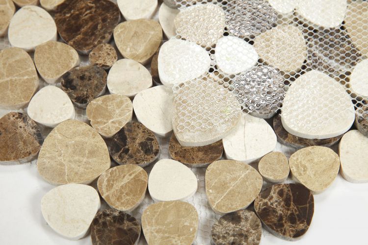 Product Sold By The SheetPrecious Stone Series: Aphrodite Spain 12×12 – Light and Dark Emperador mixed with Marfil marble in heart shape mosaic.Suggested Grout Color: Bostik Trucolor Classic Bone H158WARNING: This product can expose you to chemicals including crystalline silica (airborne particles of respirable size) in dust created during fabrication/installation if the product is dry cut/ground or pulverized, which are known to the State of California to cause cancer. For more information, go to https://www.p65warnings.ca.gov/.