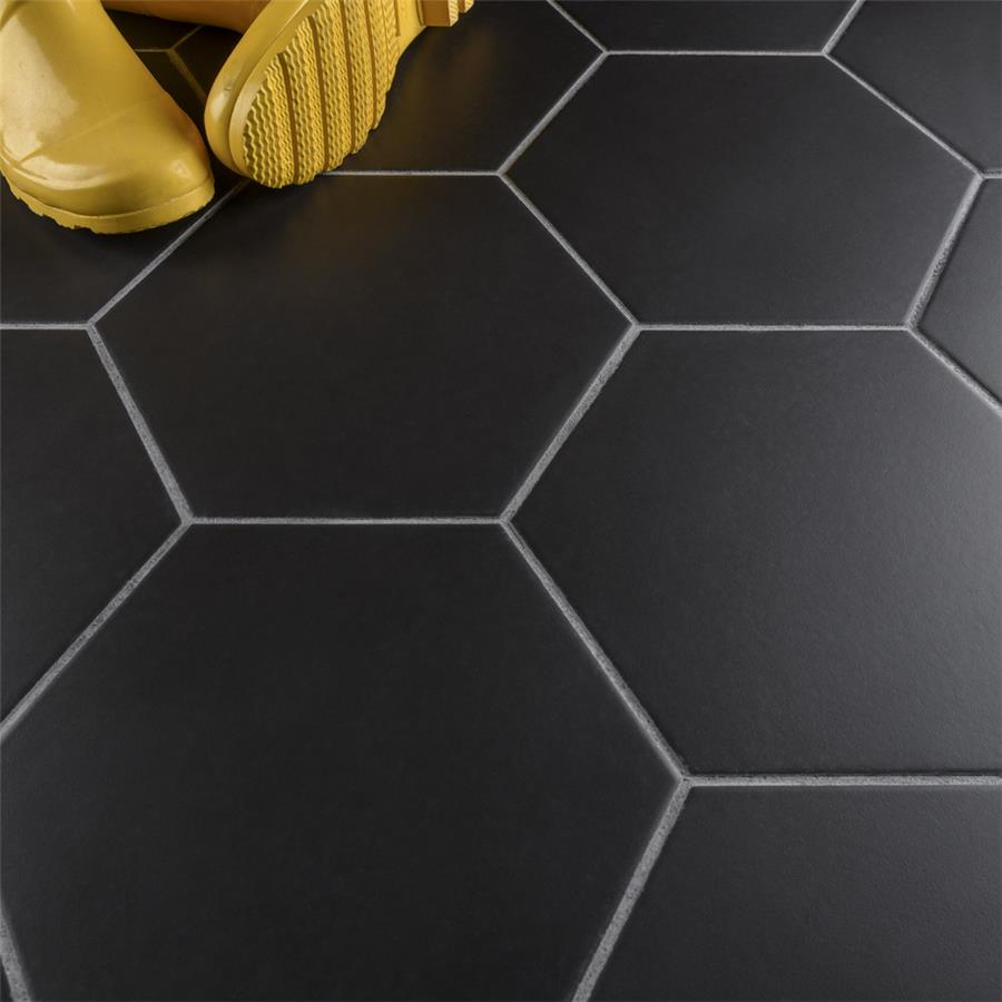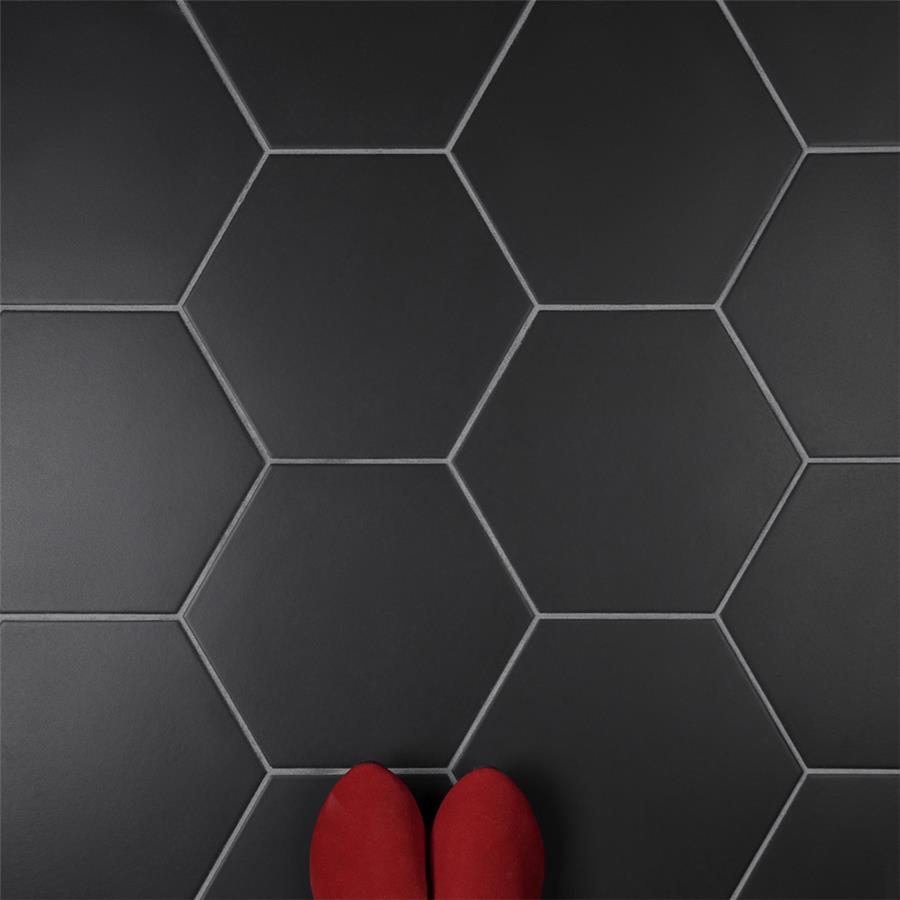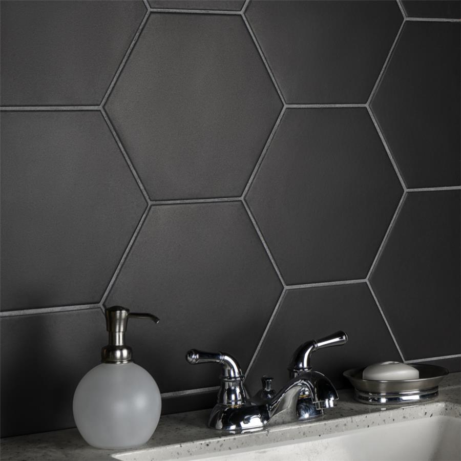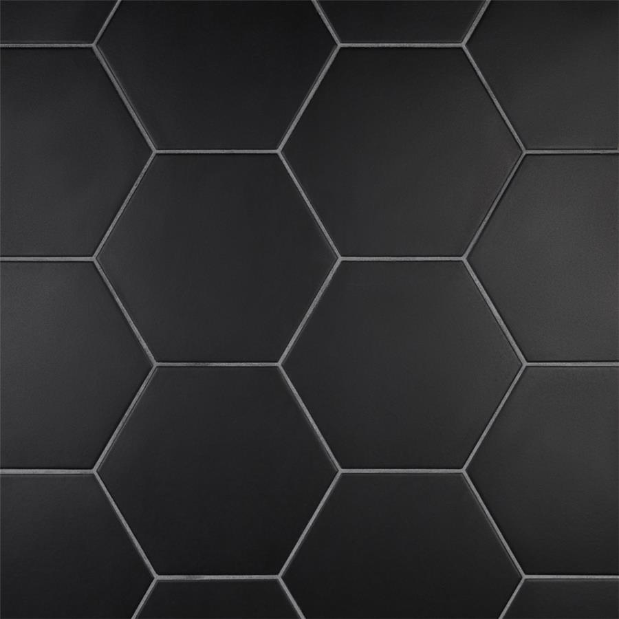 Lending a bold appearance, our Apini Hex Matte Black 9 in. x 10-1/2 in. Porcelain Floor and Wall Tile instantly elevates spaces through a refreshing dose of geometric design. The black glaze is uniformly applied to create a striking matte surface that offers eye-catching beauty. Given the versatility of its format, this hexagon tile is unique yet simplistic enough to integrate into any design, ranging from traditional style renovations to modern home projects. Its impervious, frost resistant and durable features make this an ideal tile for residential indoor and outdoor use, including kitchen backsplashes, bathroom showers, and fireplace facades. This tile is a perfect choice on its own or paired with other products in the Apini Collection. Tile is the better choice for your space. This tile is made from natural ingredients, making it a healthy choice as it is free from allergens, VOCs, formaldehyde and PVC.