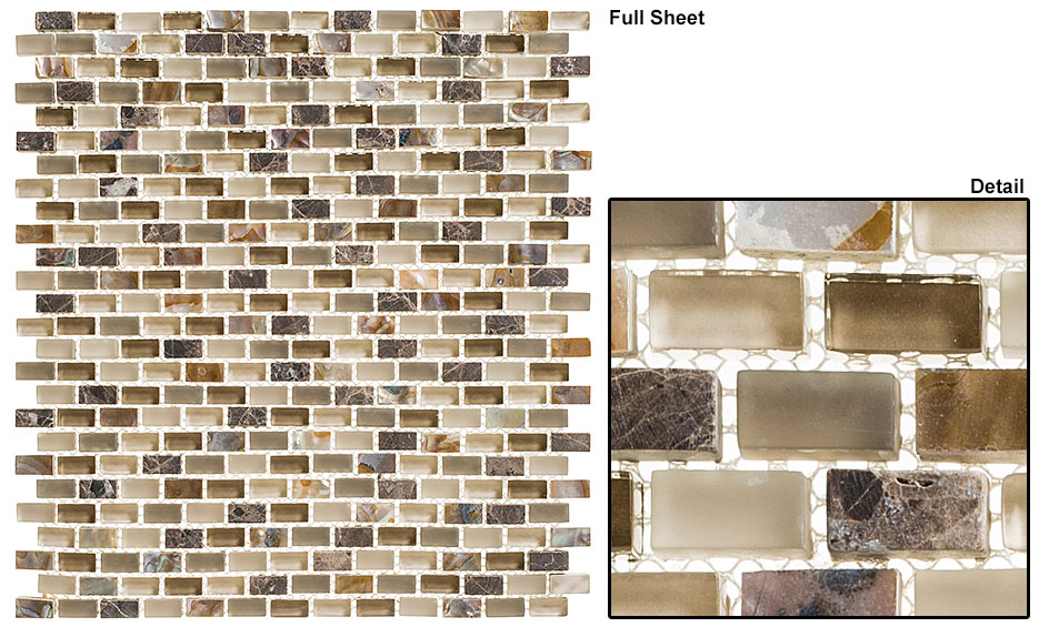 Tile Size: 3/4” X 3/8”Sheet Size: 12 1/4” x 11 1/4”Sheet Coverage: .96 SQFRows Per Sheet: 26Tiles Per Sheet: 338Cut into Borders: Every rowTile Thickness: 5/16” (8mm)Grout Joint: 1/16” (2mm)All tiles are mesh mounted.Due to the variance in installation methods, grout colors, lighting, image variances and computer monitor settings; the images above may not accurately represent the true color of the products after installation.Therefore Glazzio Tiles always recommends that tiles not be purchased from an image of any kind.