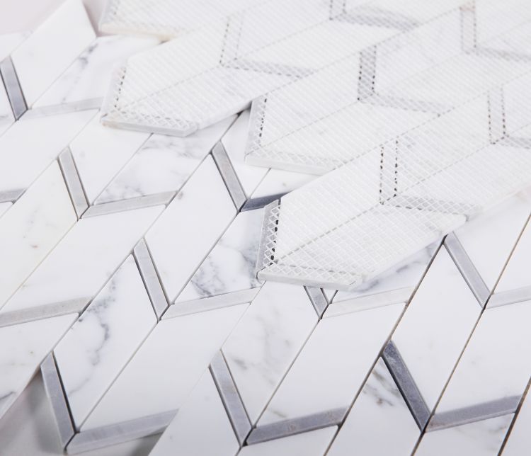 Product Sold By The SheetPrecious Stone series: Arrow Sky 12×12.75 – A combination of Calacatta Gold and Palissandro Blue marble mosaic that creates an alternating Arrow effect.Suggested Grout Color: Bostik Trucolor White H152WARNING: This product can expose you to chemicals including crystalline silica (airborne particles of respirable size) in dust created during fabrication/installation if the product is dry cut/ground or pulverized, which are known to the State of California to cause cancer. For more information, go to https://www.p65warnings.ca.gov/.