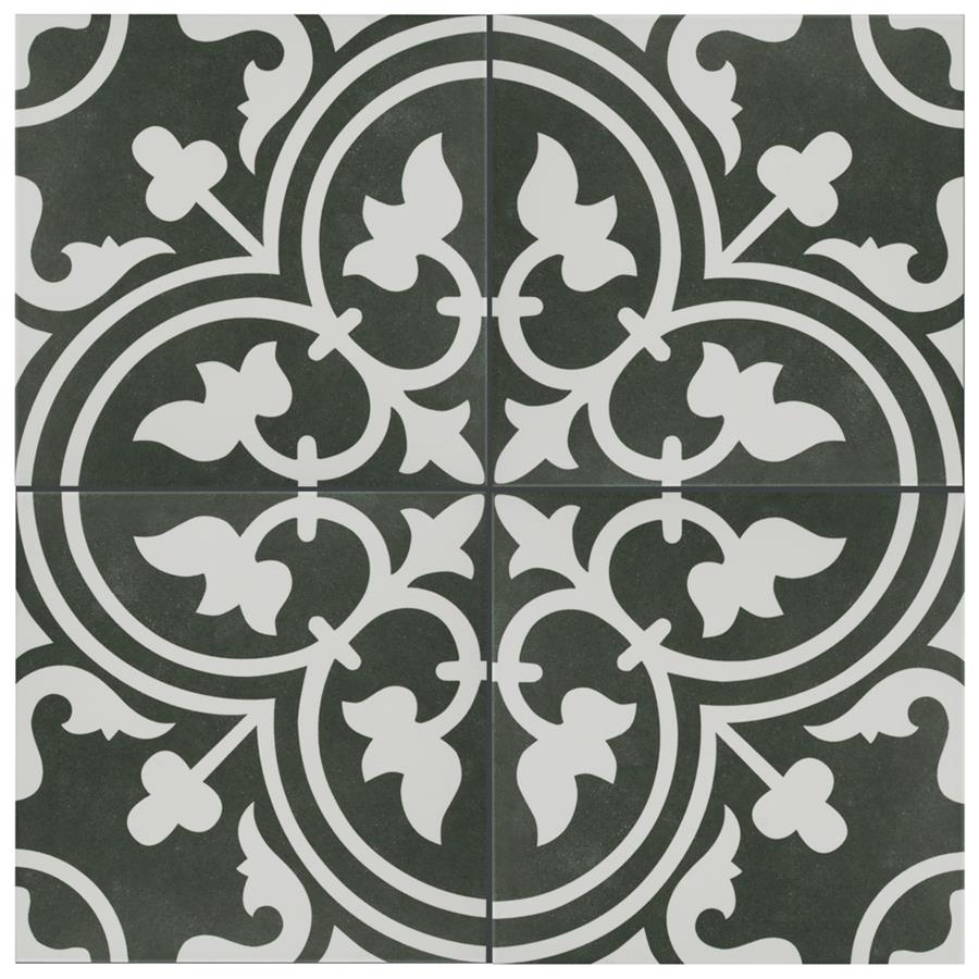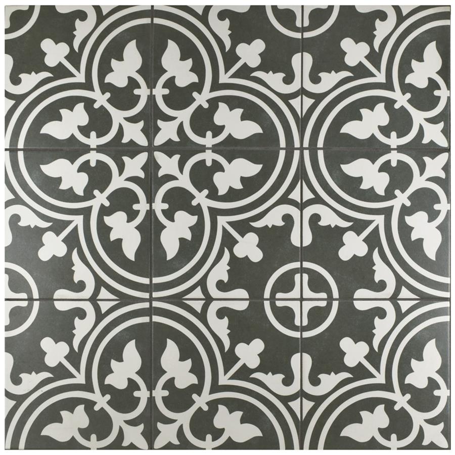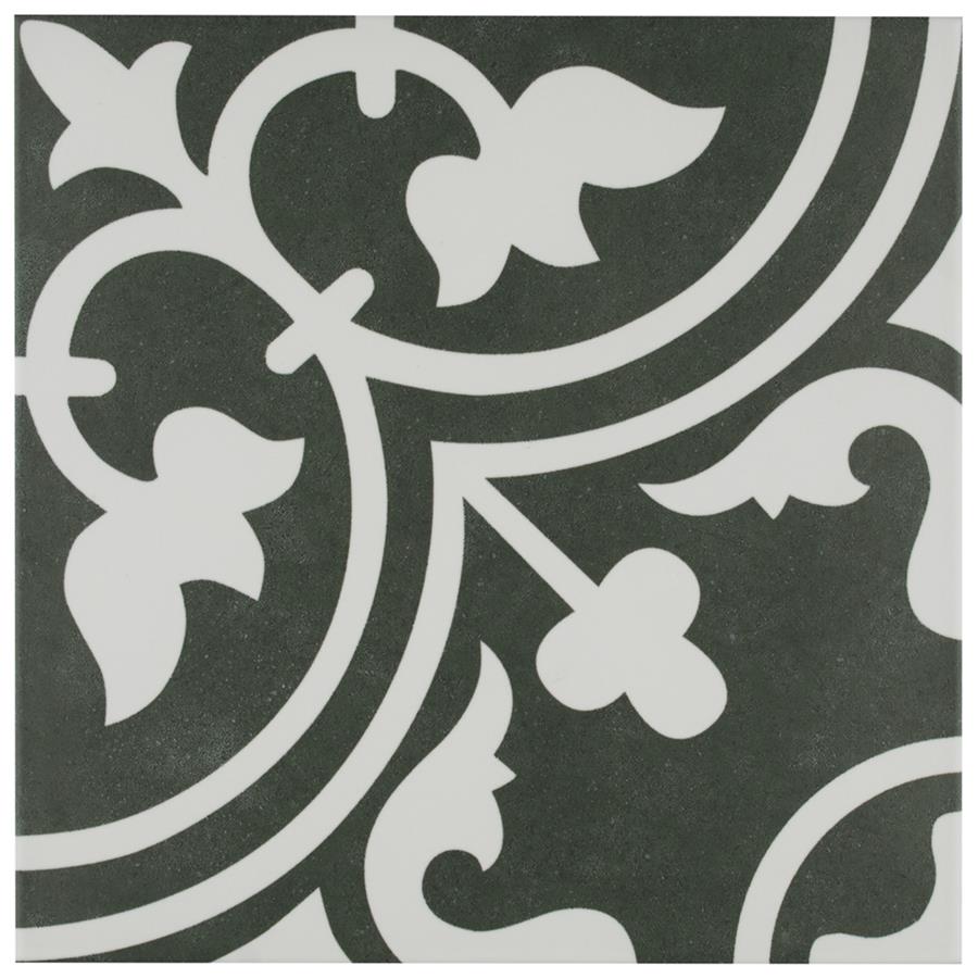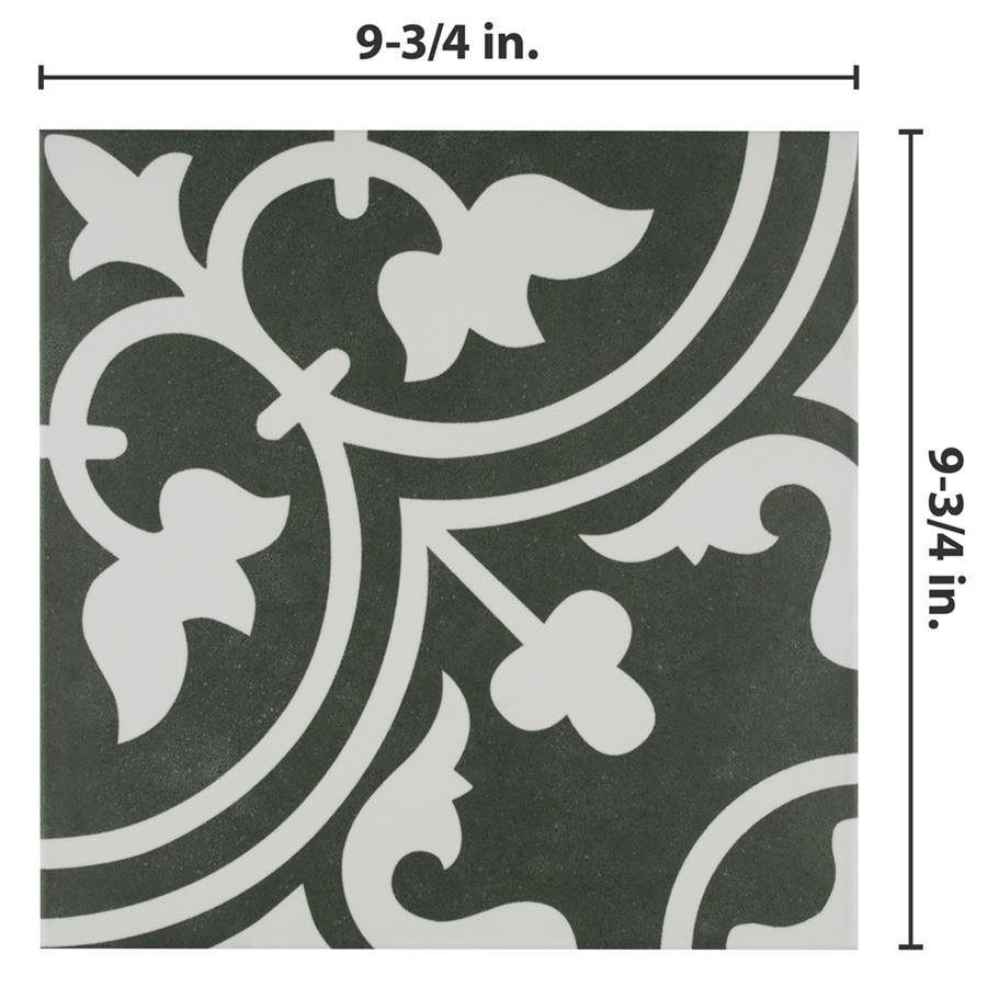As the original encaustic-look porcelain tile that started the patterned tile trend, our Arte Black 9-3/4 in. x 9-3/4 in. Porcelain Floor and Wall Tile draws inspiration from artisan cement tiles. Crafted in Spain, this porcelain tile features a large floral old-world pattern in snow white that frames dueling arcs in the center, offering subtle contrast and dimension to the decoration. Set on the highest-quality charcoal black base glaze, the contrasting design features a weathered, speckled look, replicating the beauty of its cement muse. The floral, geometric pattern blends into virtually any design theme, making this an exceptional product for modern installations and historic renovations. Its impervious and frost-resistant features make it an ideal choice for both indoor and outdoor residential installations including kitchens, bathrooms, showers, entryways and patios.Tile is the better choice for your space. This tile is made from natural ingredients, making it a healthy choice as it is free from allergens, VOCs, formaldehyde and PVC.Try out our grout test below to determine which grout color suits your design preferences.