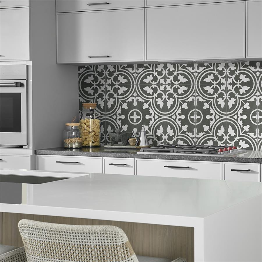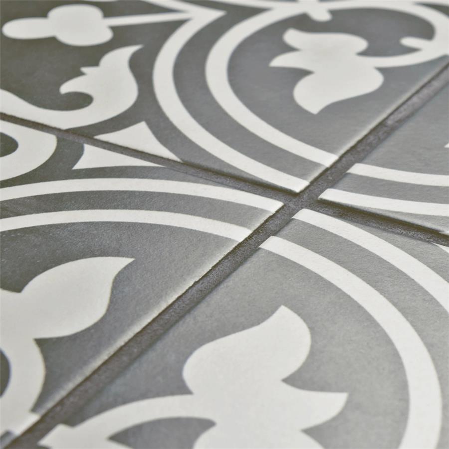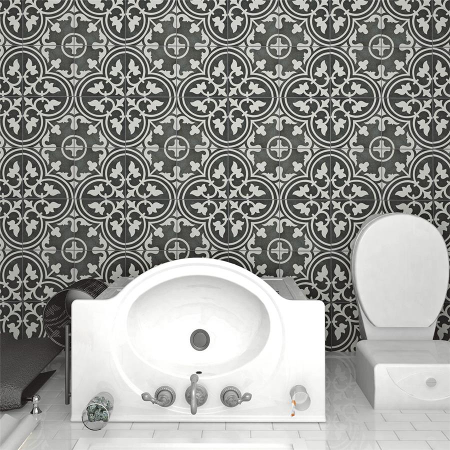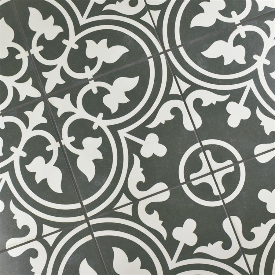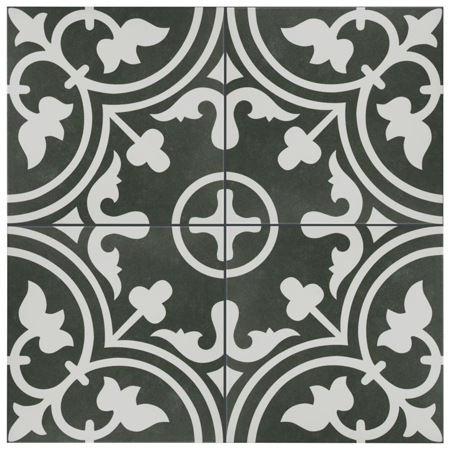 As the original encaustic-look porcelain tile that started the patterned tile trend, our Arte Black 9-3/4 in. x 9-3/4 in. Porcelain Floor and Wall Tile draws inspiration from artisan cement tiles. Crafted in Spain, this porcelain tile features a large floral old-world pattern in snow white that frames dueling arcs in the center, offering subtle contrast and dimension to the decoration. Set on the highest-quality charcoal black base glaze, the contrasting design features a weathered, speckled look, replicating the beauty of its cement muse. The floral, geometric pattern blends into virtually any design theme, making this an exceptional product for modern installations and historic renovations. Its impervious and frost-resistant features make it an ideal choice for both indoor and outdoor residential installations including kitchens, bathrooms, showers, entryways and patios.Tile is the better choice for your space. This tile is made from natural ingredients, making it a healthy choice as it is free from allergens, VOCs, formaldehyde and PVC.Try out our grout test below to determine which grout color suits your design preferences.
