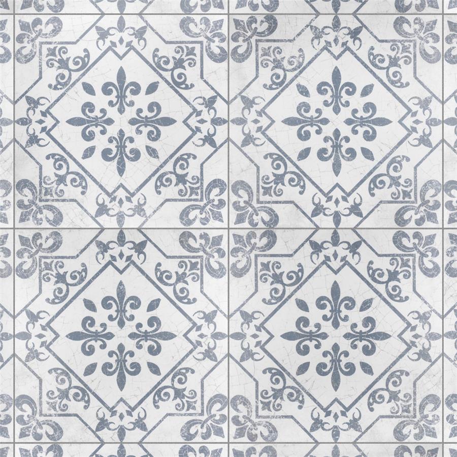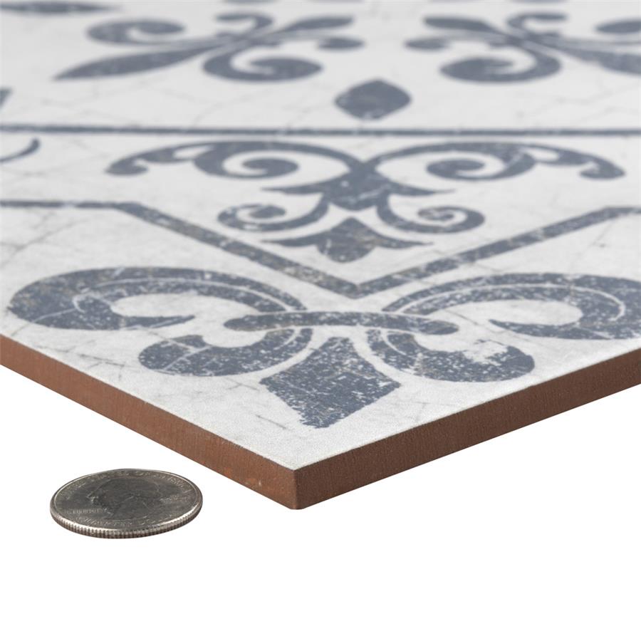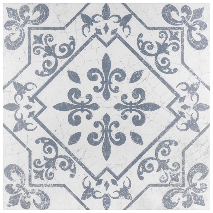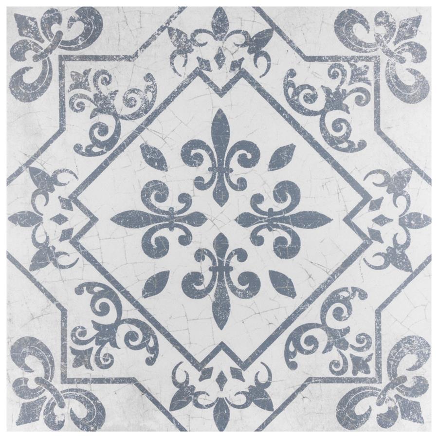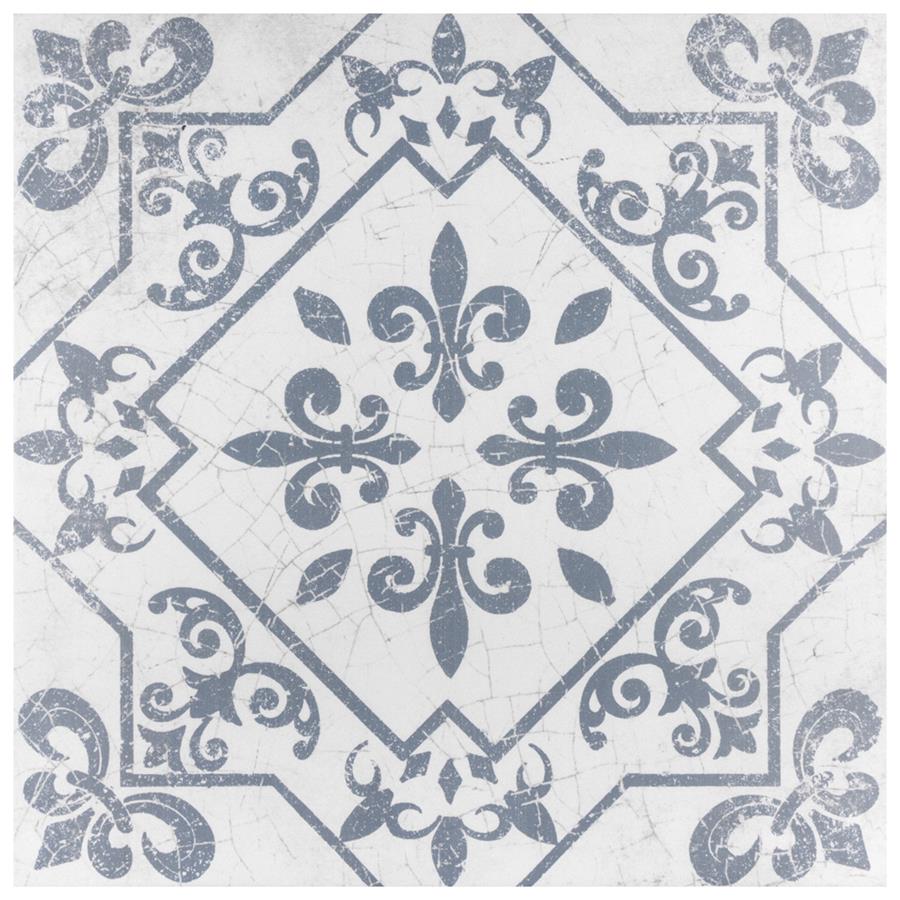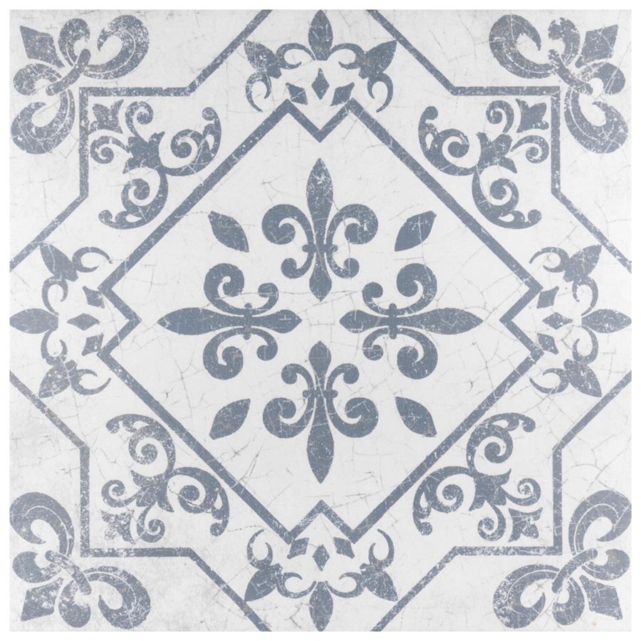 Vintage European design was the inspiration behind the SomerTile Atlantic Azul 17-5/8 in. x 17-5/8 in. Ceramic Floor and Wall Tile. With a crackling cool white surface, this Spanish tile rivals antique, old-world design. Slate blue lines diagonally intersect, creating sharp angles and offset framing patterns. Set within the center diamond are four fleur-de-lis configurations, creating an appealing, elegant centered design. Flourishing patterns in the four corners further express its encaustic inspiration. All of these patterns are distressed, convincing that this tile is truly aged. The medium-sheen finish further convinces that this is an age-old tile. This durable tile is suitable for most interior installations, including kitchens, bathrooms, and showers.Tile is the better choice for your space. This tile is made from natural ingredients, making it a healthy choice as it is free from allergens, VOCs, formaldehyde and PVC.