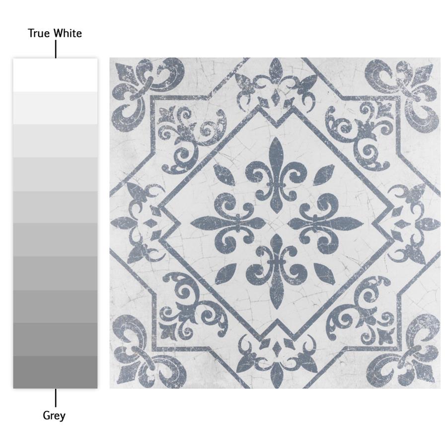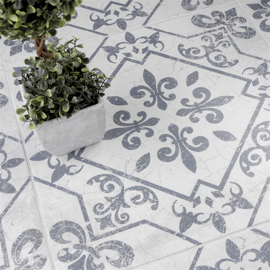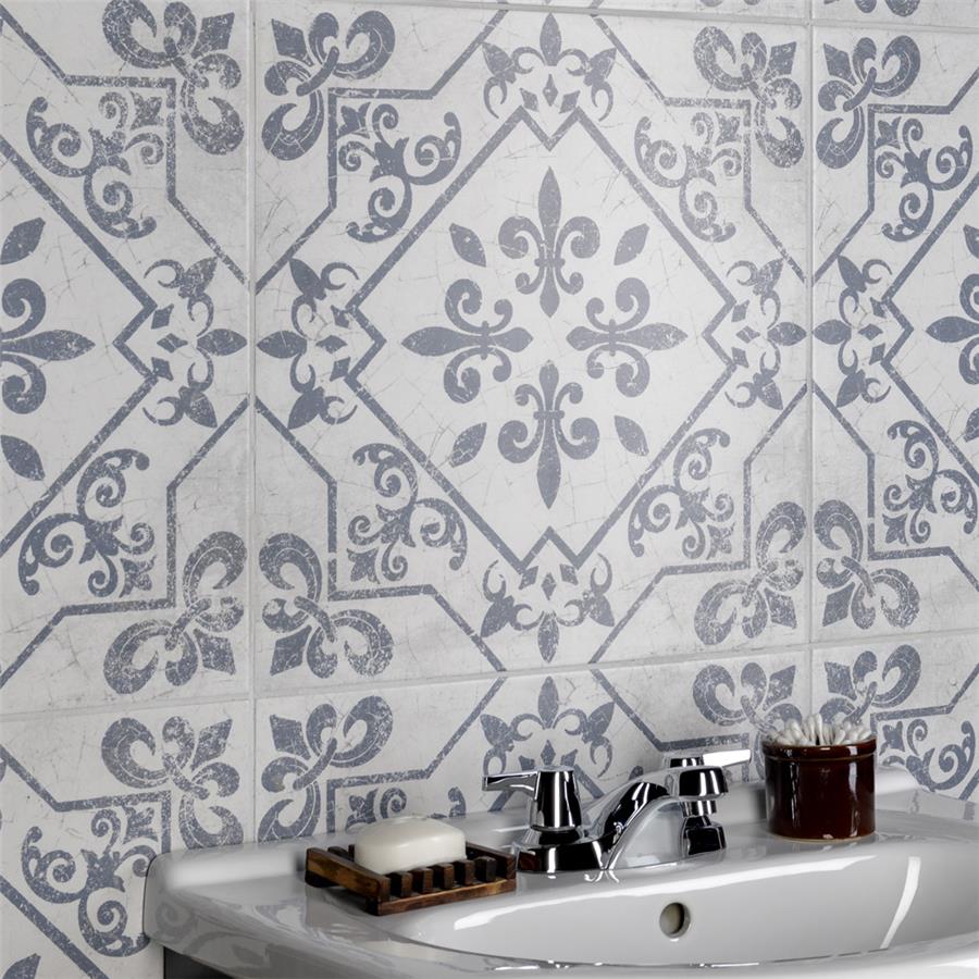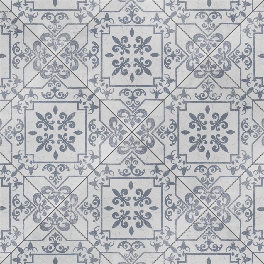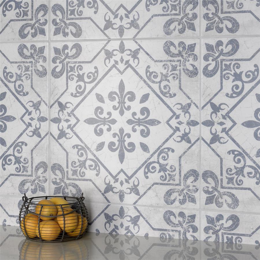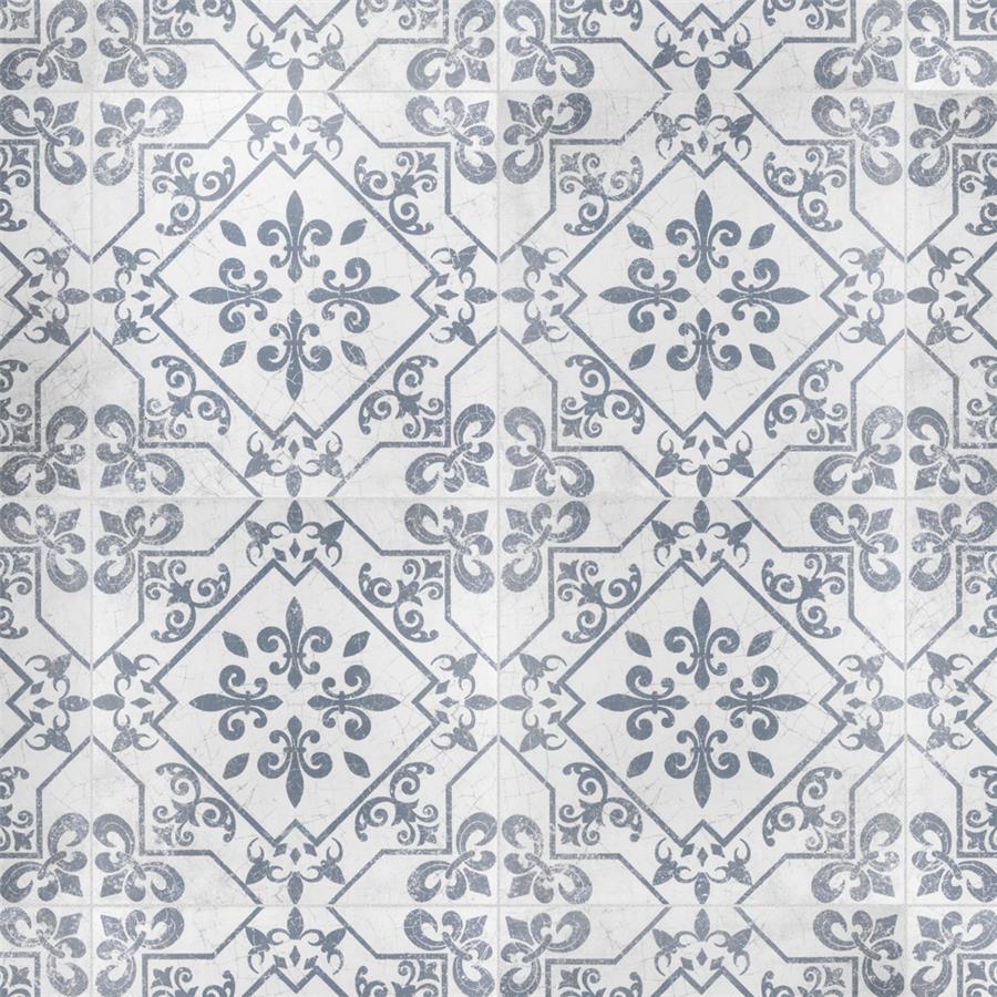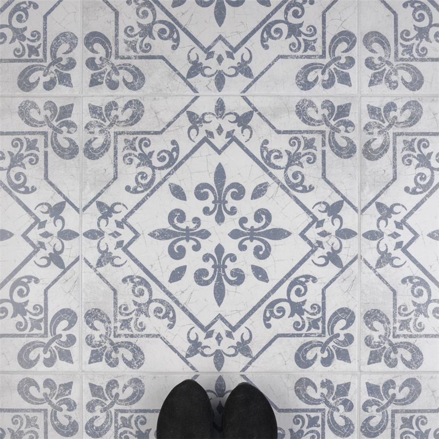 Vintage European design was the inspiration behind the SomerTile Atlantic Azul 17-5/8 in. x 17-5/8 in. Ceramic Floor and Wall Tile. With a crackling cool white surface, this Spanish tile rivals antique, old-world design. Slate blue lines diagonally intersect, creating sharp angles and offset framing patterns. Set within the center diamond are four fleur-de-lis configurations, creating an appealing, elegant centered design. Flourishing patterns in the four corners further express its encaustic inspiration. All of these patterns are distressed, convincing that this tile is truly aged. The medium-sheen finish further convinces that this is an age-old tile. This durable tile is suitable for most interior installations, including kitchens, bathrooms, and showers.Tile is the better choice for your space. This tile is made from natural ingredients, making it a healthy choice as it is free from allergens, VOCs, formaldehyde and PVC.
