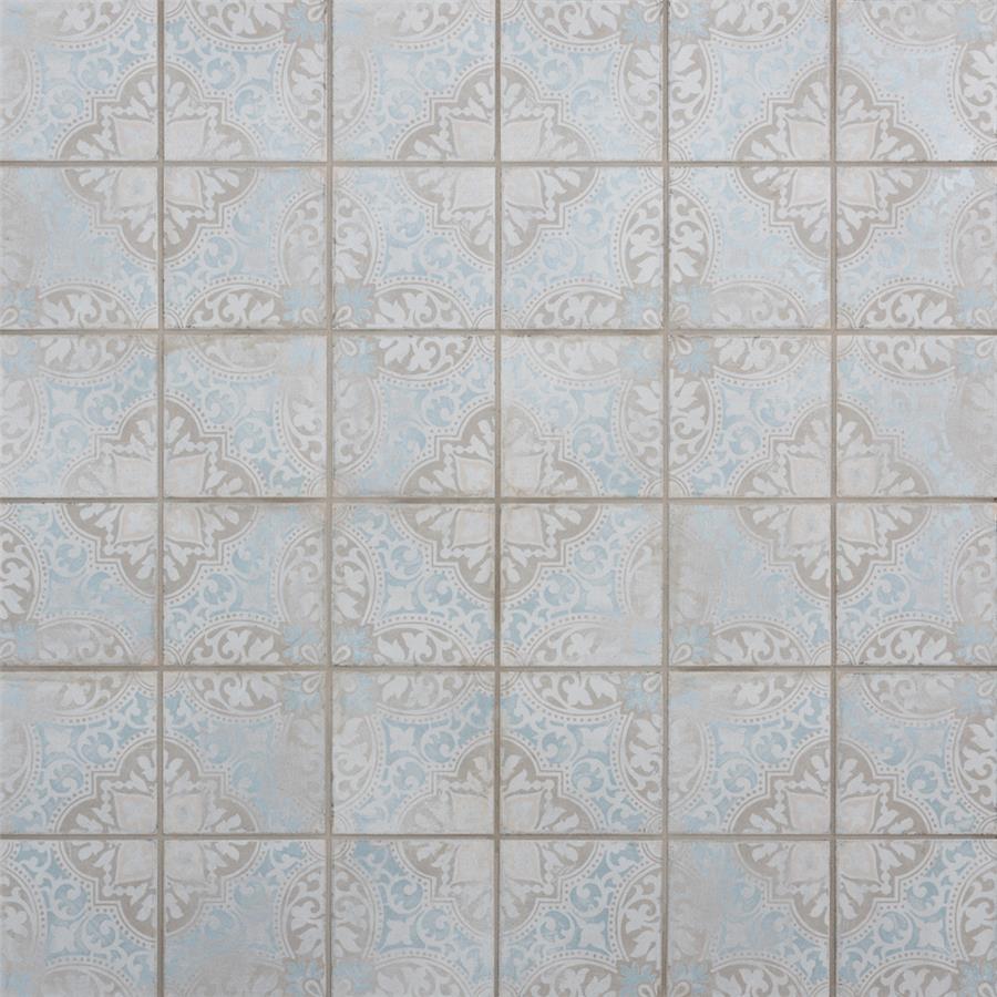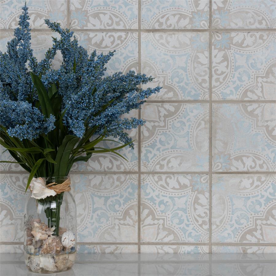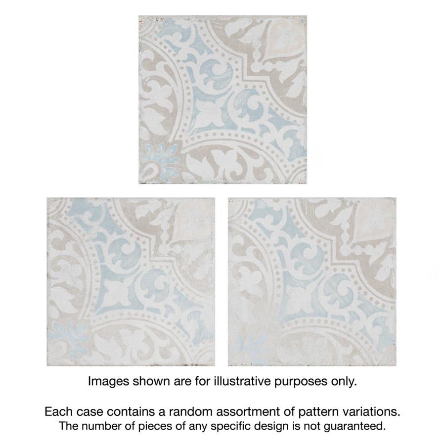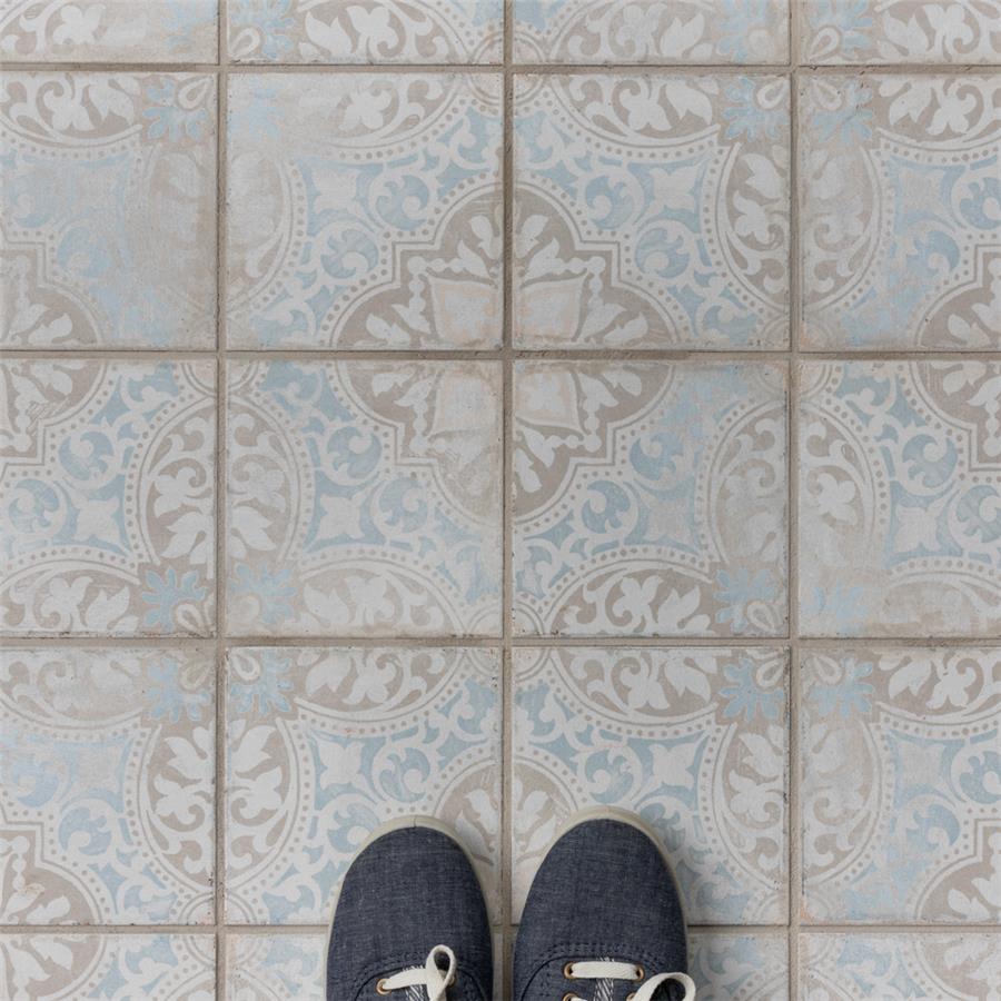 Modern and vintage design elements blend together to create our Barcelona Decor Montjuic 5-3/4 in. x 5-3/4 in. Porcelain Floor and Wall Tile. Featuring a worn cement appearance, this tile is a subtle statement piece created by floral motifs in faded pastel shades of light blue, beige and brown set on a textured antique white base glaze. With a delicate color palette and realistic imitations of scuffs and spots, this encaustic inspired tile evokes a loved, worn and century-old appearance with a chic modern edge. Available in six print variations that are randomly scattered throughout each case, the variation throughout each tile mimics an authentic aged appearance. Its impervious, frost-resistant and durable features make this tile and ideal choice for both indoor and outdoor commercial and residential installations including, backsplashes, kitchens, bathrooms, showers, entryways and patios. This tile is a perfect choice on its own or paired with other products in the Barcelona Collection.Tile is the better choice for your space. This tile is made from natural ingredients, making it a healthy choice as it is free from allergens, VOCs, formaldehyde and PVC.
