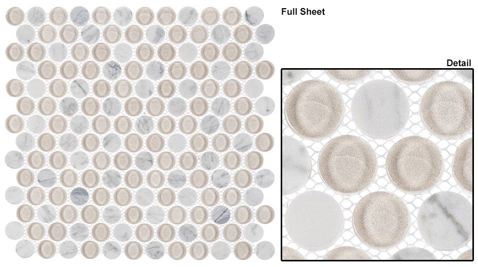 Tile Size: Penny roundsSheet Size: 11 15/16″ x 12 1/16″Sheet Coverage: 1 SQFRows per Sheet: 14Tiles per Sheet: 168Cut into Borders: Every 2 rowsTile Thickness: 6 mmGrout Joint: 1/16″ (2 mm)Mesh Mounted: YesDue to the variance in installation methods, grout colors, lighting, image variances and computer monitor settings; the images above may not accurately represent the true color of the products after installation.Therefore Glazzio Tiles always recommends that tiles not be purchased from an image of any kind.