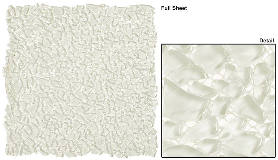Raindrop: Small crushed pieces of glassSheet Size: 11 7/8” x 11 7/8”Tiles Per Sheet: VariousSheet Coverage: .98 SQFTile Thickness: 5/16” (8 mm)Grout Joints: VariousAll tiles are meshed mountedDue to the variance in installation methods, grout colors, lighting, image variances and computer monitor settings; the images above may not accurately represent the true color of the products after installation.Therefore Glazzio Tiles always recommends that tiles not be purchased from an image of any kind.