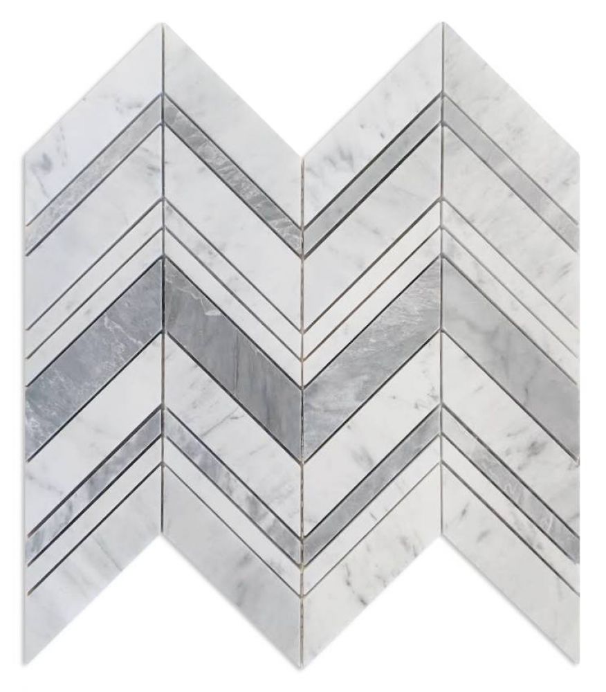 Product Sold By The SheetChevron & Herringbone Series: Chevron Ravenna Grey 11.75×12.25 – Carrara marble mixed with Bardiglio marble in a chevron shaped mosaic.Suggested Grout Color: TBDWARNING: This product can expose you to chemicals including crystalline silica (airborne particles of respirable size) in dust created during fabrication/installation if the product is dry cut/ground or pulverized, which are known to the State of California to cause cancer. For more information, go to https://www.p65warnings.ca.gov/.