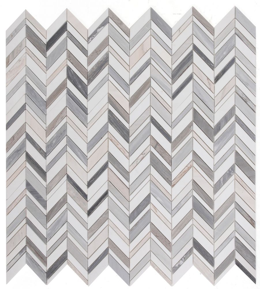 Product Sold By The SheetChevron & Herringbone Series: Chevron Shadow Blue 11.75×12 – Mix of Palissandro Blue and White Thassos marble in Chevron Pattern mosaic.Suggested Grout Color: TBDWARNING: This product can expose you to chemicals including crystalline silica (airborne particles of respirable size) in dust created during fabrication/installation if the product is dry cut/ground or pulverized, which are known to the State of California to cause cancer. For more information, go to https://www.p65warnings.ca.gov/.
