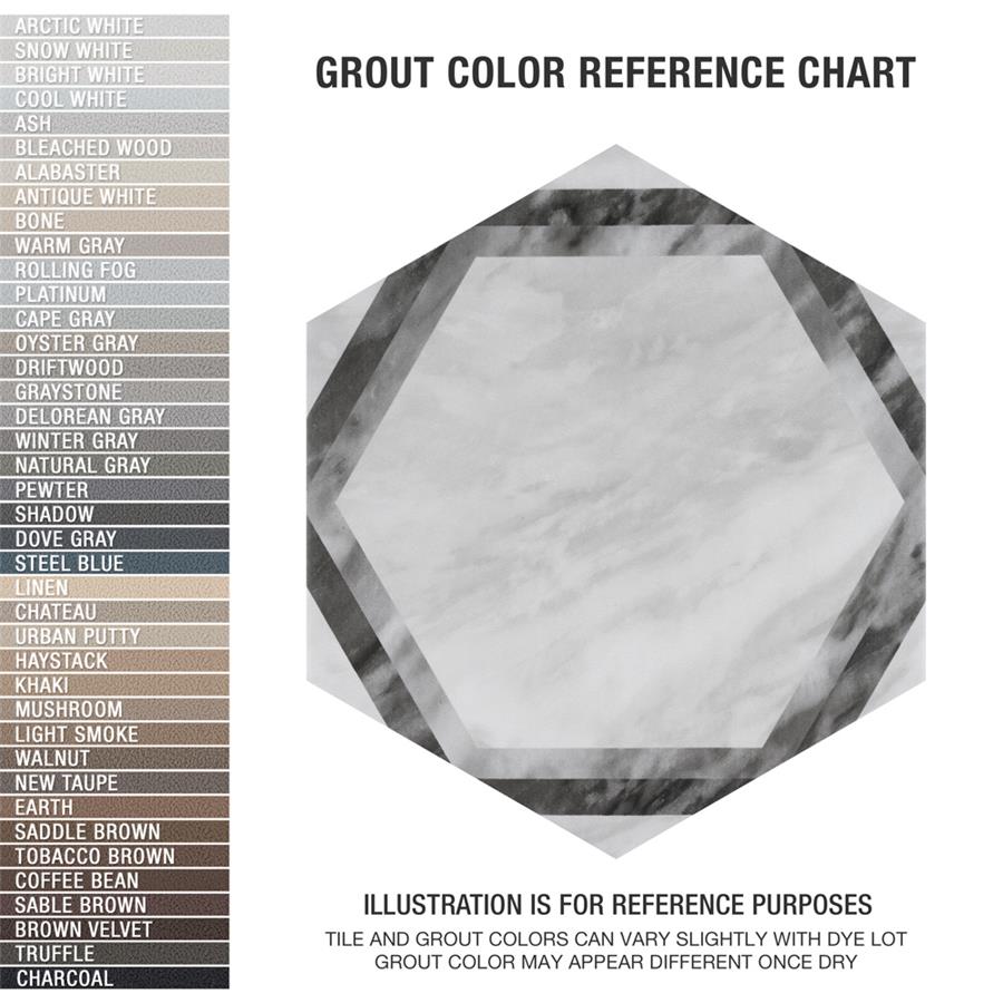 Emulating the timeless beauty of marble stone in an easy to maintain porcelain material, our Classico Bardiglio Hex Dimension Light 7” x 8” Porcelain Floor and Wall Tile, brings functional sophistication into any space. This matte hexagon tile features alternating grey and black framing patterns with grey veining and striations set on a light grey base glaze. This innovative and sophisticated display of geometric design is visually appealing and versatile and adapts to any stylistic context. Its impervious and frost-resistant features make it an ideal choice for indoor and outdoor installations including kitchens, bathrooms, backsplashes, showers, entryways, and patios. This tile is a perfect choice on its own or coordinated with other products in the Classico Bardiglio series. Tile is the better choice for your space. This tile is made from natural ingredients, making it a healthy choice as it is free from allergens, VOCs, formaldehyde, and PVC.Try out our grout test below to determine which grout color suits your design preferences.