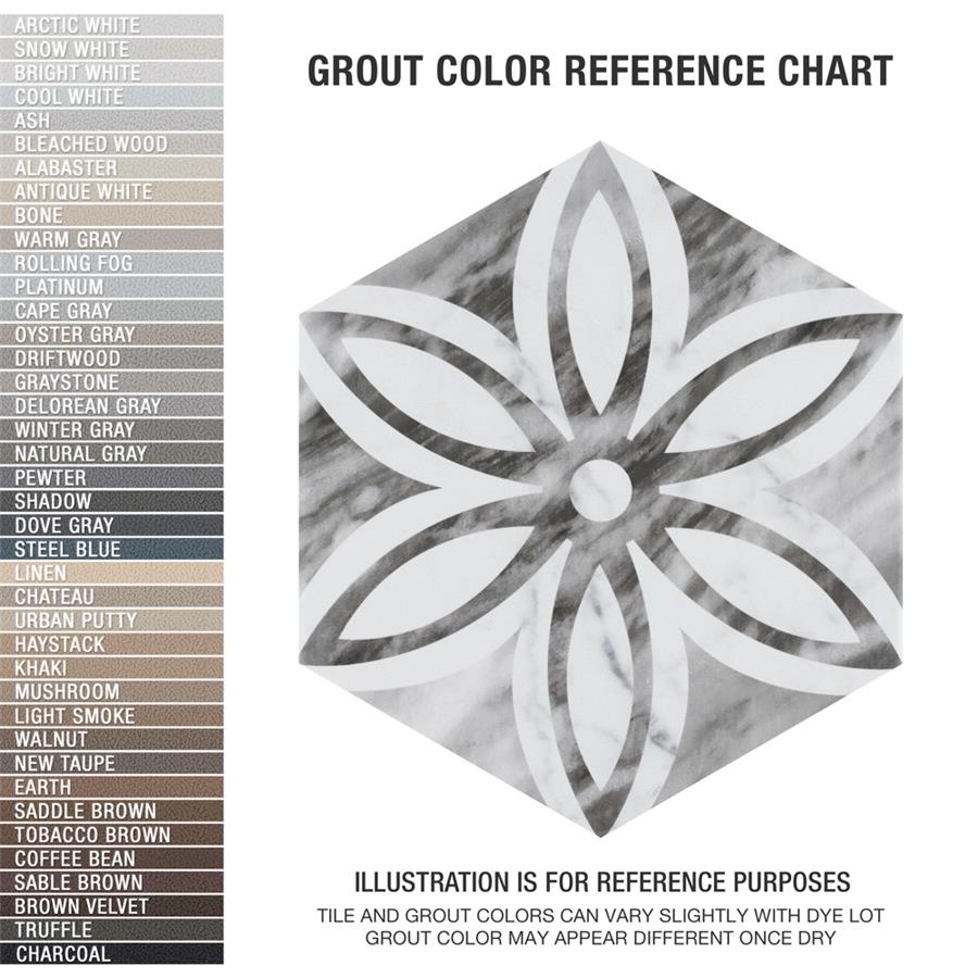 Emulating the timeless beauty of marble stone in an easy to maintain porcelain material, our Classico Bardiglio Hex Lily 7” x 8” Porcelain Floor and Wall Tile, brings functional sophistication into any space. This matte hexagon tile features black and light grey floral patterns with grey veining and striations set on a white base glaze. This innovative and sophisticated display of geometric design is visually appealing and versatile and adapts to any stylistic context. Its impervious and frost-resistant features make it an ideal choice for indoor and outdoor installations including kitchens, bathrooms, backsplashes, showers, entryways, and patios. This tile is a perfect choice on its own or coordinated with other products in the Classico Bardiglio series. Tile is the better choice for your space. This tile is made from natural ingredients, making it a healthy choice as it is free from allergens, VOCs, formaldehyde, and PVC.Try out our grout test below to determine which grout color suits your design preferences.