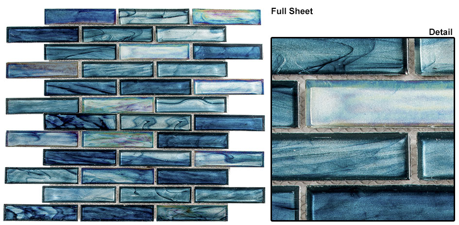 Sheet size – 11.75″ x 11.75″ (298mm)Sheet Coverage: .97 SQFTile size – nominal 1″ x 4″Tile per sheet – 36Tile thickness – 1/4″ (6mm)Grout joints – 1/16″ (2mm)All tiles are mesh mounted.Due to the variance in installation methods, grout colors, lighting, image variances and computer monitor settings; the images above may not accurately represent the true color of the products after installation.Therefore Glazzio Tiles always recommends that tiles not be purchased from an image of any kind.** Installation of this product in a wet application must be set with epoxy mortar and epoxy grout.