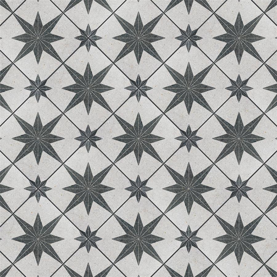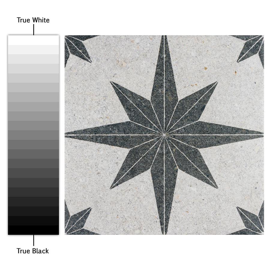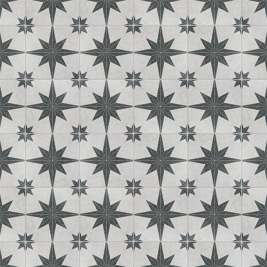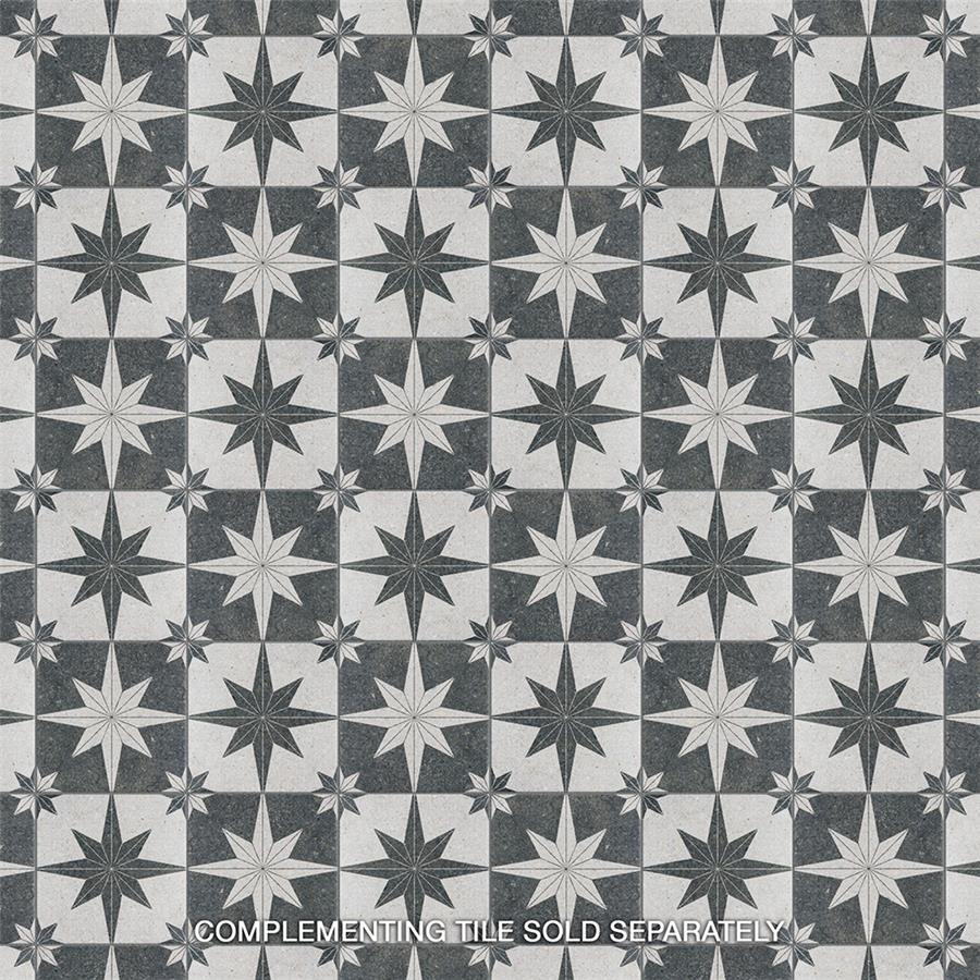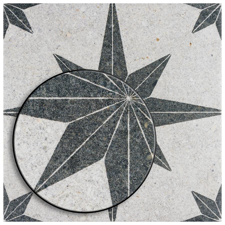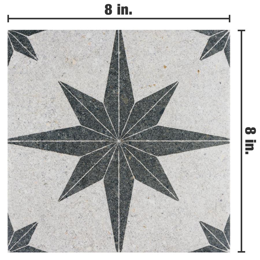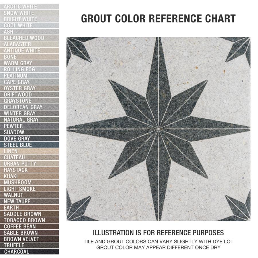 Offering the appearance of patterned natural stone, our Compass Star White Stone 8″ x 8″ Porcelain Floor and Wall Tile transforms any space into a functional and stylish extension of nature. This square tile features a large charcoal black geometric star atop an off-white base. Richly detailed with a slightly textured surface, this on-trend porcelain tile offers decorative, rustic beauty through natural mineral-like pattern variations and imitation scuffs and spots, replicating the appearance of natural stone. This stylish stone-look design is visually appealing and versatile, blending beautifully with a range of looks from vintage industrial to modern day. Its impervious and frost-resistant features make this an ideal choice for indoor and outdoor installations including kitchens, bathrooms, backsplashes, showers, entryways, patios and pools. This tile is a perfect choice on its own or paired with other products in the Compass Star collection. Tile is the better choice for your space. This tile is made from natural ingredients, making it a healthy choice as it is free from allergens, VOCs, formaldehyde and PVC.Try out our grout test below to determine which grout color suits your design preferences.