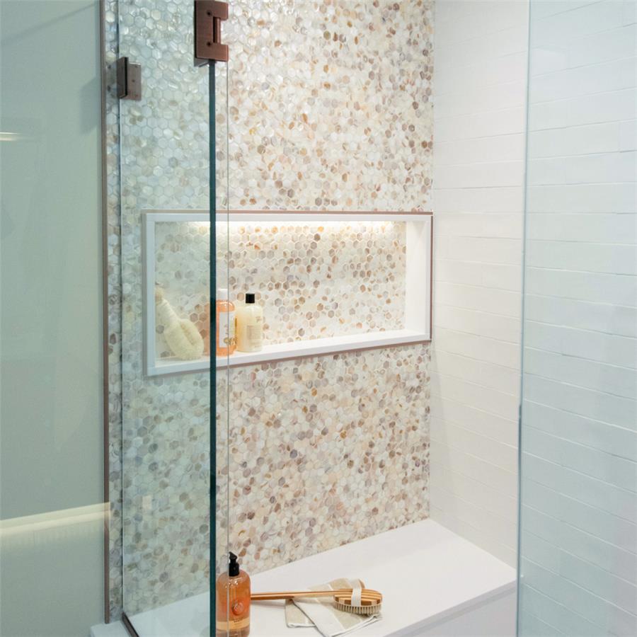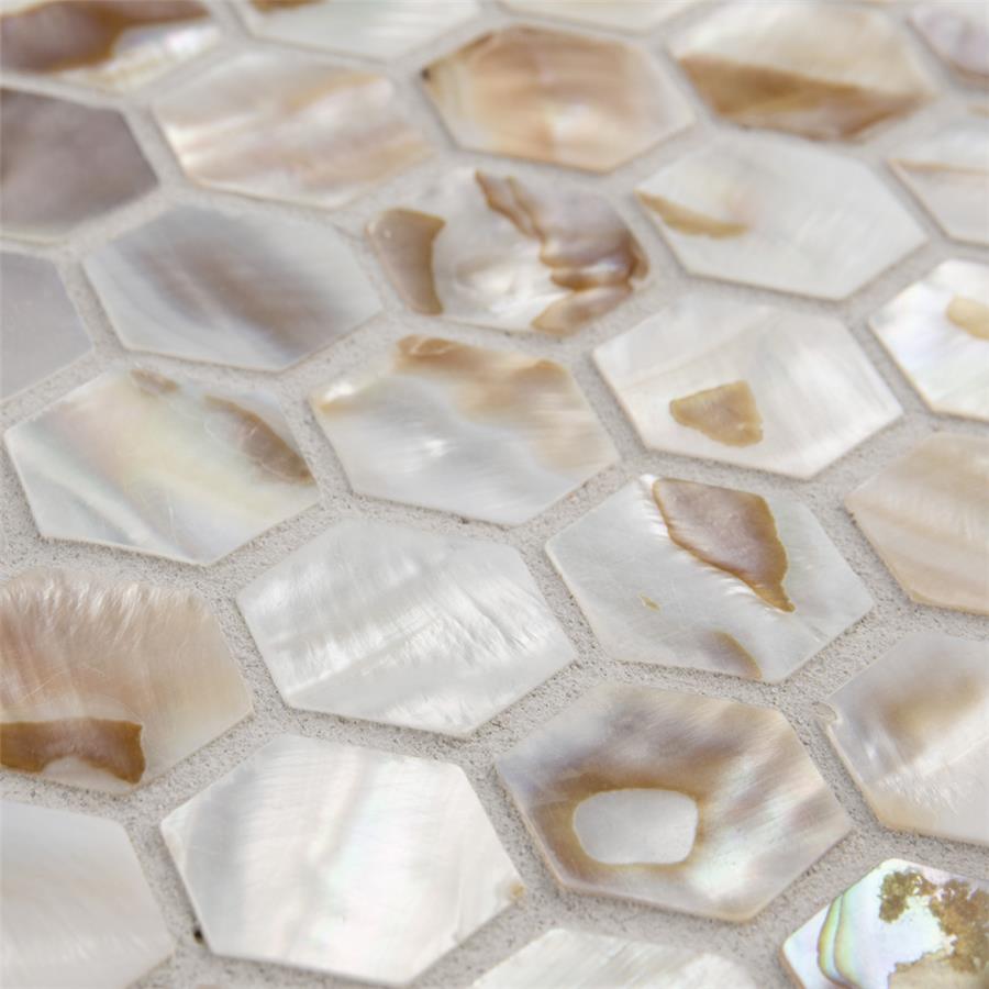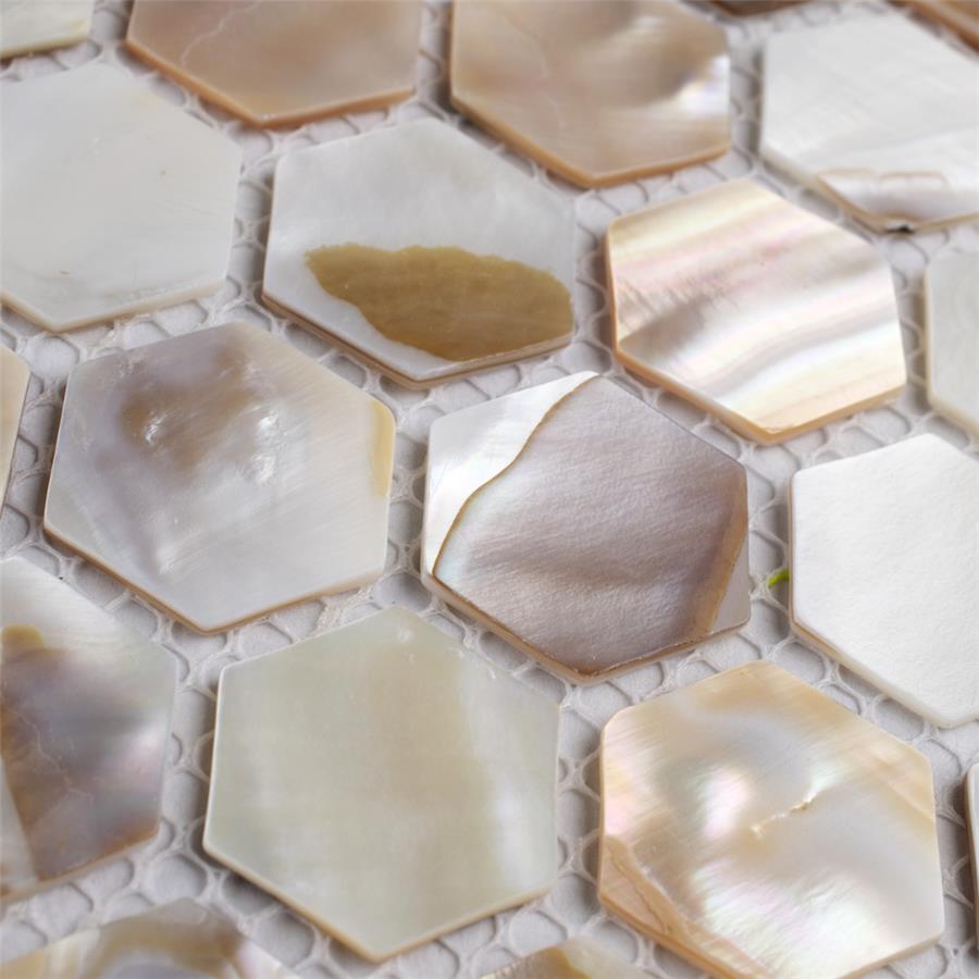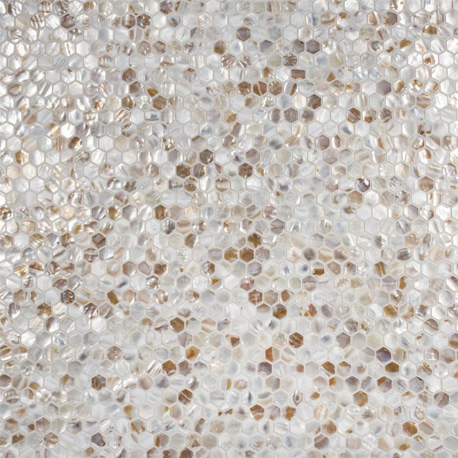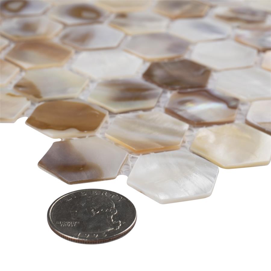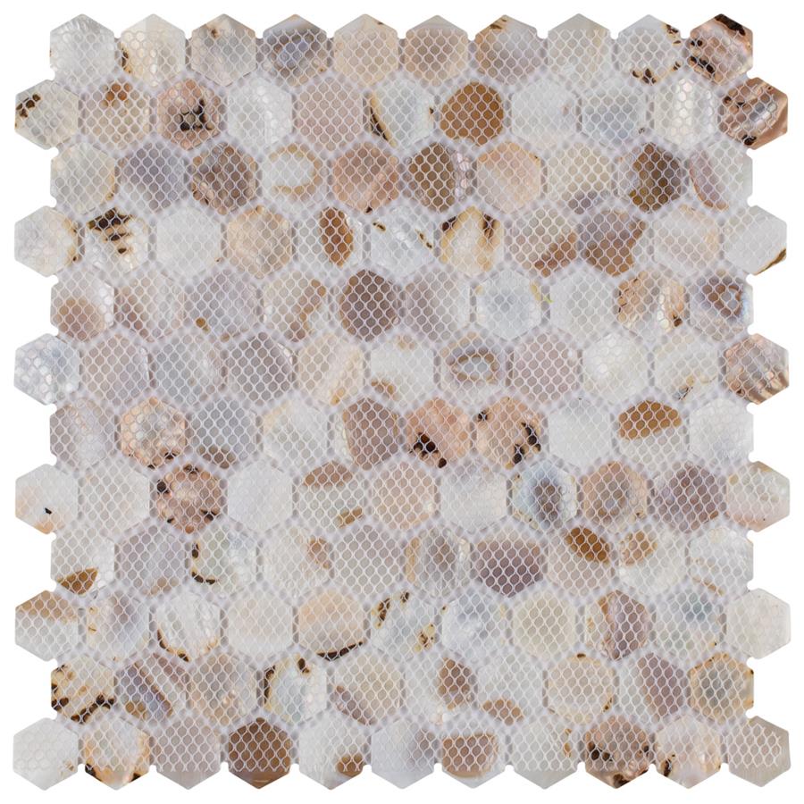 Capturing the lustrous beauty of natural seashells, our Conchella Hexagon Natural 11-1/2 in. x 11-5/8 in. Natural Seashell Mosaic Wall Tile emulates seaside-inspired tranquility. Featuring an exquisite blend of beautifully iridescent hexagon shaped chips that are constructed of natural seashells, this mosaic wall tile illuminates any space. Pale cream and golden brown tones infuses this tile with elegance and natural charm. Smooth, glossy hexagons are precisely arranged on an interlocking mesh to create a seamless installation. This minimalistic geometric mosaic is unique yet simplistic enough to integrate into any design, ranging from traditional style renovations to modern home projects. Its impervious and frost resistant features make this mosaic an ideal choice for both indoor and outdoor wall installations including, kitchen backsplashes, bathroom showers and fireplace facades. This tile is a perfect choice on its own or paired with other products in the Conchella Collection.Tile is the better choice for your space. This tile is made from natural ingredients, making it a healthy choice as it is free from allergens, VOCs, formaldehyde and PVC.
