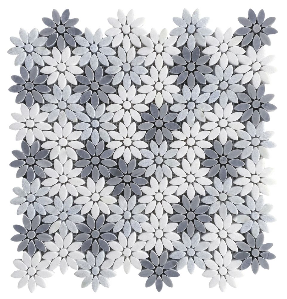Product Sold By The SheetDaisy Crystal Ocean12.5 x 13 – Flower mosaic made Blue Crystal, Grey marble and Thassos marble.Suggested Grout Color: TBDWARNING: This product can expose you to chemicals including crystalline silica (airborne particles of respirable size) in dust created during fabrication/installation if the product is dry cut/ground or pulverized, which are known to the State of California to cause cancer. For more information, go to https://www.p65warnings.ca.gov/.