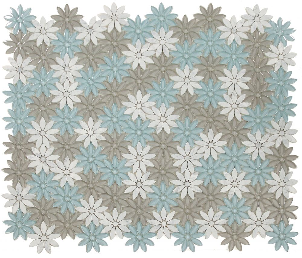 Product Sold By The SheetDaisy Series: Daisy White Sky 10×11.25 – Blue and grey glass with white marble in flower design.Suggested Grout Color: Bostik Dimension Diamond H600WARNING: This product can expose you to chemicals including crystalline silica (airborne particles of respirable size) in dust created during fabrication/installation if the product is dry cut/ground or pulverized, which are known to the State of California to cause cancer. For more information, go to https://www.p65warnings.ca.gov/.