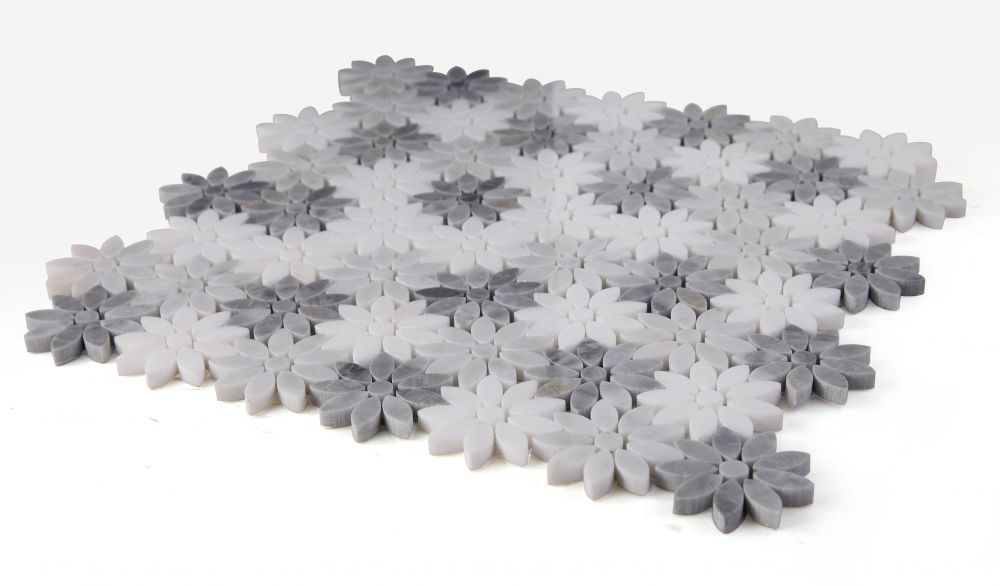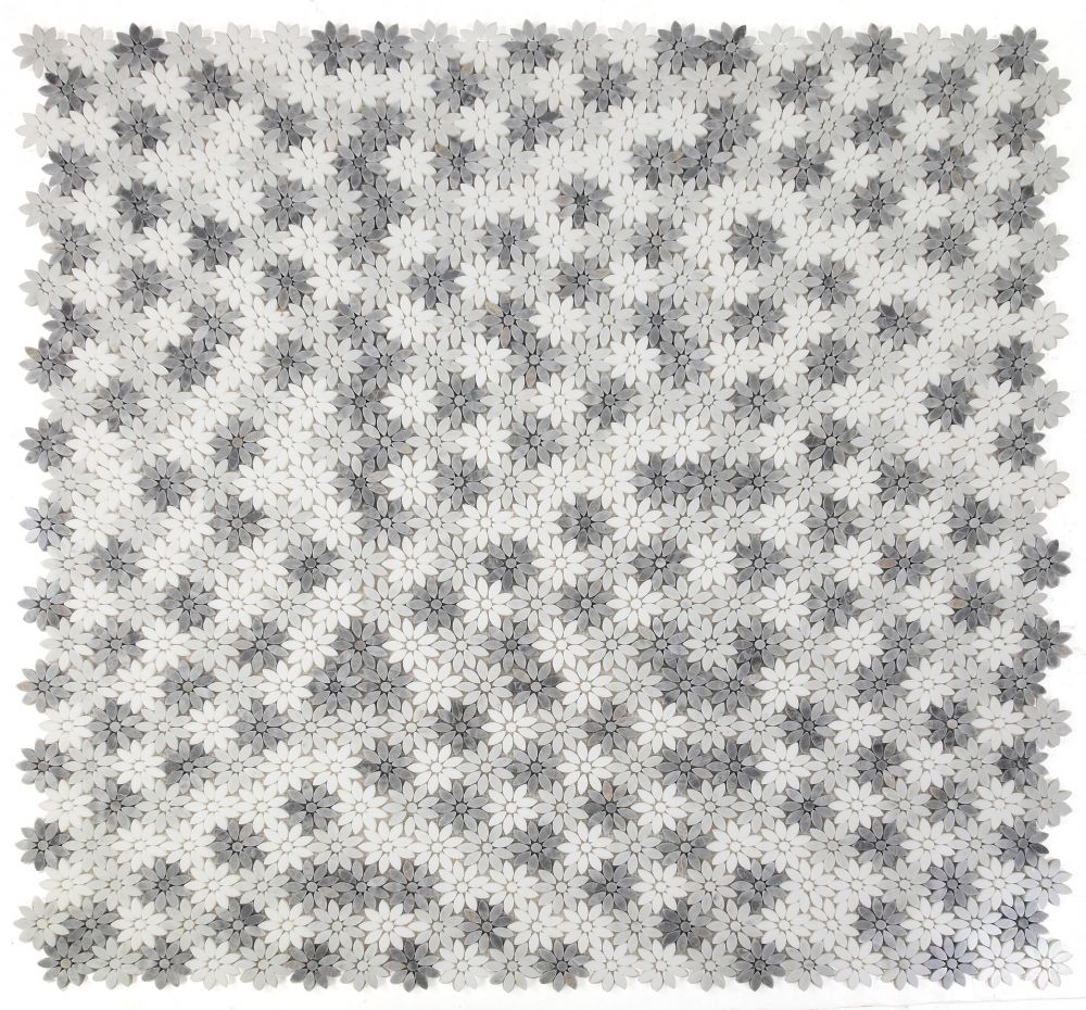 Product Sold By The SheetDaisy Wild Grey 12.5 x 13 – A mix of white and grey marbles in a mini flower pattern.Suggested Grout Color: TBDWARNING: This product can expose you to chemicals including crystalline silica (airborne particles of respirable size) in dust created during fabrication/installation if the product is dry cut/ground or pulverized, which are known to the State of California to cause cancer. For more information, go to https://www.p65warnings.ca.gov/.