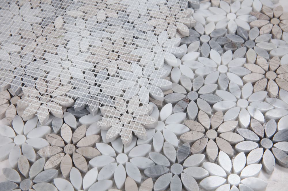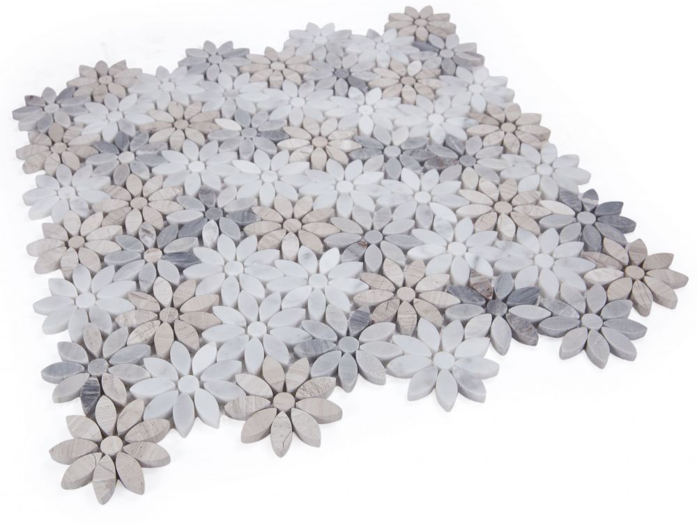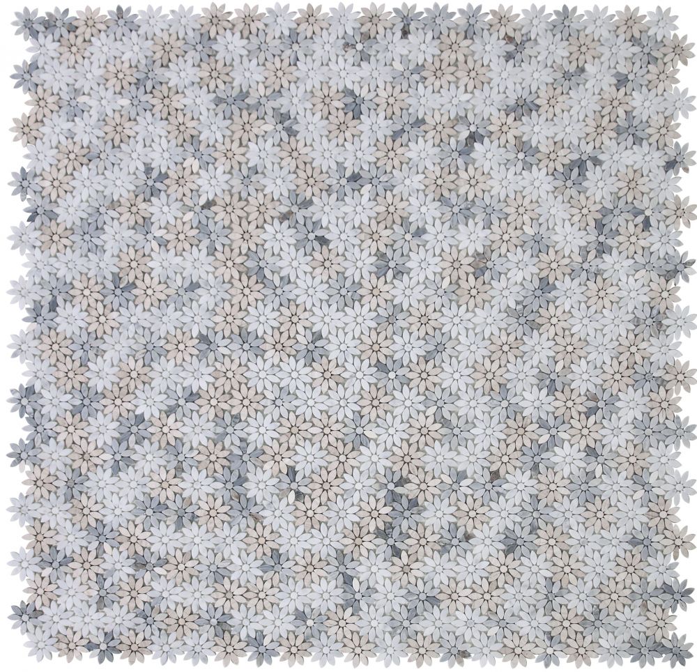 Product Sold By The SheetDaisy Series: Daisy Wild Sky 12.5×12.75 – A mix of Palissandro Blue, Haisa Grey and Carrara Marble in mini flower pattern.Suggested Grout Color: Bostik Trucolor Classic Bone H158WARNING: This product can expose you to chemicals including crystalline silica (airborne particles of respirable size) in dust created during fabrication/installation if the product is dry cut/ground or pulverized, which are known to the State of California to cause cancer. For more information, go to https://www.p65warnings.ca.gov/.