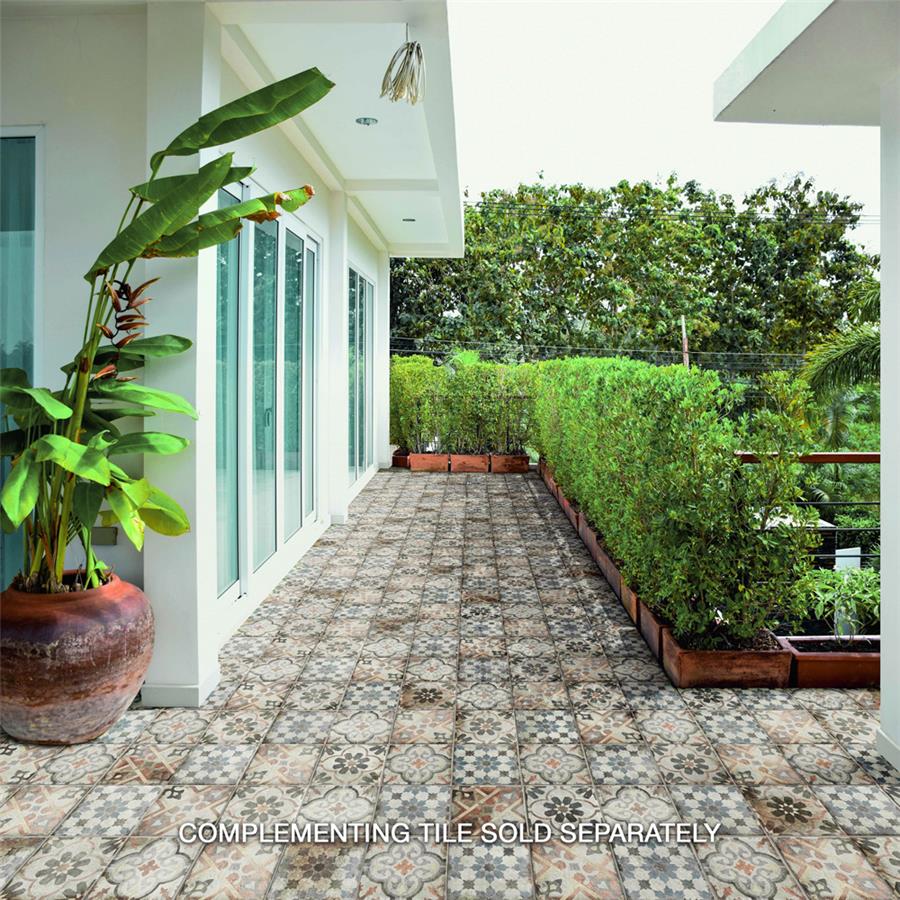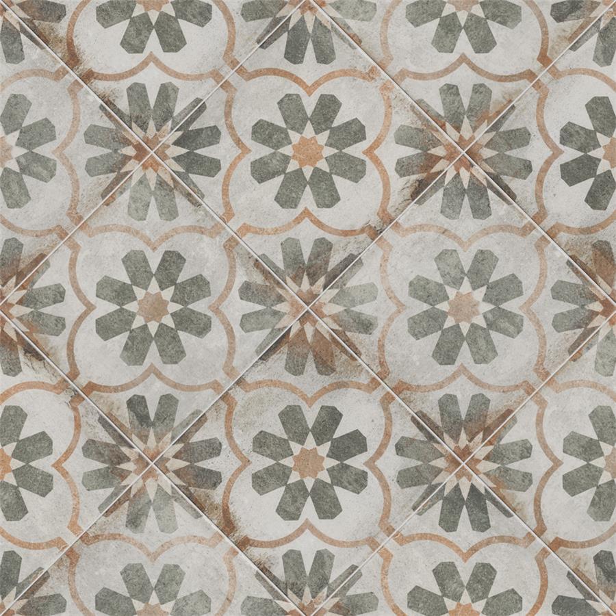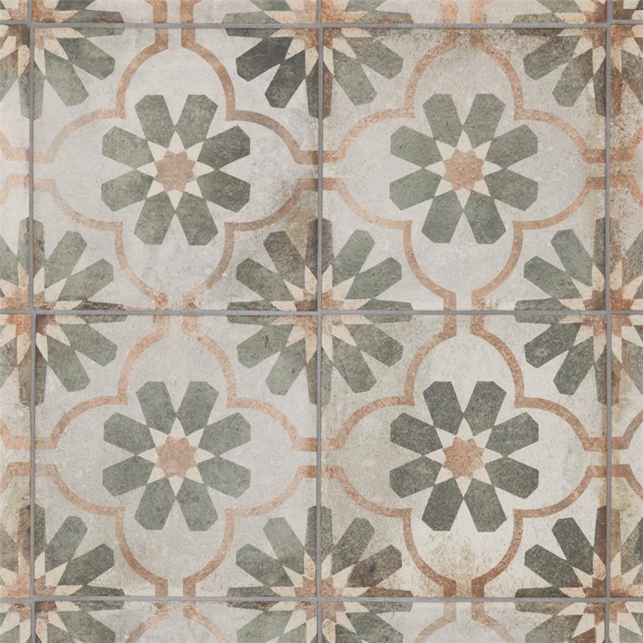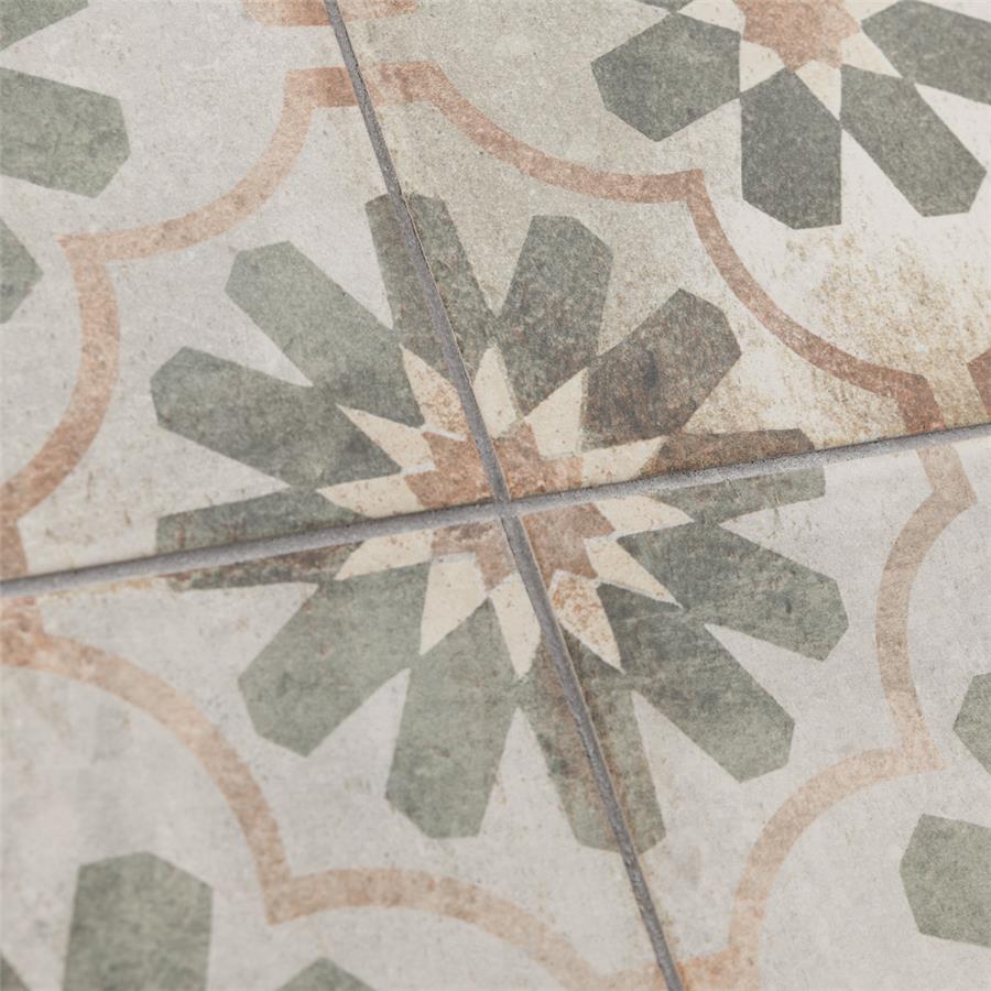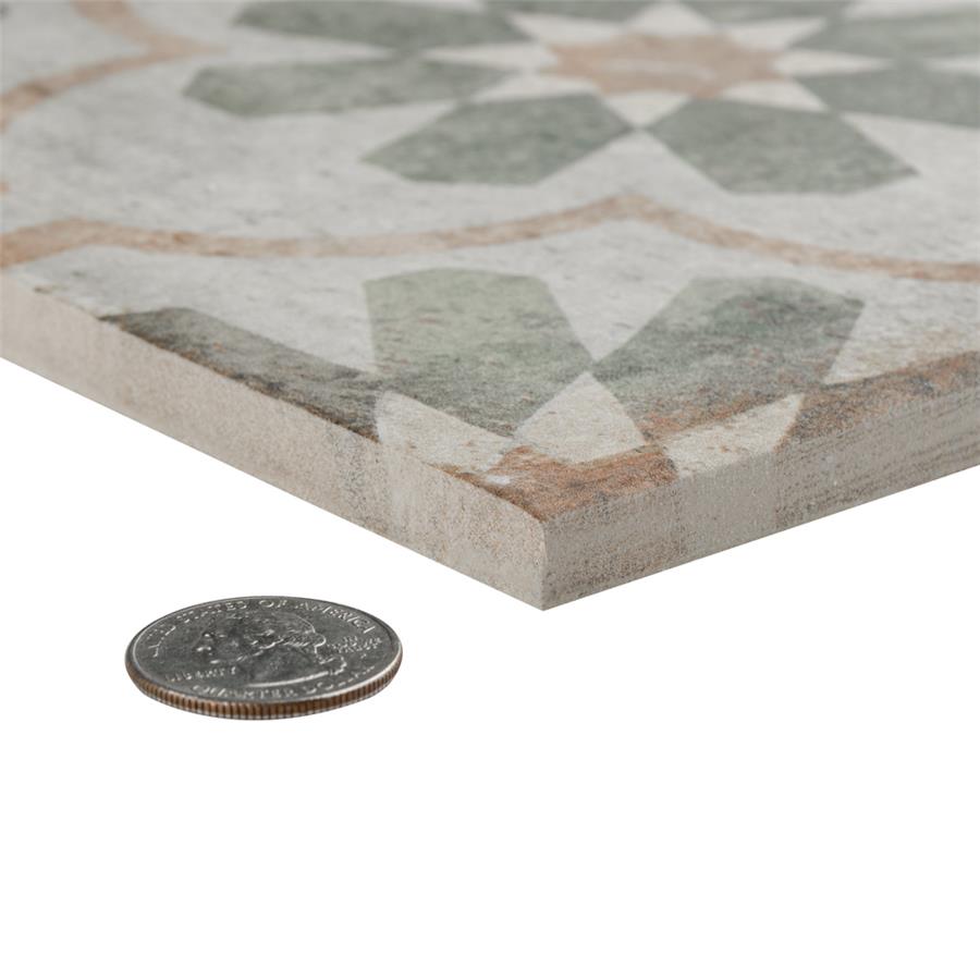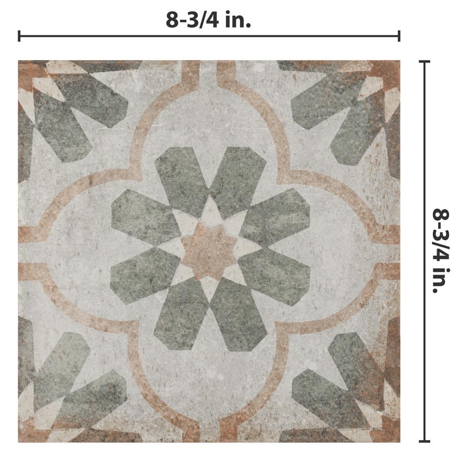 Our D’Anticatto Decor Florence 8-3/4 in. x 8-3/4 in. Porcelain Floor and Wall Tile radiates rustic charm. Mimicking a worn cement appearance, this porcelain tile is a subtle statement piece created by geometric motifs in faded pastel shades of moss green, light yellow and tawny set on a textured light beige base glaze. With rust colored accents and realistic imitations of scuffs and spots, this encaustic inspired tile evokes a loved, worn and century-old appearance. Available in twenty-five print variations that are randomly scattered throughout each case, the variation throughout each tile mimics an authentic aged appearance. Its impervious, frost-resistant and durable features make this tile and ideal choice for both indoor and outdoor residential installations including, backsplashes, kitchens, bathrooms, showers, entryways and patios. This tile is a perfect choice on its own or paired with other products in the D’Anticatto Collection.Tile is the better choice for your space. This tile is made from natural ingredients, making it a healthy choice as it is free from allergens, VOCs, formaldehyde and PVC.