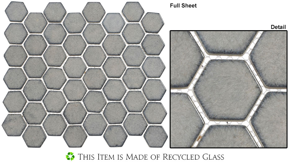 Tile Size: 2″ HexSheet Size: 11″ x 12 3/4″Sheet Coverage: .98 SQFRows Per Sheet: 8Tiles Per Sheet: 48Cut into Borders: Every 2 rowsTile Thickness: 9/32″ (7mm)Grout Joint: 1/16″ (2mm)Mesh Mounted: YesThis Item is Made of Recycled GlassDue to the variance in installation methods, grout colors, lighting, image variances and computer monitor settings; the images above may not accurately represent the true color of the products after installation.Therefore Glazzio Tiles always recommends that tiles not be purchased from an image of any kind.