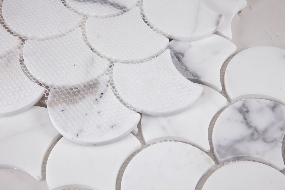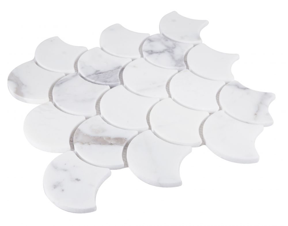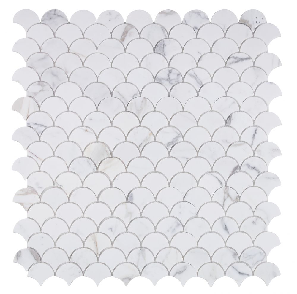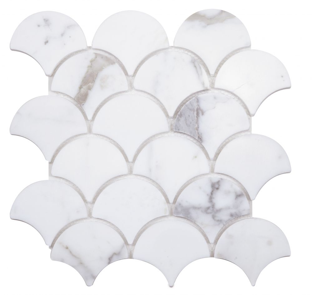 Product Sold By The SheetPrecious Stone series: Dragon Scale Calacatta Gold 9.75×10. Calacatta Gold marble precisely cut to create a Dragon Scale pattern mosaic. (10 pcs / box)Suggested Grout Color: Bostik Trucolor Classic Bone H158WARNING: This product can expose you to chemicals including crystalline silica (airborne particles of respirable size) in dust created during fabrication/installation if the product is dry cut/ground or pulverized, which are known to the State of California to cause cancer. For more information, go to https://www.p65warnings.ca.gov/.