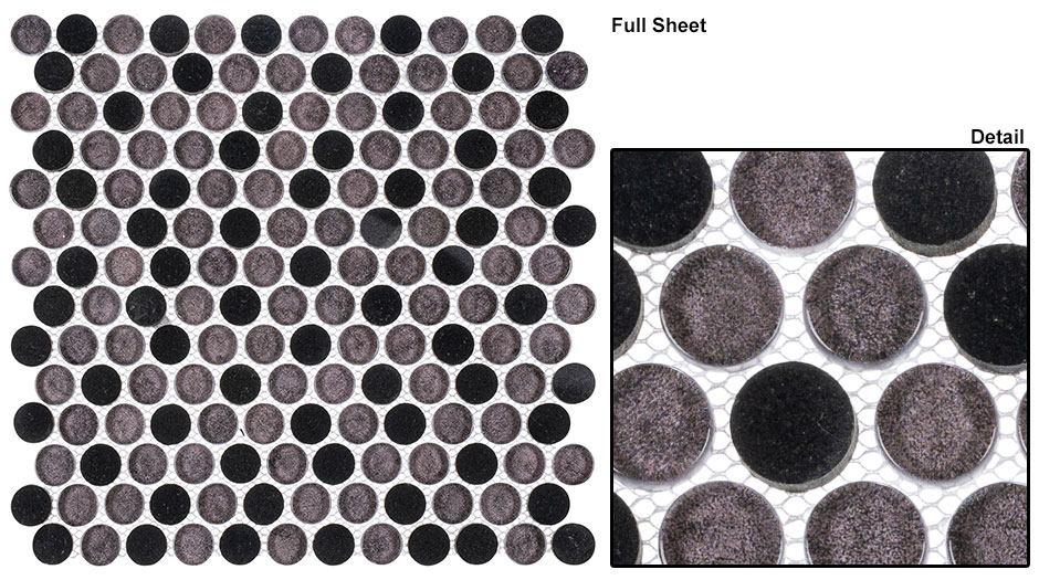 Tile Size: Penny roundsSheet Size: 11 15/16″ x 12 1/16″Sheet Coverage: 1 SQFRows per Sheet: 14Tiles per Sheet: 168Cut into Borders: Every 2 rowsTile Thickness: 6 mmGrout Joint: 1/16″ (2 mm)Mesh Mounted: YesDue to the variance in installation methods, grout colors, lighting, image variances and computer monitor settings; the images above may not accurately represent the true color of the products after installation.Therefore Glazzio Tiles always recommends that tiles not be purchased from an image of any kind.