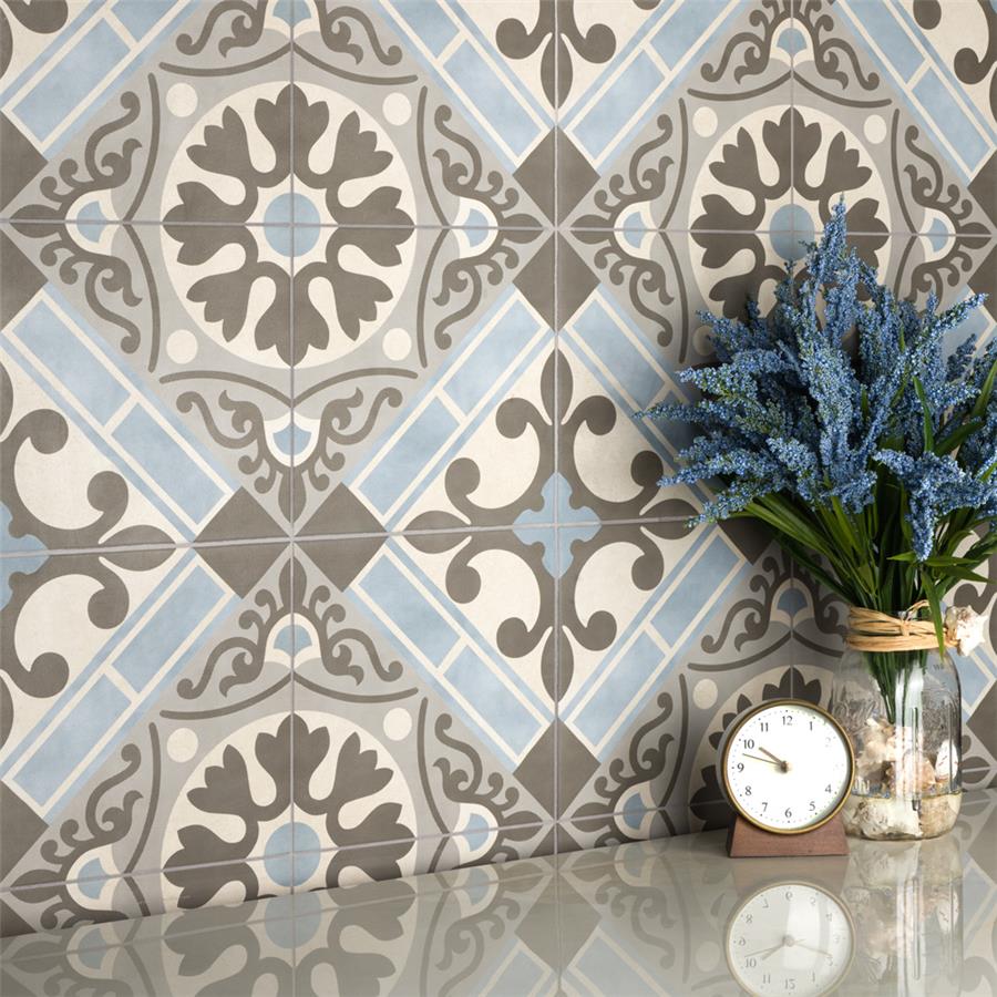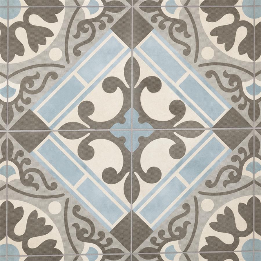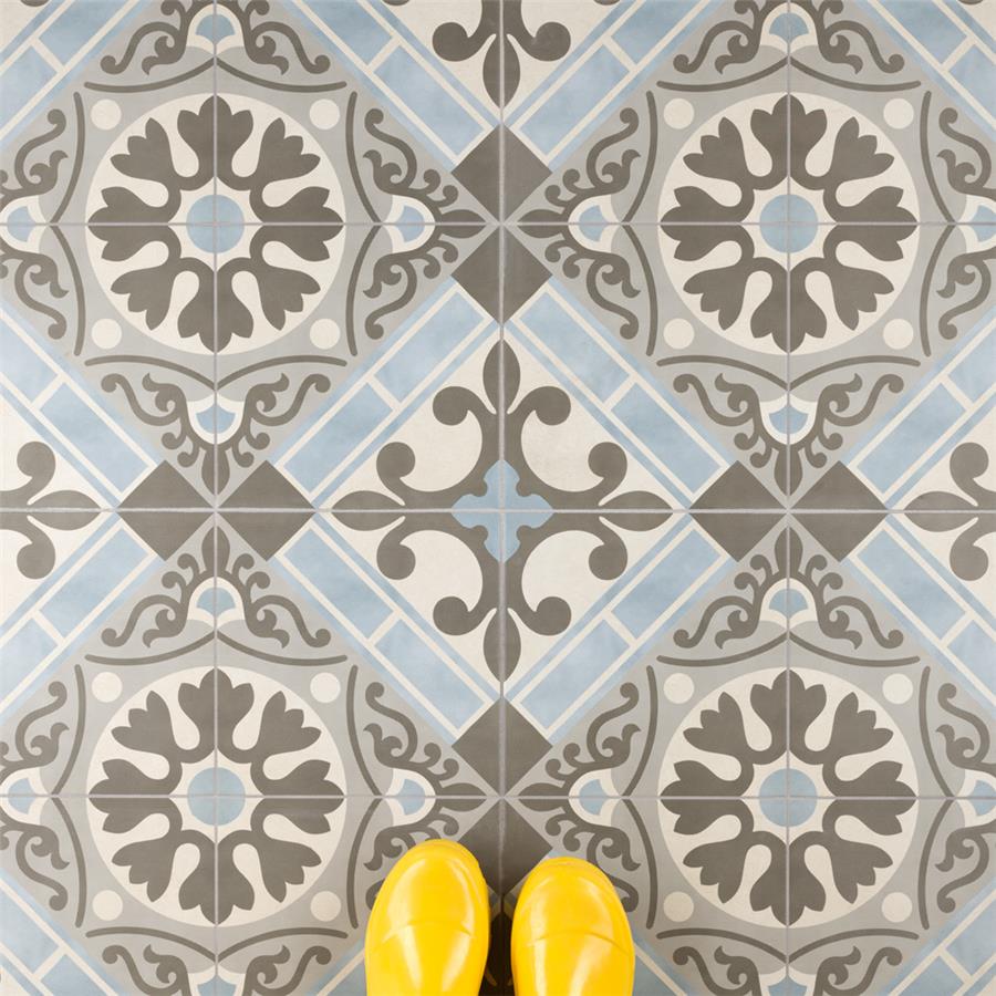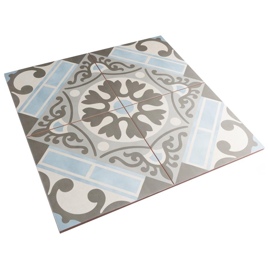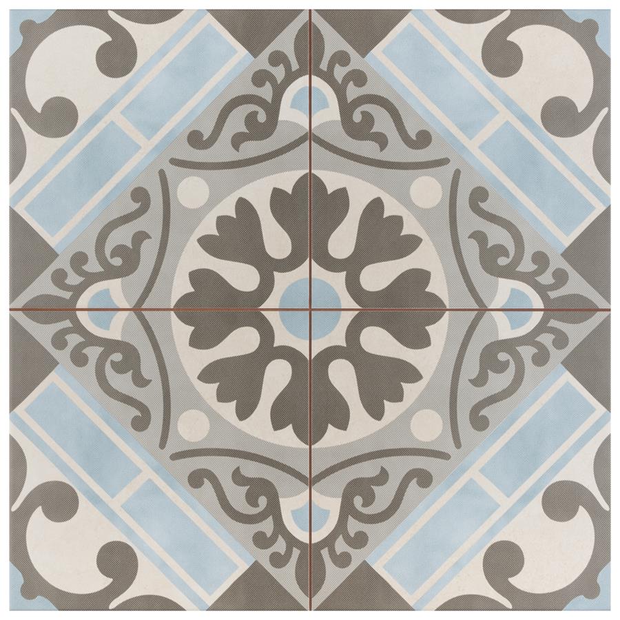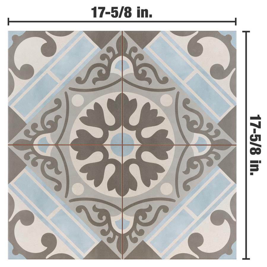 Old-world European elegance radiates from our Evasion Azul 17-5/8 in. x 17-5/8 in. Ceramic Floor and Wall Tile, imported from Spain. Save time and labor spent arranging smaller square tiles and instead install these durable ceramic slabs, which have four 8-3/4 in. squares with realistic lines in between to mimic grout. Set on a beige base glaze, this encaustic-inspired tile features designs in muted baby blue, light smoky grey and a darker dove grey. Slight speckles throughout the surface provide the tile with a textured feel. Imitations of scuffs and spots that are the marks of well-loved, worn, century-old tile bring rustic charm to your interior. The scored grout lines can be grouted with the color of your choice to further customize your installation. Use this tile in most interior settings, including kitchens, showers, backsplashes and entryways.