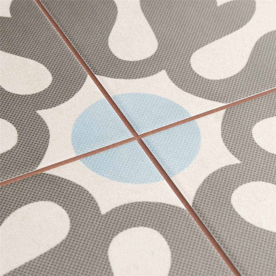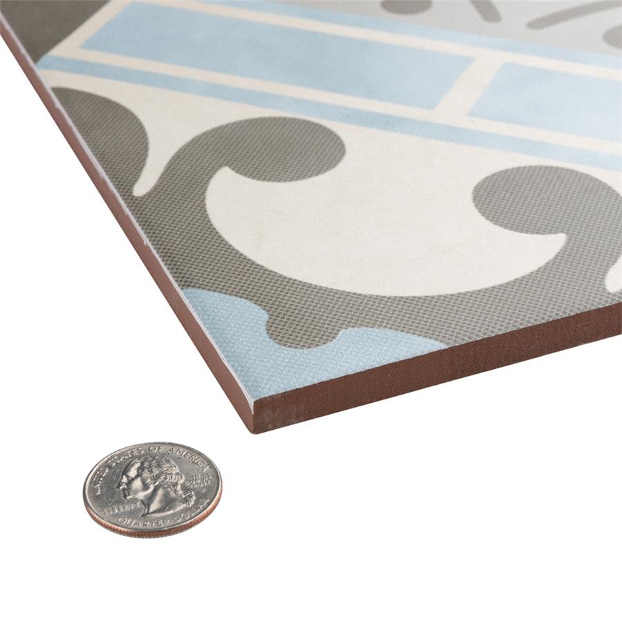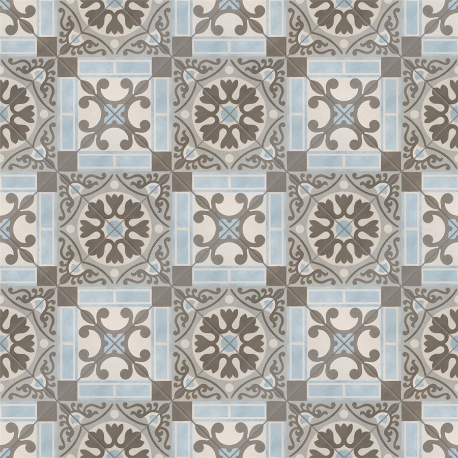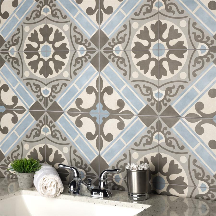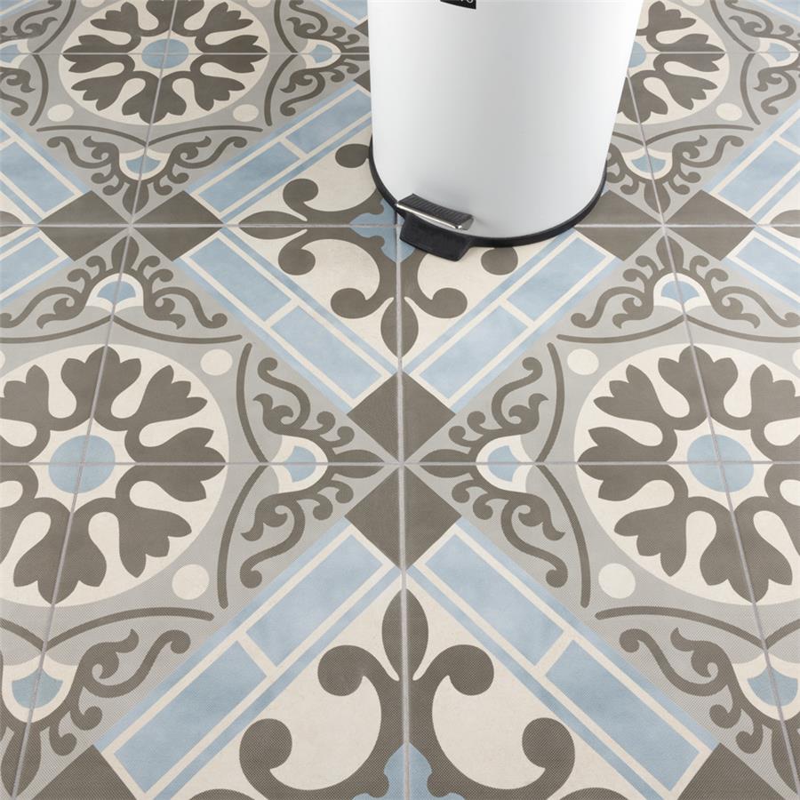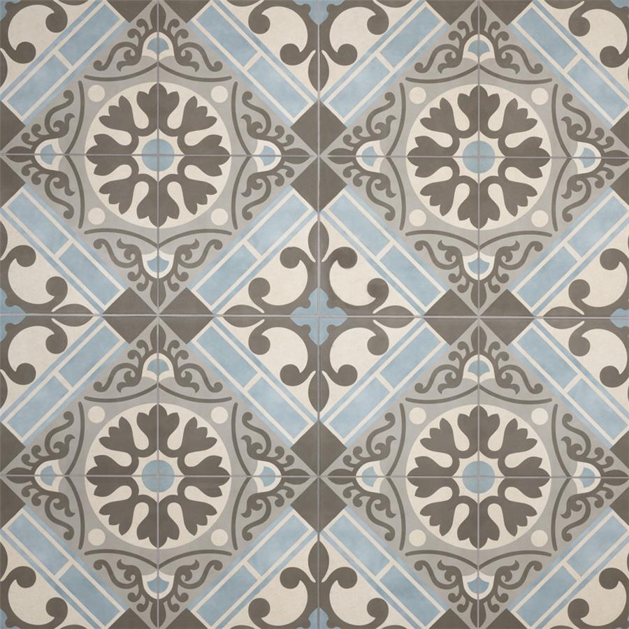 Old-world European elegance radiates from our Evasion Azul 17-5/8 in. x 17-5/8 in. Ceramic Floor and Wall Tile, imported from Spain. Save time and labor spent arranging smaller square tiles and instead install these durable ceramic slabs, which have four 8-3/4 in. squares with realistic lines in between to mimic grout. Set on a beige base glaze, this encaustic-inspired tile features designs in muted baby blue, light smoky grey and a darker dove grey. Slight speckles throughout the surface provide the tile with a textured feel. Imitations of scuffs and spots that are the marks of well-loved, worn, century-old tile bring rustic charm to your interior. The scored grout lines can be grouted with the color of your choice to further customize your installation. Use this tile in most interior settings, including kitchens, showers, backsplashes and entryways.
