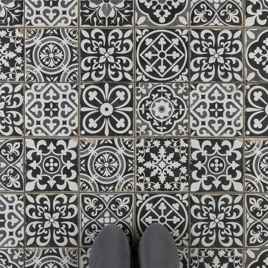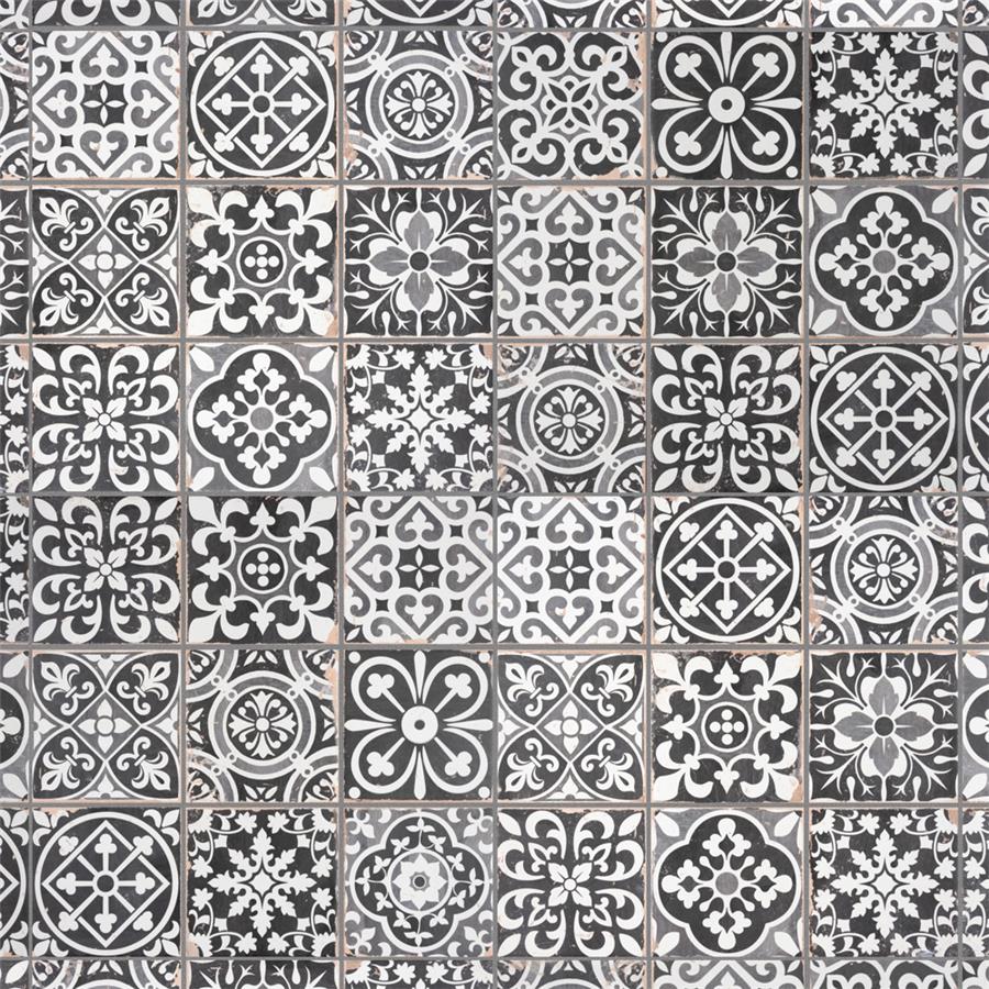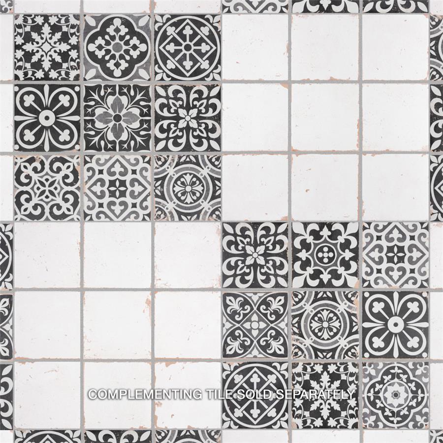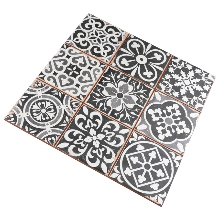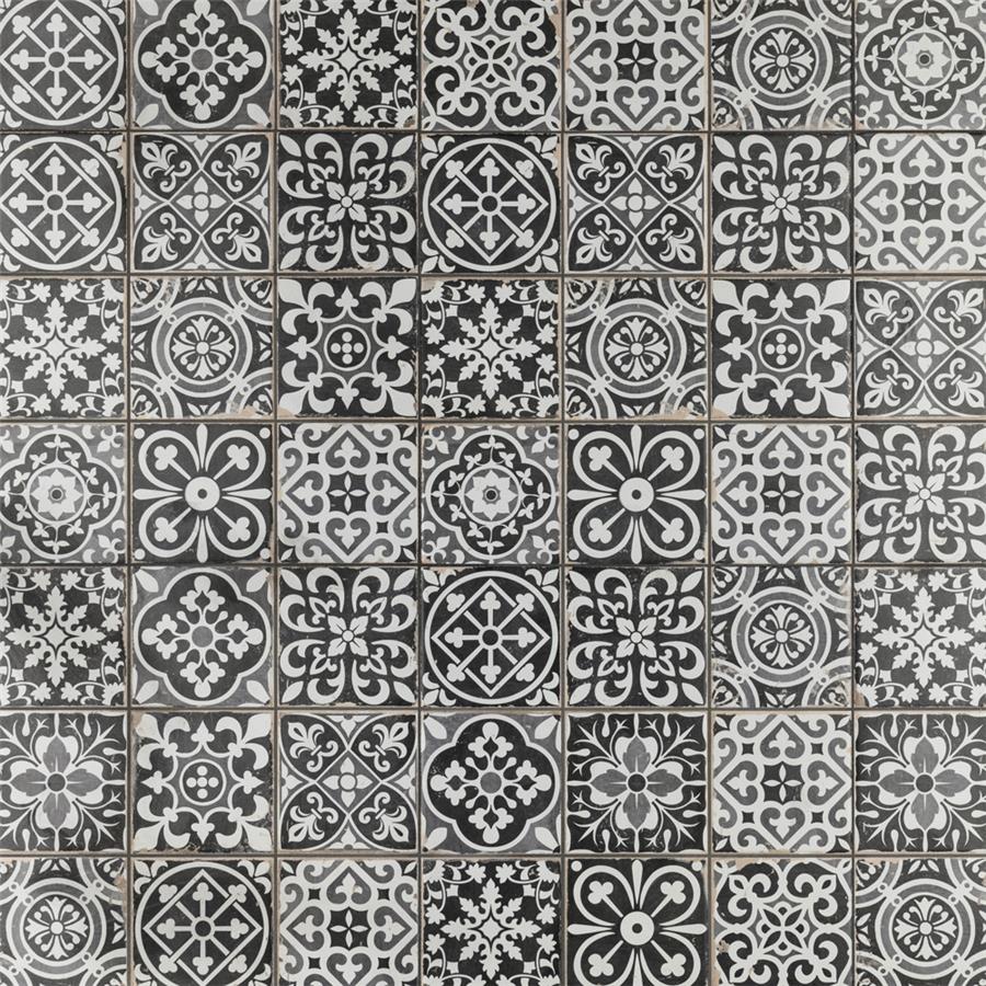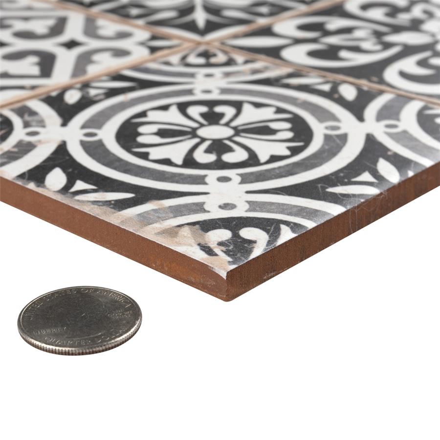 It is easy to picture sun-drenched streets of Spain when looking at our Faenza Nero 13 in. x 13 in. Ceramic Floor and Wall Tile. Save time and labor spent arranging smaller square tiles and instead install these durable ceramic slabs, which have nine squares separated by scored grout lines. This breathtaking black glaze features a collection of encaustic-inspired designs. Imitations of the scuffs and spots that are the marks of well-loved, worn, century-old tile and the rich red tones peeking through are the perfect contrast to the faded grays and black. These rustic scuffs and spots convince that this tile is truly aged. There are 3 different variations of scuffs andF pattern arrangements available that are randomly scattered throughout each case, offering a sporadic patchwork look. Designed by interior architect and furniture designer Francisco Segarra, this tile is a true reflection of vintage industrial design. The scored grout lines can be grouted with the color of your choice to further customize your installation.