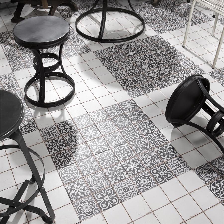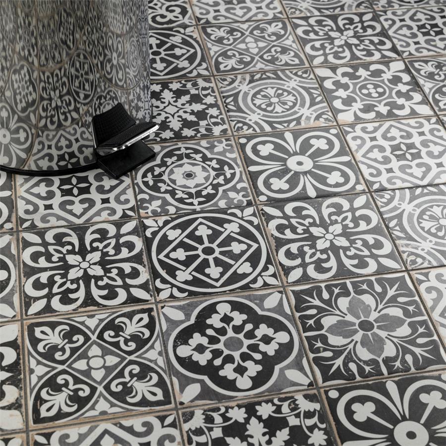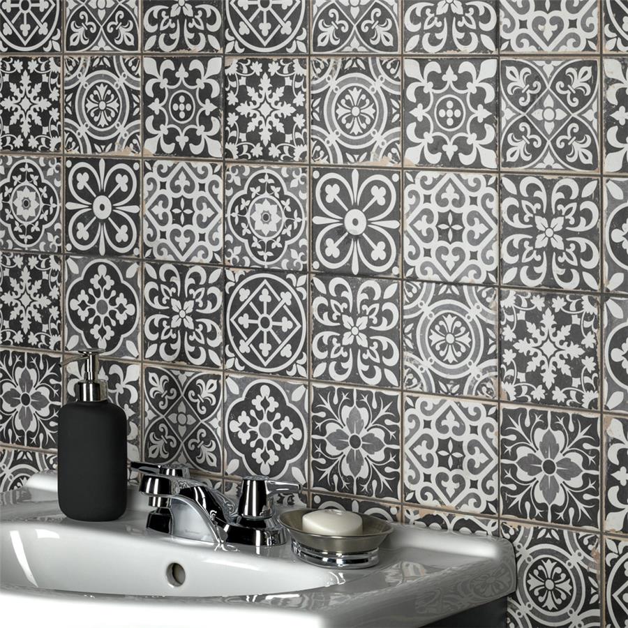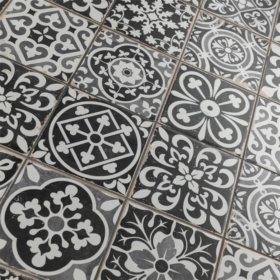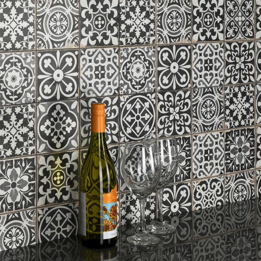 It is easy to picture sun-drenched streets of Spain when looking at our Faenza Nero 13 in. x 13 in. Ceramic Floor and Wall Tile. Save time and labor spent arranging smaller square tiles and instead install these durable ceramic slabs, which have nine squares separated by scored grout lines. This breathtaking black glaze features a collection of encaustic-inspired designs. Imitations of the scuffs and spots that are the marks of well-loved, worn, century-old tile and the rich red tones peeking through are the perfect contrast to the faded grays and black. These rustic scuffs and spots convince that this tile is truly aged. There are 3 different variations of scuffs andF pattern arrangements available that are randomly scattered throughout each case, offering a sporadic patchwork look. Designed by interior architect and furniture designer Francisco Segarra, this tile is a true reflection of vintage industrial design. The scored grout lines can be grouted with the color of your choice to further customize your installation.