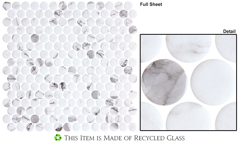 Tile Size: 3/4″ Penny RoundSheet Size: 11 1/8″ x 11 1/4″Sheet Coverage: .87 SQFRows Per Sheet: 16Tiles Per Sheet: 224Cut into Borders: Every 2 rowsTile Thickness: 1/4″ (6mm)Grout Joint: 1/16″ (2mm)Mesh Mounted: Yes This Item is Made of Recycled GlassDue to the variance in installation methods, grout colors, lighting, image variances and computer monitor settings; the images above may not accurately represent the true color of the products after installation.Therefore Glazzio Tiles always recommends that tiles not be purchased from an image of any kind.