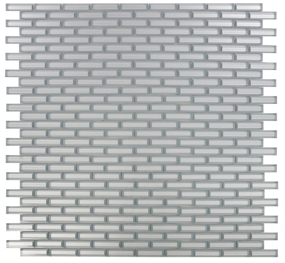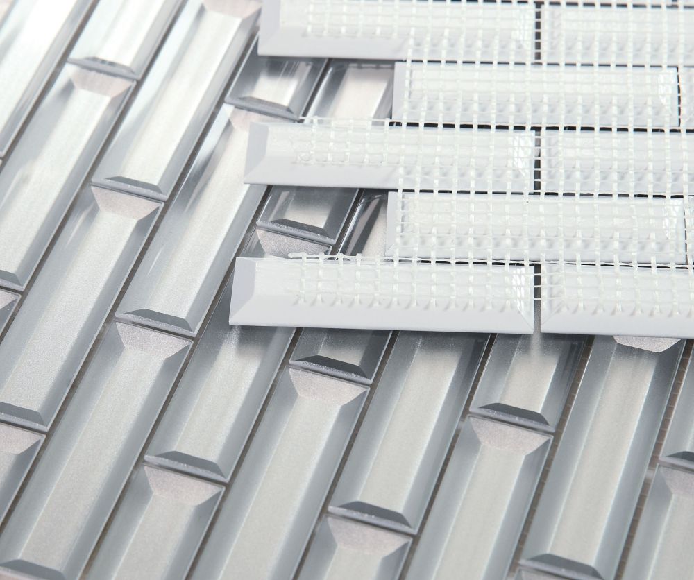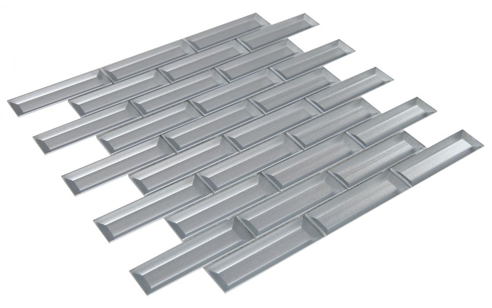 Linear Series: Fierro Silver 11.75×11.75 – Silver colored beveled-look glass in 1×4 subway pattern.