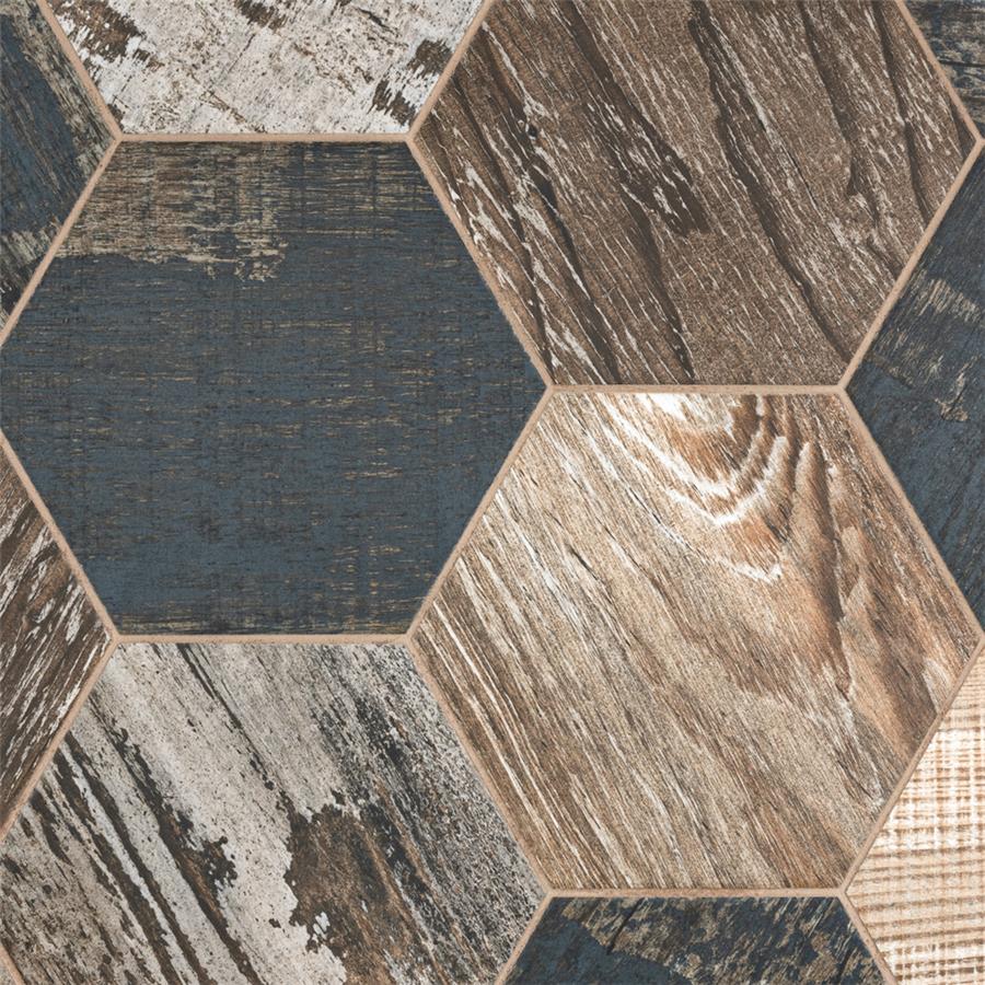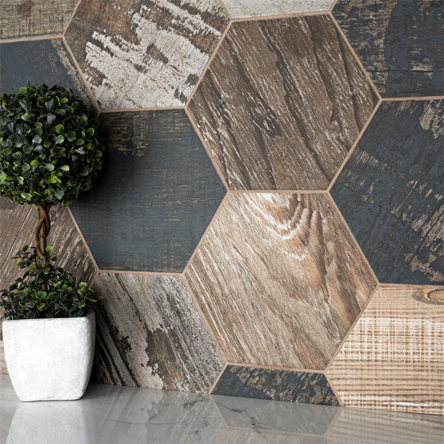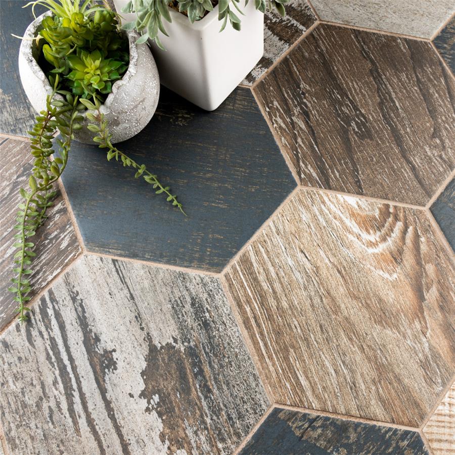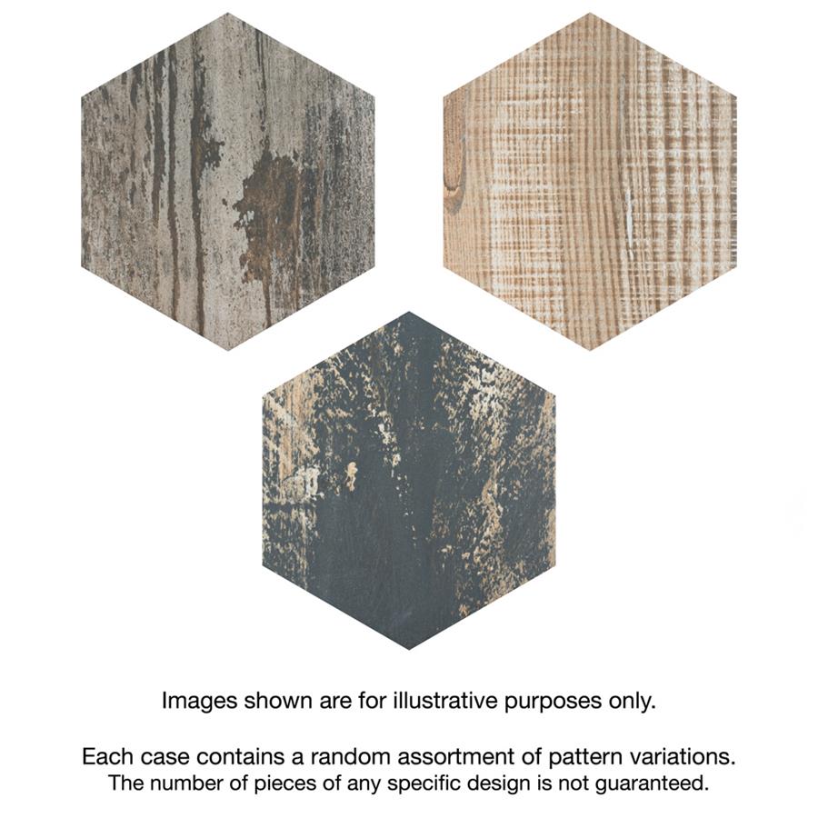 The SomerTile Gaugin Hex Catan Shadow 8-5/8 in. x 9-7/8 in. Porcelain Floor and Wall Tile is a breathtaking addition to our collection of wood-look tiles. Crafted in Spain, the brown glaze features a meticulously detailed grain accented in white, grey, and blue. To add further contrast and depth, this tile has a visible grain and knot design that echo the look of real wood. The finishing touch on this hexagon is the imitations of scuffs and spots, which gives this tile an antiquated appearance reminiscent of distressed painted wood. This porcelain tile has 20 different print variations for a one-of-a-kind look. This impervious, matte tile will look great in most indoor or outdoor wall and floor installations.Tile is the better choice for your space. This tile is made from natural ingredients, making it a healthy choice as it is free from allergens, VOCs, formaldehyde and PVC.