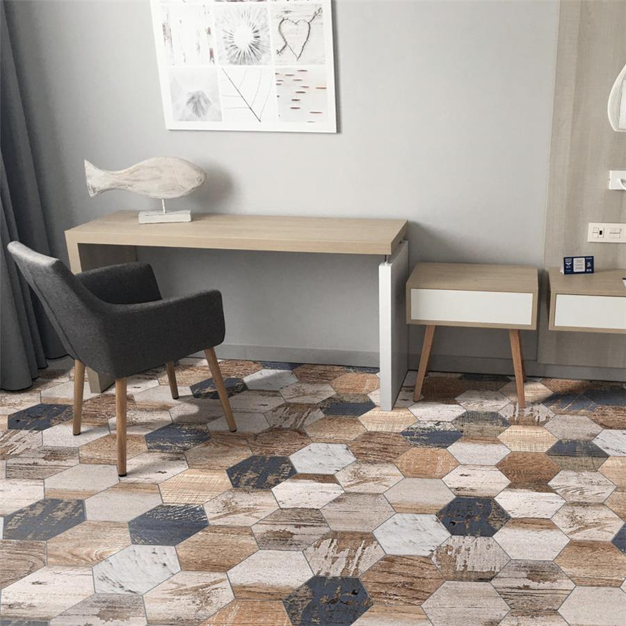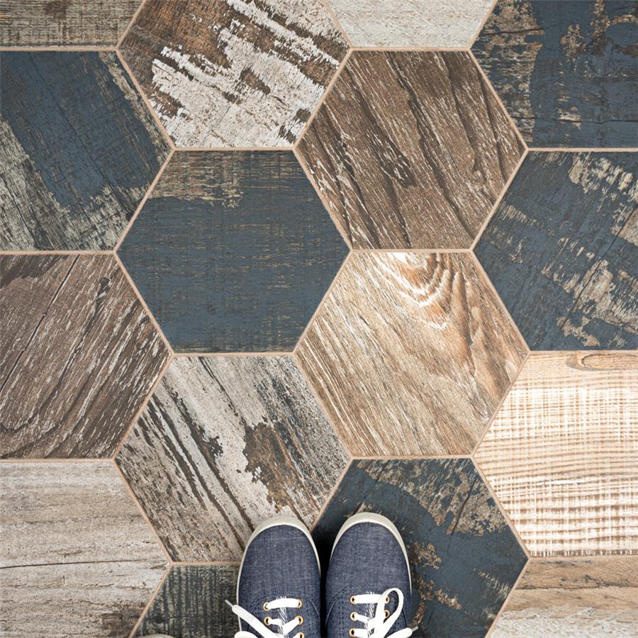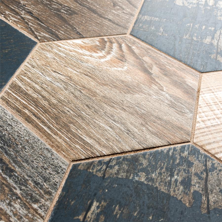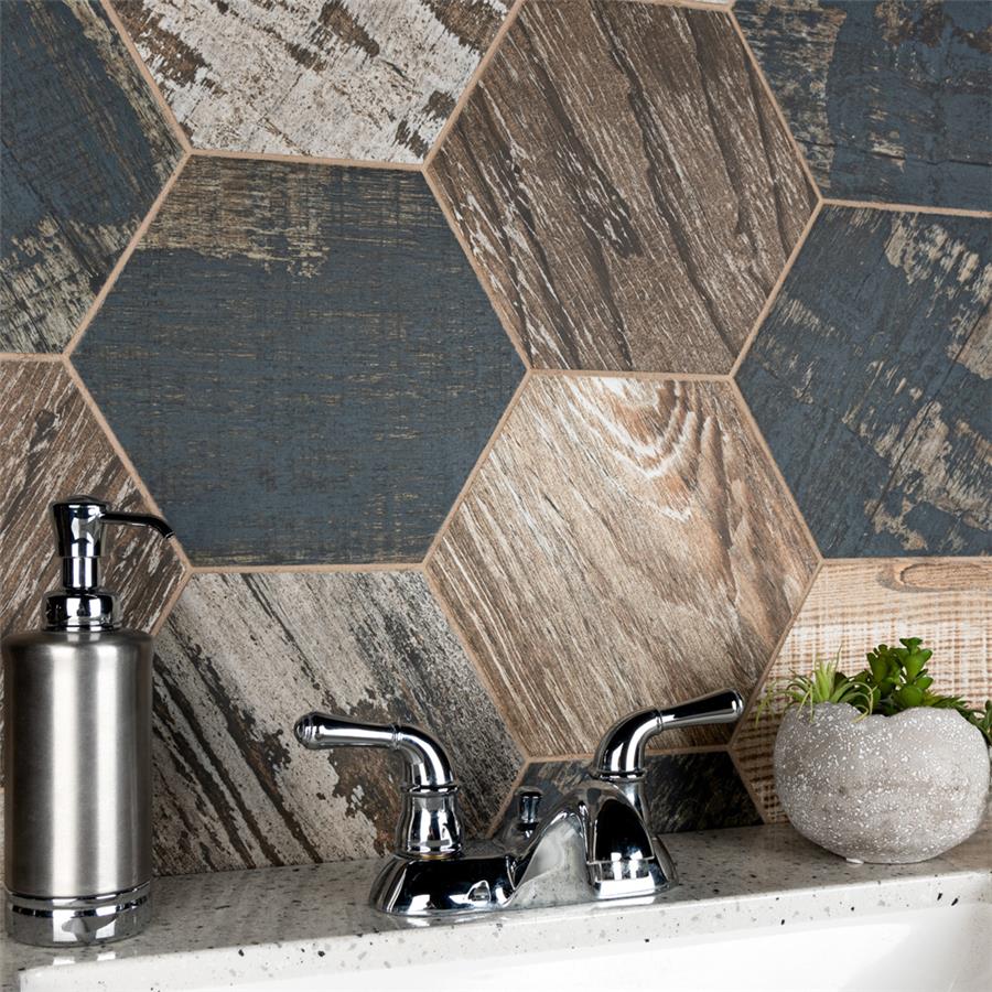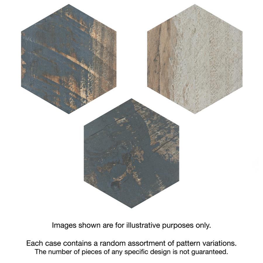 The SomerTile Gaugin Hex Catan Shadow 8-5/8 in. x 9-7/8 in. Porcelain Floor and Wall Tile is a breathtaking addition to our collection of wood-look tiles. Crafted in Spain, the brown glaze features a meticulously detailed grain accented in white, grey, and blue. To add further contrast and depth, this tile has a visible grain and knot design that echo the look of real wood. The finishing touch on this hexagon is the imitations of scuffs and spots, which gives this tile an antiquated appearance reminiscent of distressed painted wood. This porcelain tile has 20 different print variations for a one-of-a-kind look. This impervious, matte tile will look great in most indoor or outdoor wall and floor installations.Tile is the better choice for your space. This tile is made from natural ingredients, making it a healthy choice as it is free from allergens, VOCs, formaldehyde and PVC.