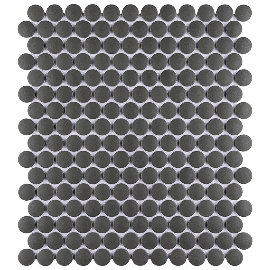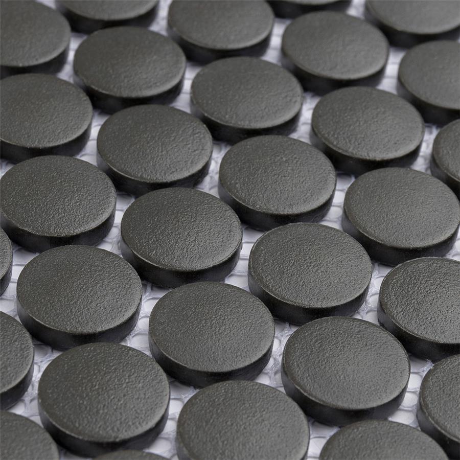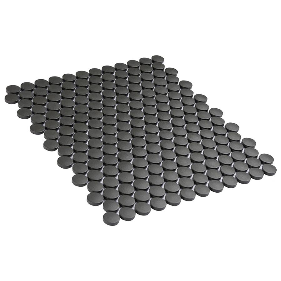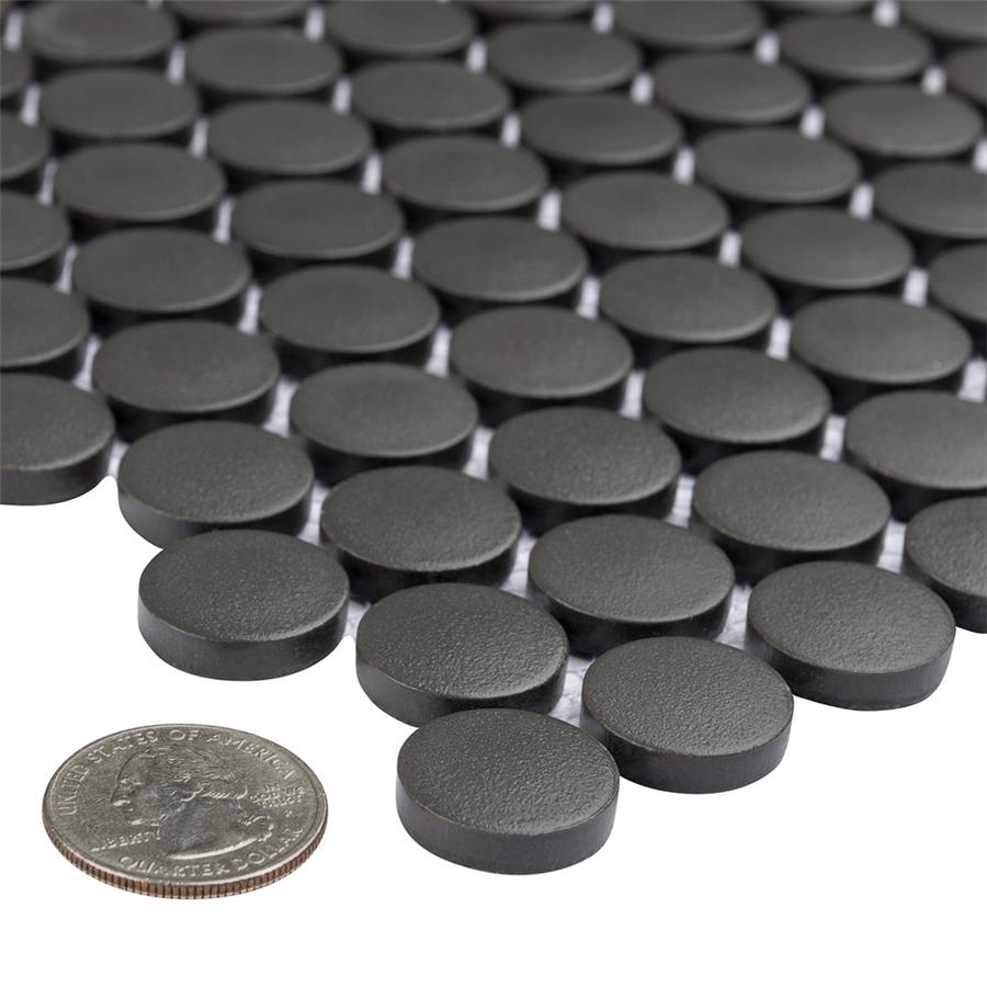 Transform your space into a tribute to retro design with our Gotham Penny Round Black 9-3/4” x 11-1/2” Unglazed Porcelain Mosaic Tile. As a modern deviation from the classic mosaic, this fresh option is a throwback to traditional retro design with a contemporary feel. Unglazed charcoal black penny rounds are arranged on an interlocking mesh to create a seamless installation. This minimalistic porcelain mosaic is unique yet simplistic enough to integrate into any design, ranging from traditional style renovations to modern home projects. Its impervious and frost-proof features make this an ideal tile for both commercial and residential indoor and outdoor use, including backsplashes, bathrooms, showers, kitchens and entryways. Tile is the better choice for your space. This tile is made from natural ingredients, making it a healthy choice as it is free from allergens, VOCs, formaldehyde and PVC. Note: Due to the unglazed nature, we recommend sealing this tile.