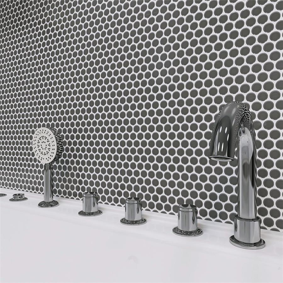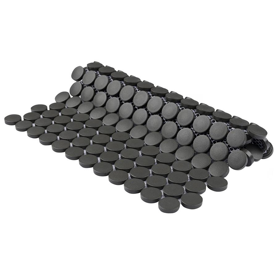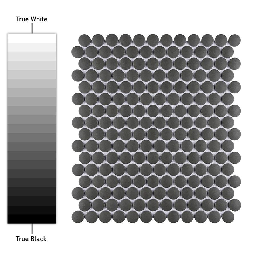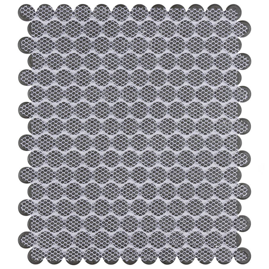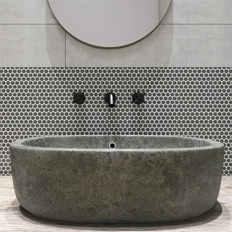 Transform your space into a tribute to retro design with our Gotham Penny Round Black 9-3/4” x 11-1/2” Unglazed Porcelain Mosaic Tile. As a modern deviation from the classic mosaic, this fresh option is a throwback to traditional retro design with a contemporary feel. Unglazed charcoal black penny rounds are arranged on an interlocking mesh to create a seamless installation. This minimalistic porcelain mosaic is unique yet simplistic enough to integrate into any design, ranging from traditional style renovations to modern home projects. Its impervious and frost-proof features make this an ideal tile for both commercial and residential indoor and outdoor use, including backsplashes, bathrooms, showers, kitchens and entryways. Tile is the better choice for your space. This tile is made from natural ingredients, making it a healthy choice as it is free from allergens, VOCs, formaldehyde and PVC. Note: Due to the unglazed nature, we recommend sealing this tile.