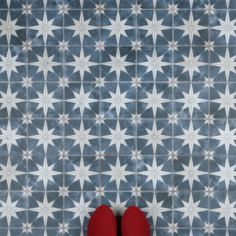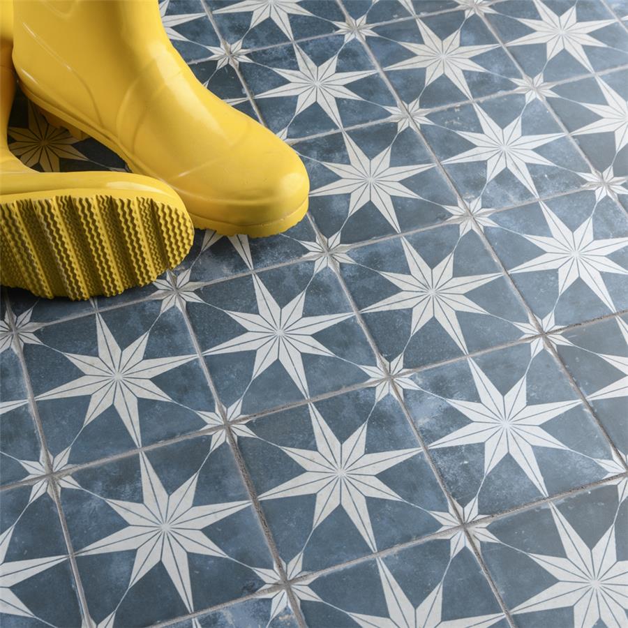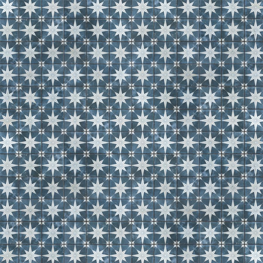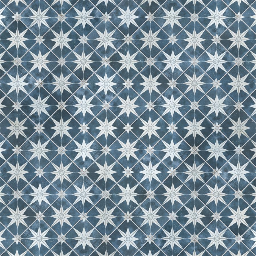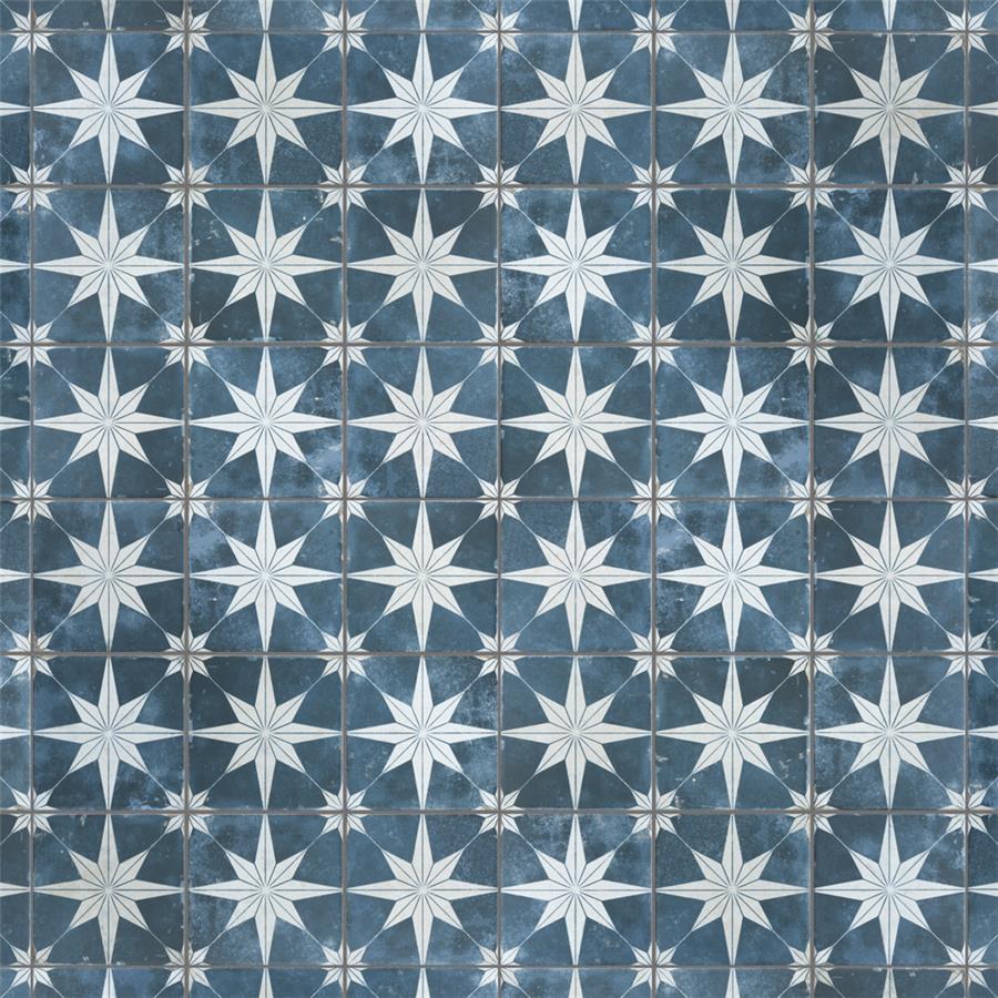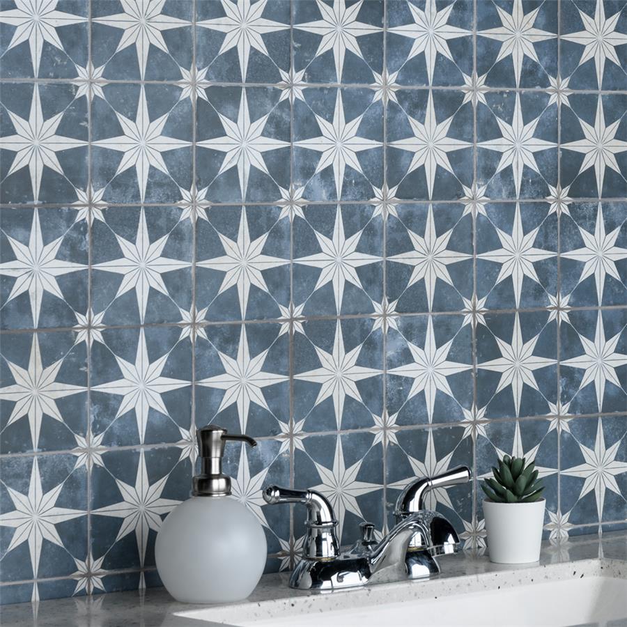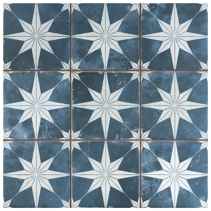Our Harmonia Kings Star Sky 13 in. x 13 in. Ceramic Floor and Wall Tile creates the look of a stunning leading-edge mosaic-like design with the harmonious, easy installation of a square tile. Inspired by our best-selling Kings Star Sky, this ceramic encaustic-inspired tile similarly features a unique, low-sheen glaze in faded denim blue tones with centered antique white star patterns in each square. With realistic imitations and scuffs and spots that are the marks of well-loved, worn, century-old tile, this floor and wall tile is a true reflection of vintage industrial design. These scuffs and spots convince that this tile is truly aged, bringing rustic charm to any interior setting. Save time and labor spent arranging mosaic sheets and instead install these durable ceramic slabs, which have squares separated by scored grout lines. The scored grout lines can be grouted with the color of your choice to further customize your installation. Its glazed and durable features make it an ideal choice for both commercial and residential indoor installations including kitchens, bathrooms, backsplashes, showers, and entryways. Tile is the better choice for your space. This tile is made from natural ingredients, making it a healthy choice as it is free from allergens, VOCs, formaldehyde and PVC.
