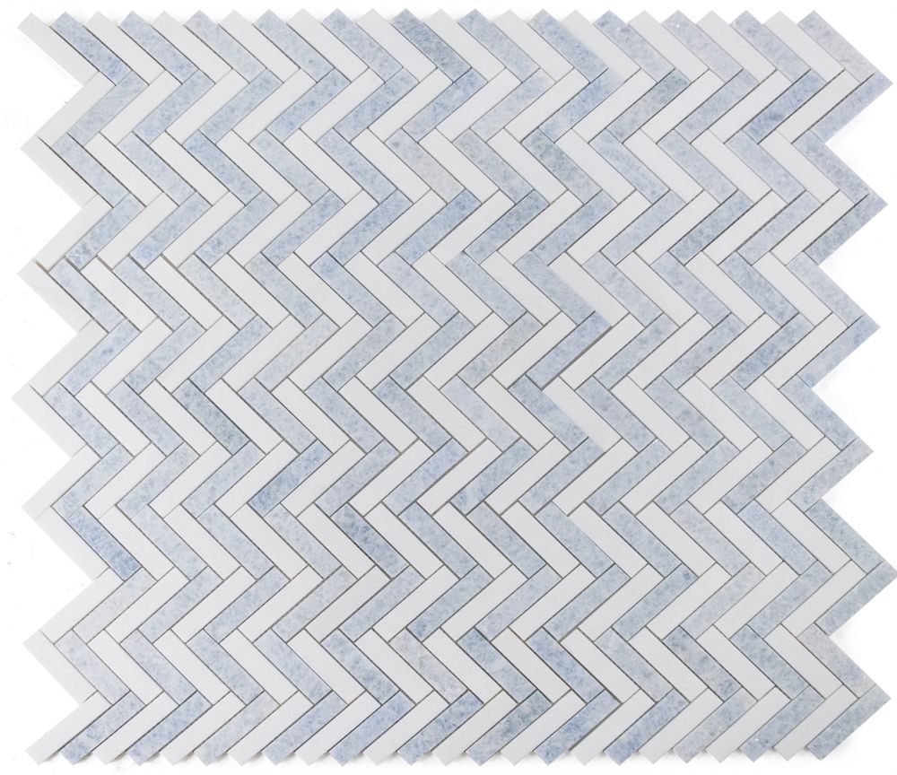 Product Sold By The SheetHerringbone Crystal Ocean 11.25×11.25 – Blue crystal and Thassos marble mosaic in herringbone pattern.Suggested Grout Color: Bostik Trucolor White H152WARNING: This product can expose you to chemicals including crystalline silica (airborne particles of respirable size) in dust created during fabrication/installation if the product is dry cut/ground or pulverized, which are known to the State of California to cause cancer. For more information, go to https://www.p65warnings.ca.gov/.