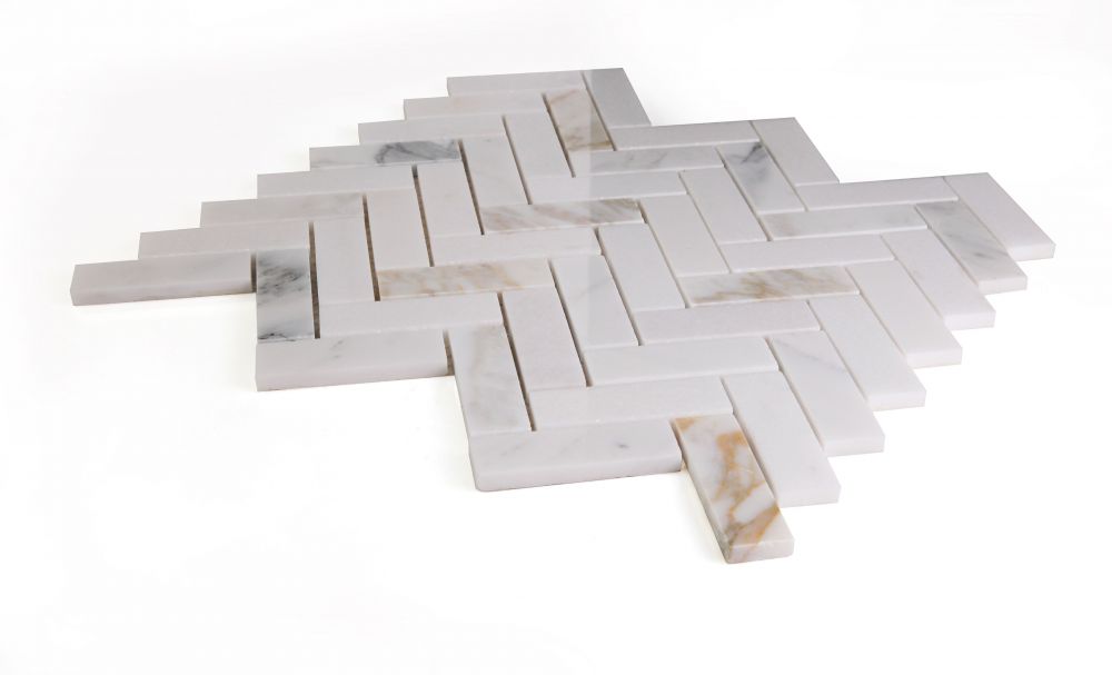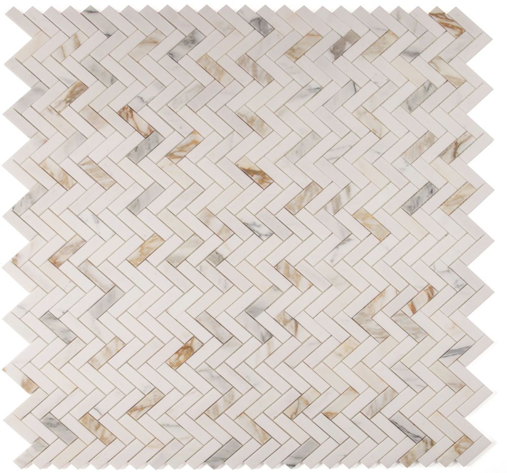Product Sold By The SheetHerringbone Sunrise 11×12.5 – 1×3 Calacatta Gold and Thassos Marble pieces in a Herringbone pattern.Suggested Grout Color: Bostik Trucolor White H152WARNING: This product can expose you to chemicals including crystalline silica (airborne particles of respirable size) in dust created during fabrication/installation if the product is dry cut/ground or pulverized, which are known to the State of California to cause cancer. For more information, go to https://www.p65warnings.ca.gov/.