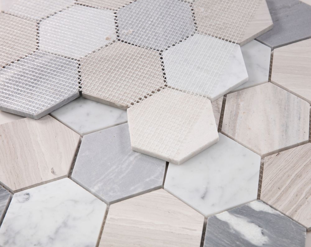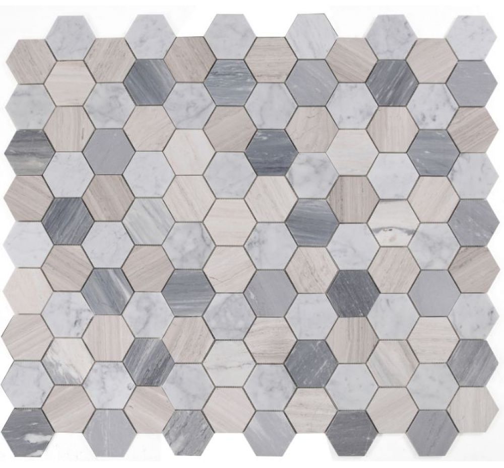 Product Sold By The SheetHexagon Blue Large 4 x 4 10.75×12.5 – A mix of Carrara and Blue Palissandro marble in 4×4 hexagon pieces. Previously named “Hexagon Big Blue 4 x 4”.Suggested Grout Color: TBDWARNING: This product can expose you to chemicals including crystalline silica (airborne particles of respirable size) in dust created during fabrication/installation if the product is dry cut/ground or pulverized, which are known to the State of California to cause cancer. For more information, go to https://www.p65warnings.ca.gov/.