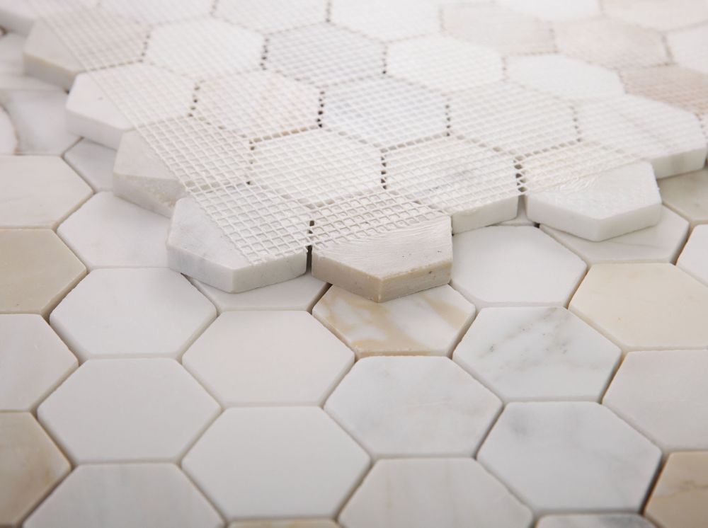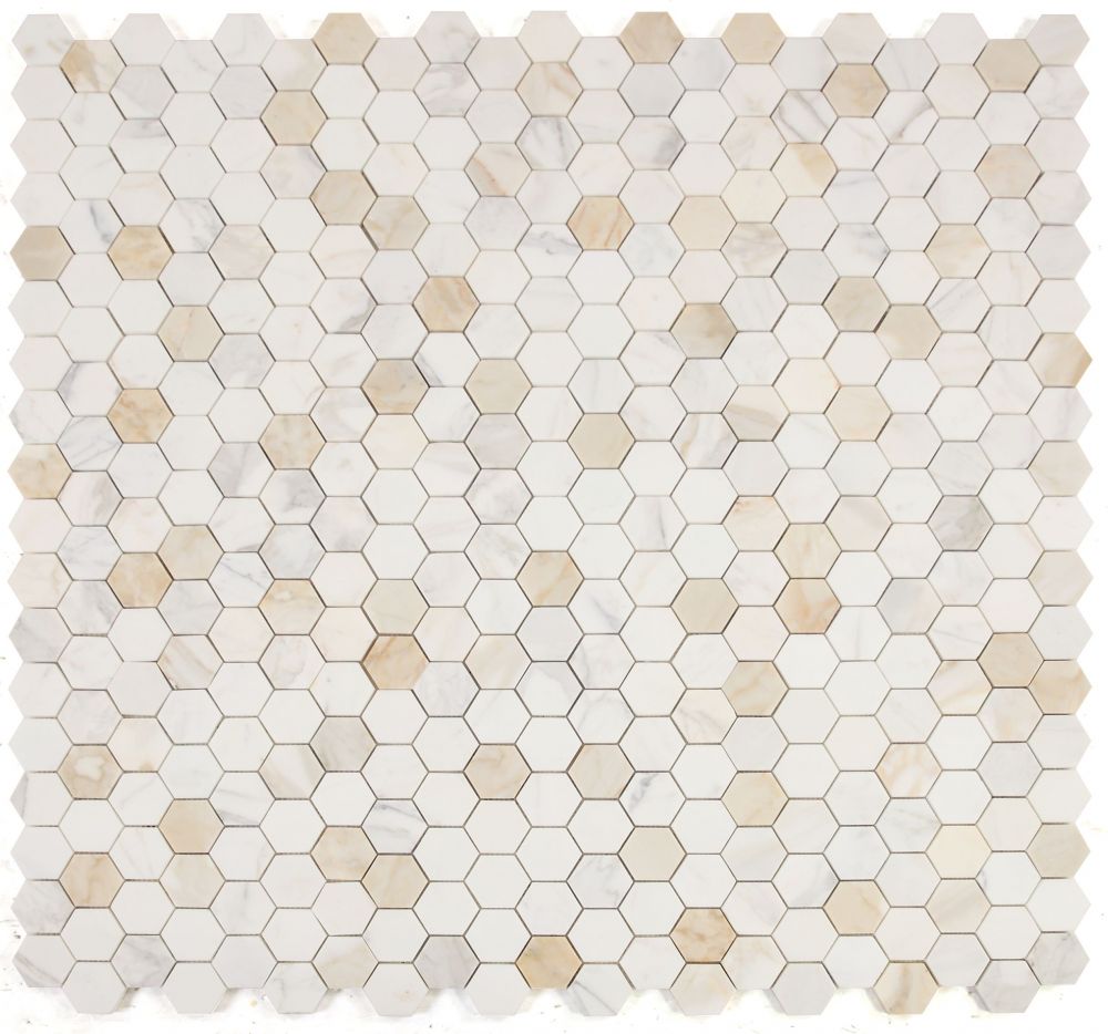 Product Sold By The SheetHexagon Series: Hexagon Calacatta Gold Honed 2×2. 11.75×12 sheet. Thickness: 8mmSuggested Grout Color: Bostik Trucolor White H152WARNING: This product can expose you to chemicals including crystalline silica (airborne particles of respirable size) in dust created during fabrication/installation if the product is dry cut/ground or pulverized, which are known to the State of California to cause cancer. For more information, go to https://www.p65warnings.ca.gov/.