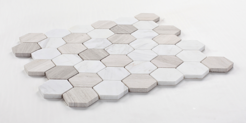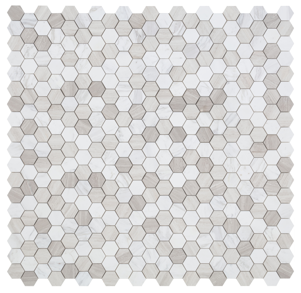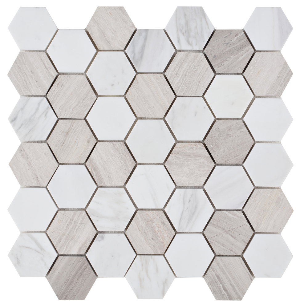 Product Sold By The SheetHexagon Series: Hexagon LoftWhite Volakas Mixed with Haisa Marble in 2×2 Hexagon Shape 11.75×11.75. This Mosaic comes in a Honed finish.Suggested Grout Color: Bostik Trucolor White H152WARNING: This product can expose you to chemicals including crystalline silica (airborne particles of respirable size) in dust created during fabrication/installation if the product is dry cut/ground or pulverized, which are known to the State of California to cause cancer. For more information, go to https://www.p65warnings.ca.gov/.