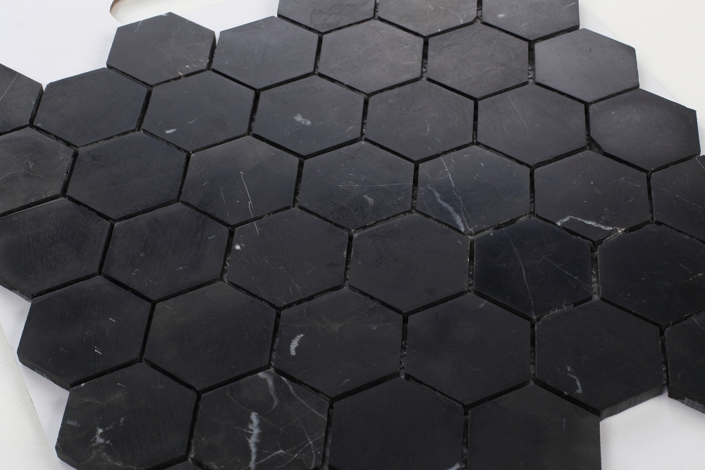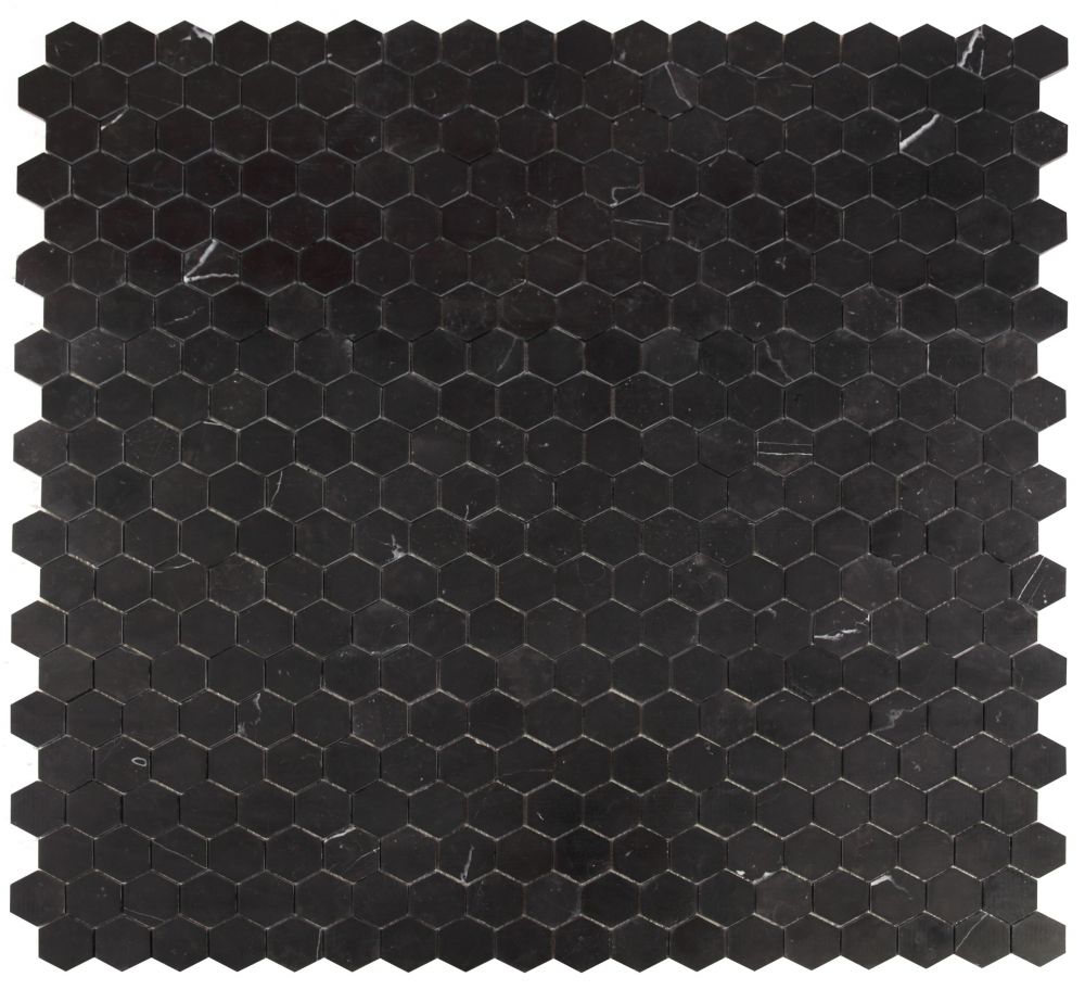 Product Sold By The SheetHexagon Marquina Honed 2×2 – Nero Marquina Marble, cut into hexagon pieces to form beautiful all-black mosaic.Suggested Grout Color: Bostik Dimension Onyx H680WARNING: This product can expose you to chemicals including crystalline silica (airborne particles of respirable size) in dust created during fabrication/installation if the product is dry cut/ground or pulverized, which are known to the State of California to cause cancer. For more information, go to https://www.p65warnings.ca.gov/.