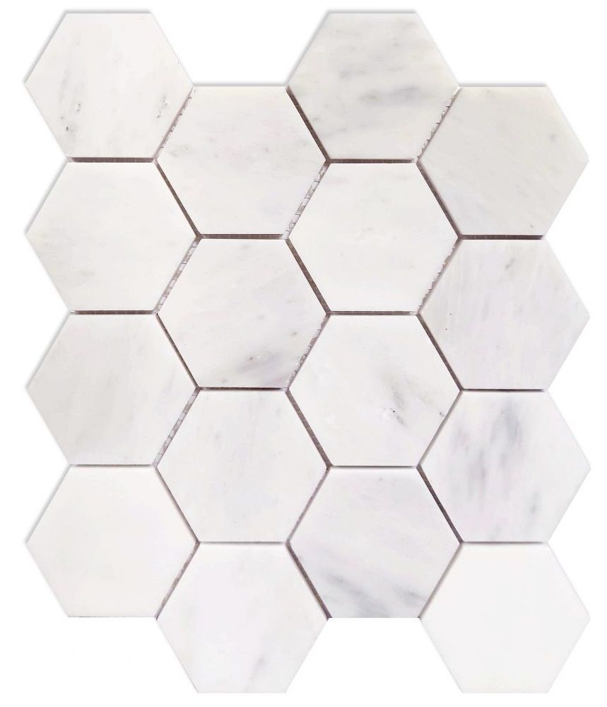 Product Sold By The SheetHexagon Snow White Polished 3×3 – Full sheet size: 10.25×11.75. Asian White marble mosaic in 3×3 hexagon pieces.Suggested Grout Color: Bostik Trucolor White H152WARNING: This product can expose you to chemicals including crystalline silica (airborne particles of respirable size) in dust created during fabrication/installation if the product is dry cut/ground or pulverized, which are known to the State of California to cause cancer. For more information, go to https://www.p65warnings.ca.gov/.