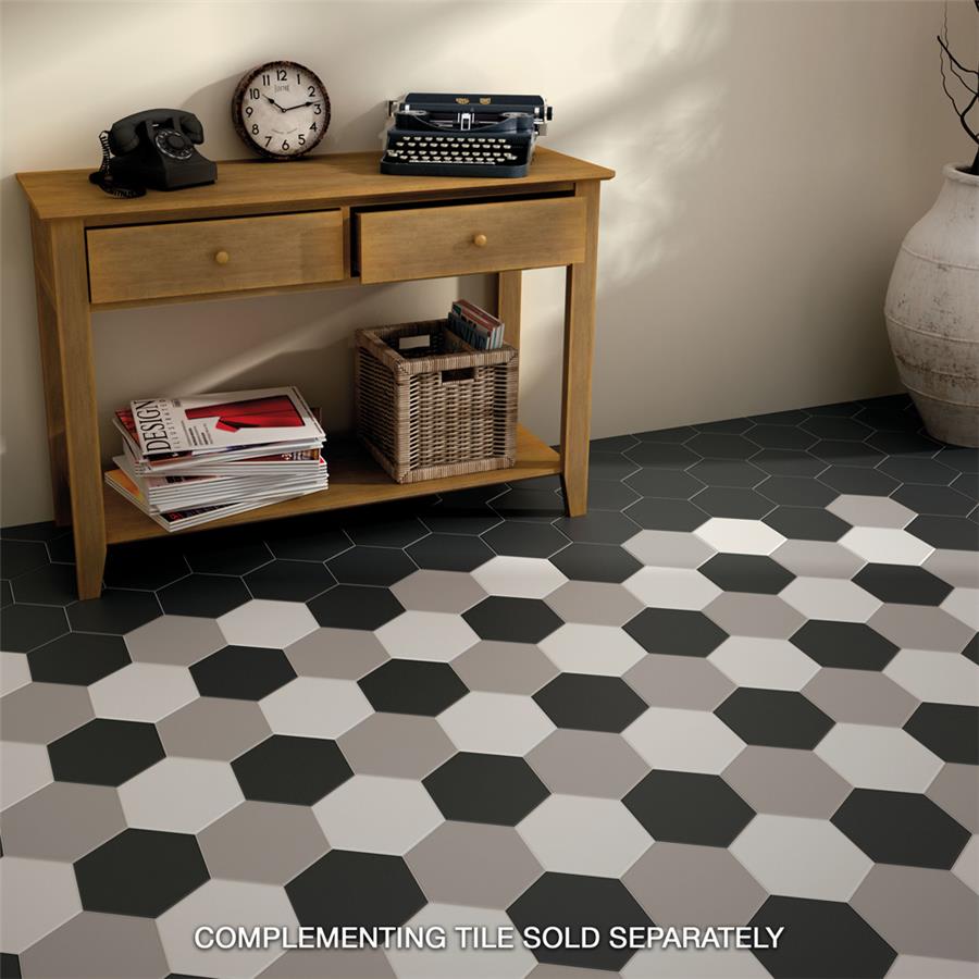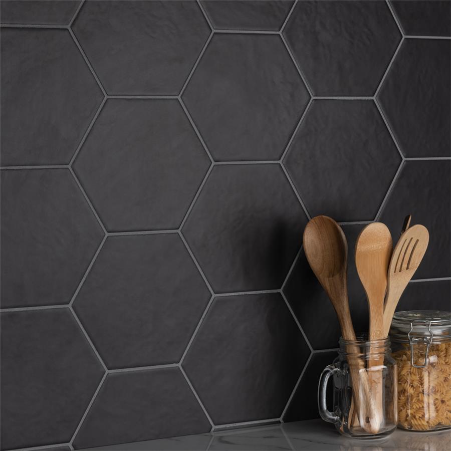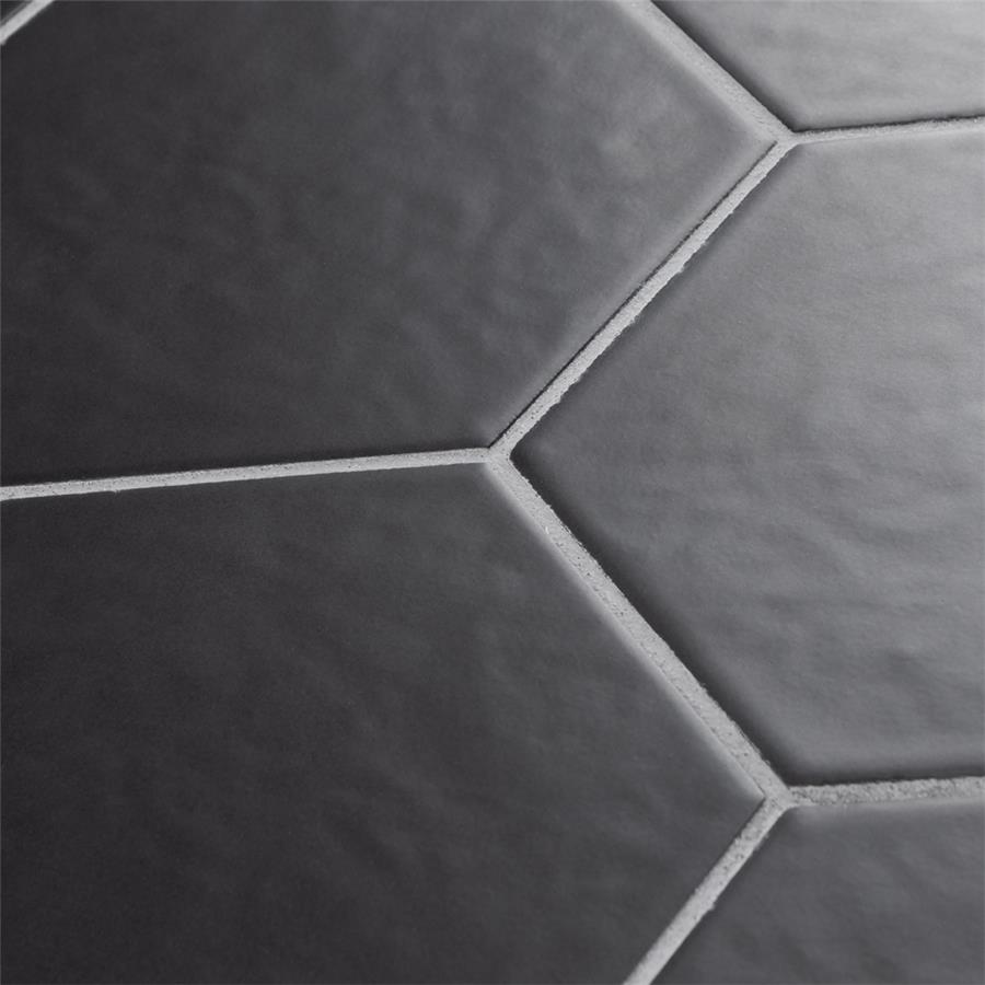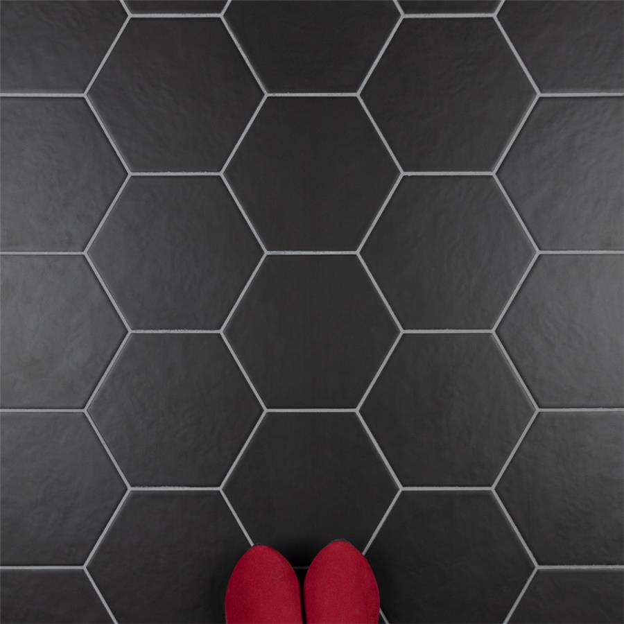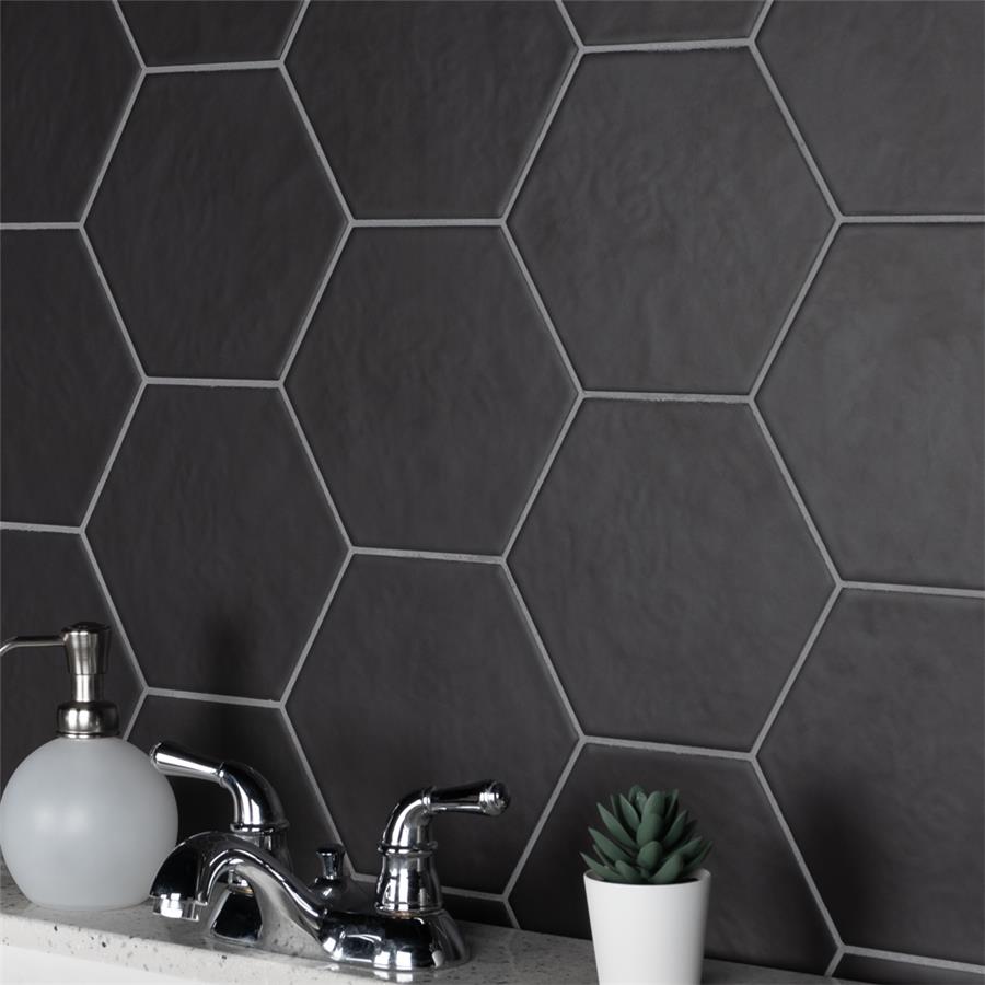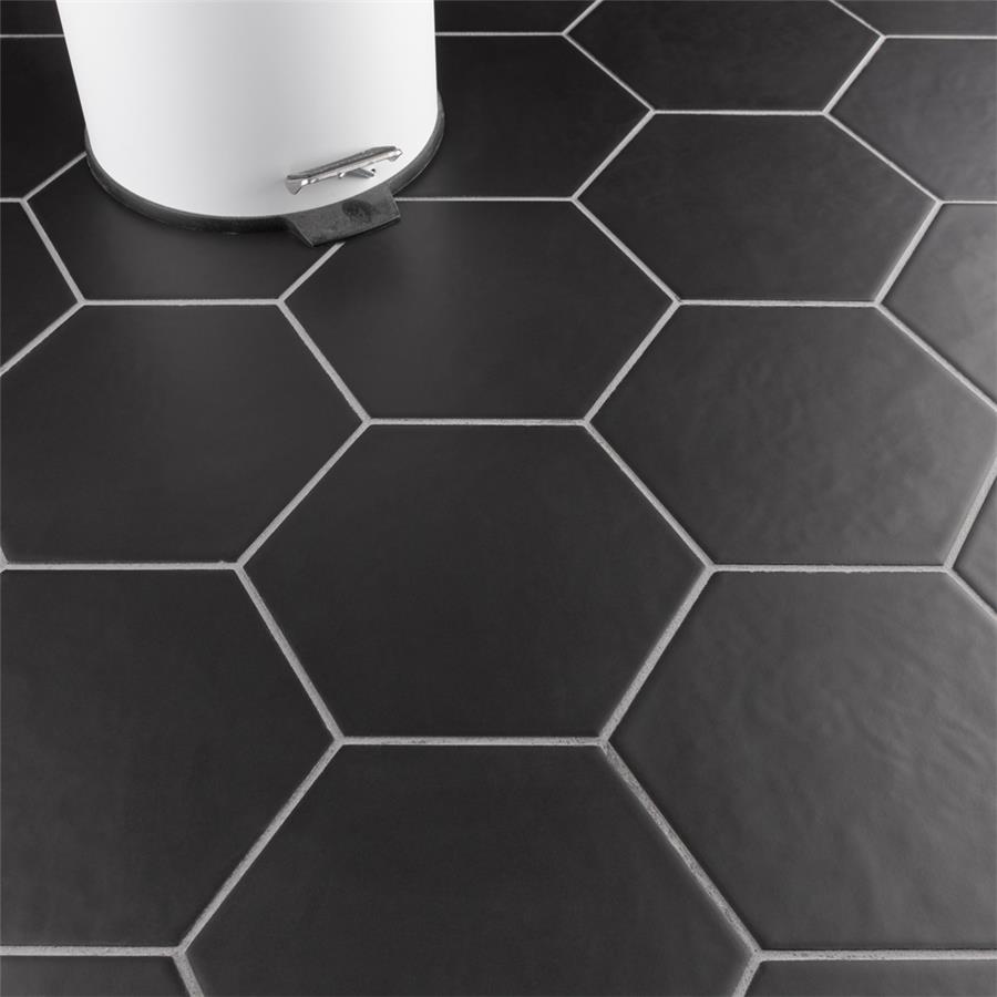 Our Hexatile Matte Nero 7 in. x 8 in. Porcelain Floor and Wall Tile features a smooth, matte finish. This black hexagon shaped tile is perfect for any setting, traditional enough for historical renovations or modern enough for new construction. Its impervious and frost-resistant features make this an ideal choice for indoor and outdoor installations including, backsplashes, bathrooms and patios. This tile may be used on its own or coordinated with other products in our Hexatile Collection for a custom look. Tile is the better choice for your space. This tile is made from natural ingredients, making it a healthy choice as it is free from allergens, VOCs, formaldehyde and PVC.Try out our grout test below to determine which grout color suits your design preferences.