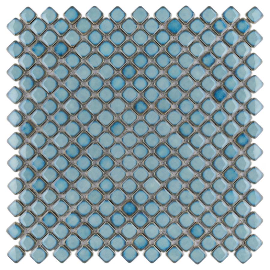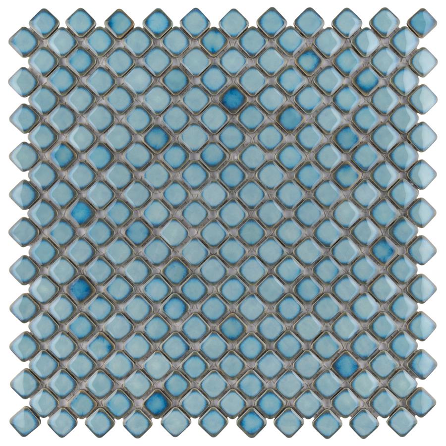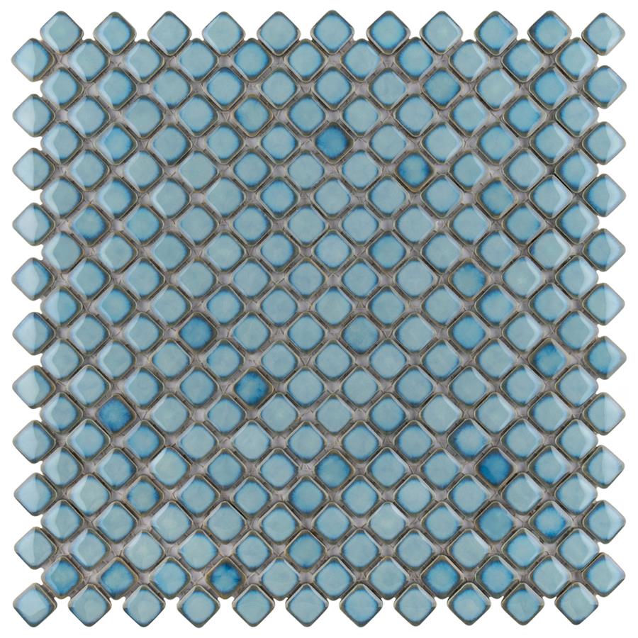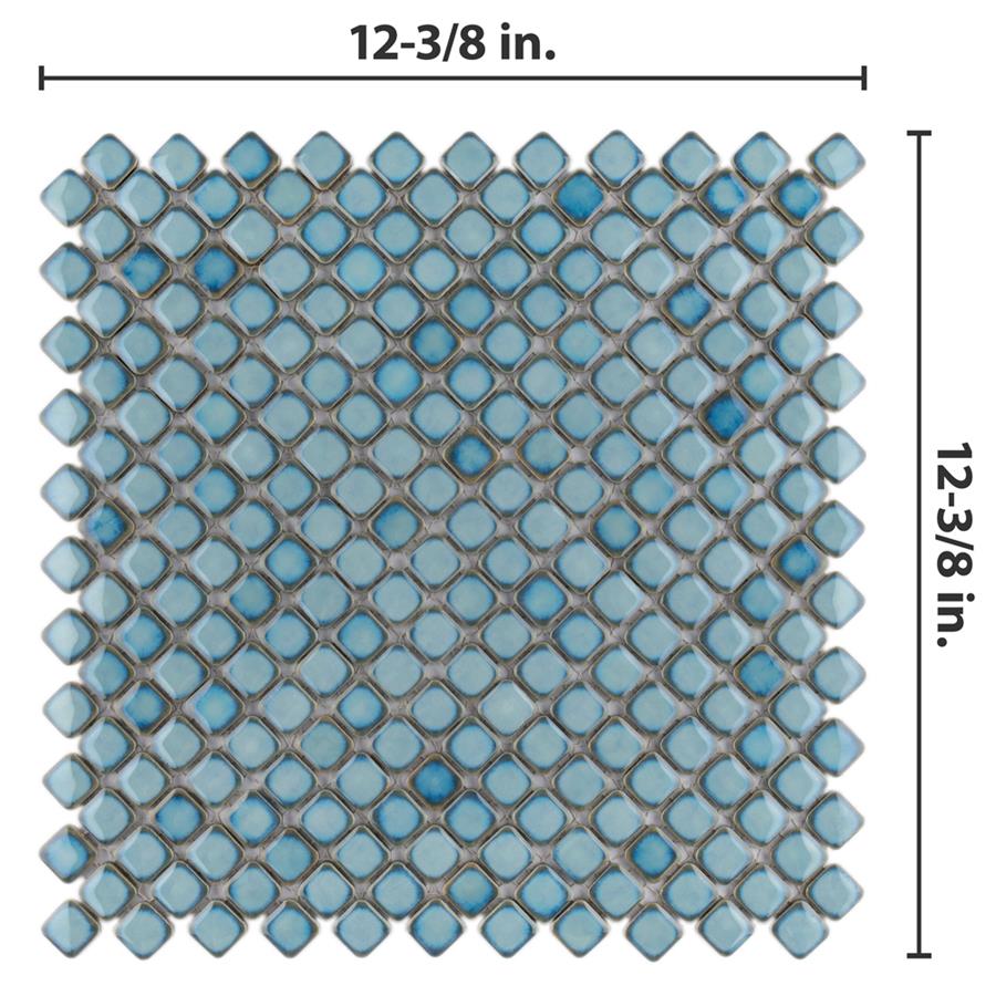 The SomerTile Hudson Diamond Marine 12-3/8 in. x 12-3/8 in. x 5 mm Porcelain Mosaic Tile offers a beautifully tranquil update on the timeless diamond design. This tile features a reactive glaze that creates variably blue tones in the center mixed with creamy shades on the edge. The end effect is a pleasing mixture of sky-blue tints with additional dimension added by the high-gloss finish. Impervious, frost-resistant and easy to clean, this tile is a perfect choice on its own or coordinated with other colors in our Hudson Diamond series.