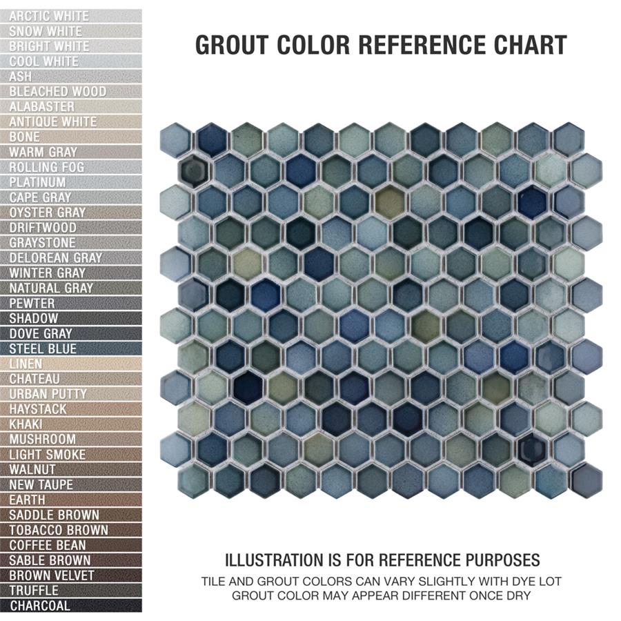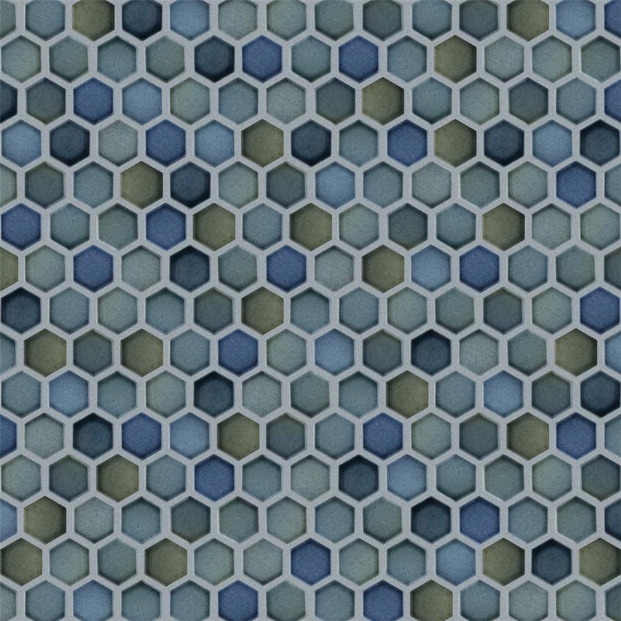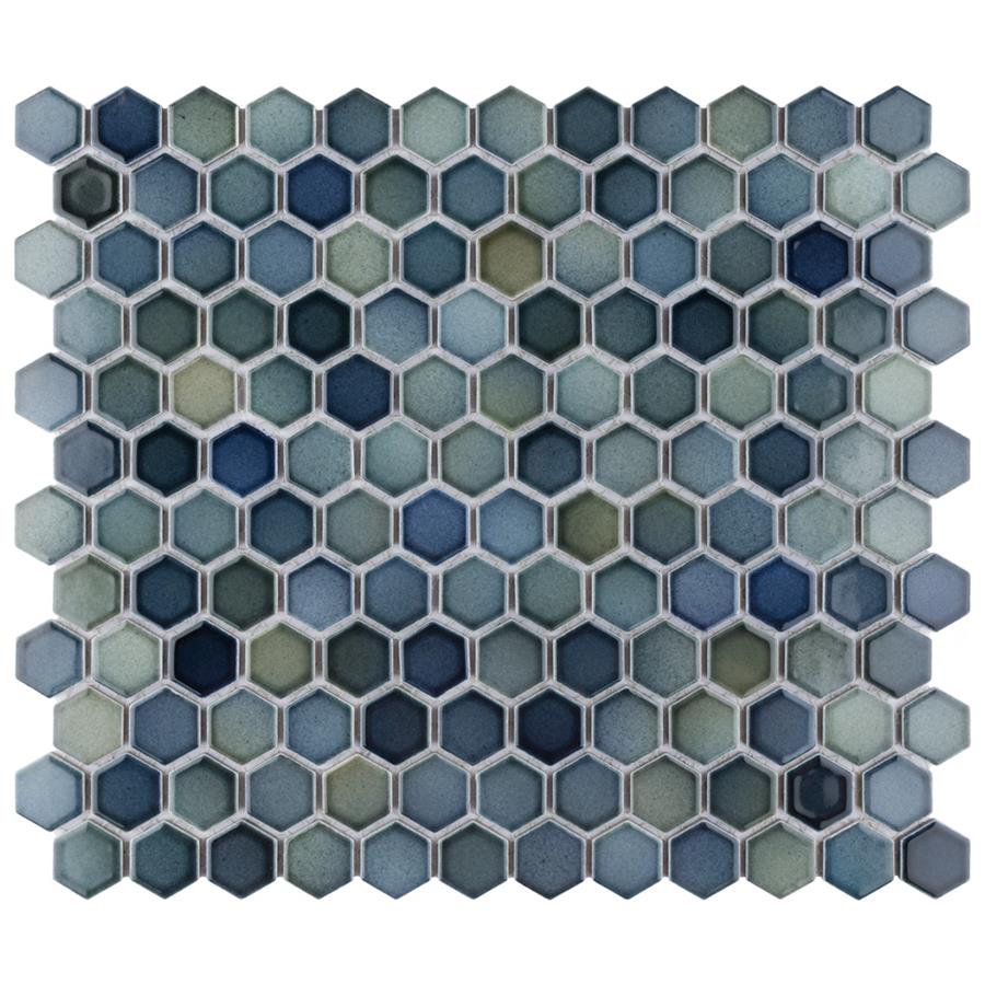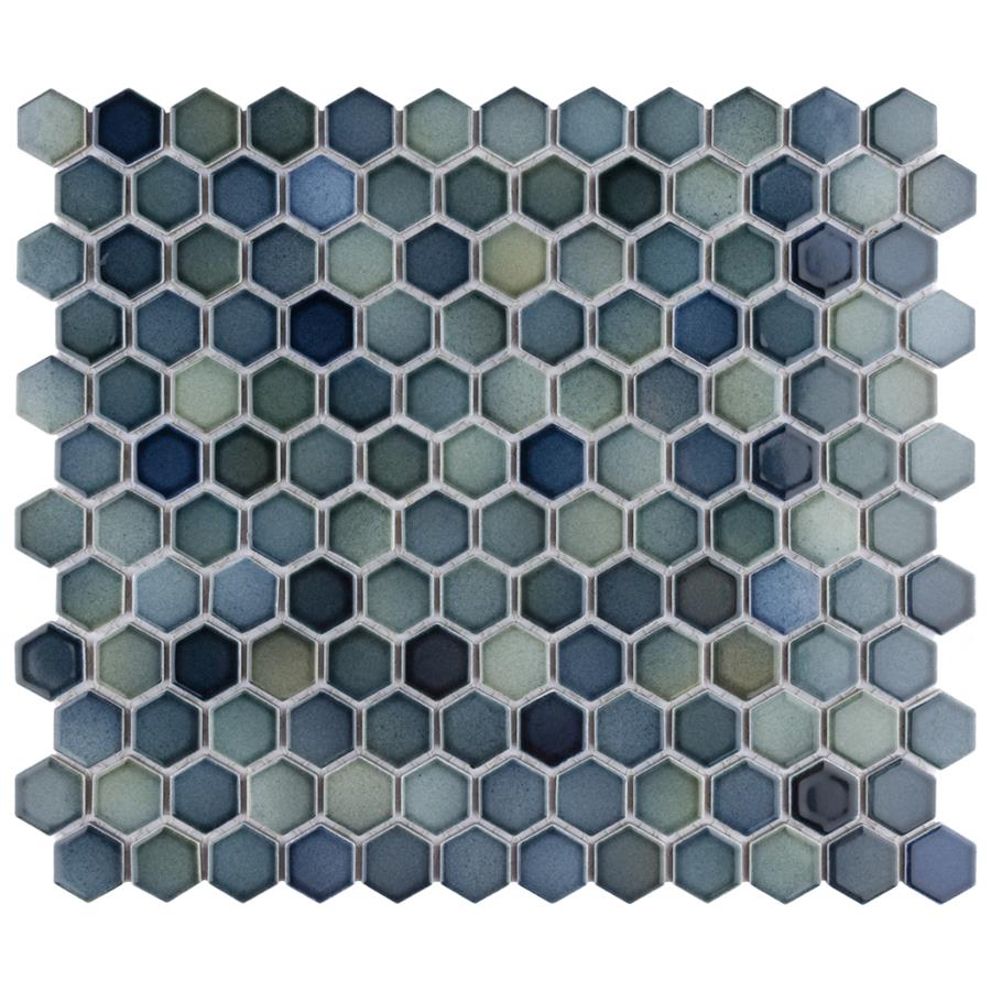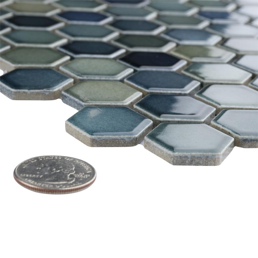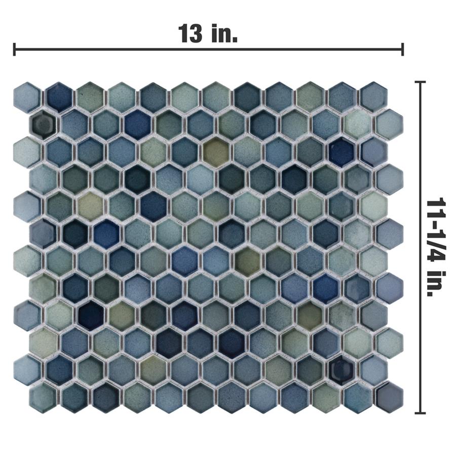 Our Hudson Hex 1” Atlantis 11-7/8” x 13-1/4” Porcelain Floor and Wall Mosaic Tile brings creativity and personality to any space through timeless yet trendsetting geometric design. With subtle variations in color tone that gradually get darker around the border, each piece is truly unique. Its rich reactive glaze echoes sea green, ocean blue and beige hues with a high glossy finish that is unique yet simplistic enough to integrate into any design, ranging from traditional style renovations to modern home projects. Its impervious and frost-resistant features make it an ideal choice for indoor and outdoor installations including kitchens backsplashes, bathroom showers, powder rooms, and fireplace facades. This porcelain mosaic floor and wall tile can be used as a whole sheet or cut into smaller strips as an accent piece. It is a perfect choice on its own or coordinated with other colors in our Hudson 1 in. Hex series. Please note, the unique reactive glazing technique creates a stunning one-of-a-kind effect and may cause high variation between dye lots. Tile is the better choice for your space. This tile is made from natural ingredients, making it a healthy choice as it is free from allergens, VOCs, formaldehyde, and PVC.